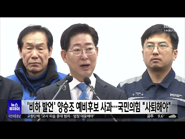 뉴스투데이 뉴스데스크뉴스투데이뉴스데스크 VOD(전체 다시보기)뉴스투데이 VOD(전체 다시보기)유튜브뉴스페이스북 뉴스카카오톡 뉴스인스타그램 뉴스정정 및 반론보도 모음 prev 2026.4.14 - 화요일 [리포트]탈출 늑대 '늑구' 발견..소방당국, 생포 위해 대치 중 ◀ 앵 커 ▶대전 오월드를 탈출한 늑대 '늑구'가 발견됐다는 신고가 접수돼현재 소방당국이 생포 작전을 벌이고있습니다.오월드에서 직선 거리로 1.8km 떨어진 곳이었는데, 신고자는 "늑구가 힘이 빠지고몹... 이혜현 '행정수도 특별법' 내일 국토위 법안소위 상정..처리 여부 불투명 '행정수도 세종'의 법적 근거가 될 행정수도 특별법이오늘 국회 국토교통위원회의법안심사소위원회에 재상정됐지만,또다시 뒷순위로 밀려 처리 여부가여전히 불투명합니다.행정수도 특별법은, 상정된 45개... 이승섭 "신계룡-북천안 송전선로 노선 심의 중단"⋯회의 무산 신계룡-북천안 송전선로 건설과관련해 충청권 주민 100여 명과입지선정위원들이, 노선 심의 중단을 촉구했습니다.이들은 제11차 입지선정회의가열린 대전컨벤션센터 앞에서 반대 집회를 열고, "입지선정위... 김성국 [리포트]민주당 허태정 확정..대전시장 선거 '리턴매치' ◀ 앵 커 ▶더불어민주당이 대전시장 선거에나설 후보로, 허태정 전 대전시장을확정했습니다.이로써 대전시장 선거는, 민주당허태정 후보와 국민의힘 이장우 시장, 개혁신당 강희린 후보의3파전이 펼쳐지게 ... 이승섭 [리포트]민주당 세종시장 경선 토론회 ◀ 앵 커 ▶더불어민주당 세종시장 경선 후보들이 오늘 시작되는 결선 투표를 앞두고 대전MBC에서 열린 합동 토론회에서 맞붙었습니다.경선 탈락 후보들과 정책 연대에 나선이춘희 후보는 경험을, 조상호 후... 문은선 '비하 발언' 양승조 예비후보 사과⋯국민의힘 "사퇴해야" 양승조 더불어민주당 충남지사경선 후보가, 지난달 논산딸기축제 현장에서 유세 도중 관광객에게 비속어를 사용한 데대해, 공식 사과했습니다.양 후보는 자신의 SNS에,"당시 '민주당을 지지하지 않는다'는... 문은선 '에너지 위기' 대전시, 다리 야간 조명 "일시 중단" 대전시가 중동 사태로 인한 에너지 위기 상황에 대응하기 위해,주요 다리의 야간 경관시설 운영을일시 중단합니다.이에 따라 갑천과 유등천, 대전천 등 3대 하천의 13개 다리에서 운영 중인 야간 조명 운... 문은선 대전 시내버스 재정지원에도 수송분담률 '하락' 대전 시내버스에 대한 재정지원은늘었는데, 수송 분담률은 오히려 떨어진 것으로 나타났습니다.대전 경실련이 대전시 준공영제운영 실태를 점검한 결과, 지난2024년 운송 수입은 천 548억 원으로 코로나19... 문은선 [리포트]고교생이 교사에 흉기 휘둘러⋯"중학교 때부터 갈등" ◀ 앵 커 ▶어제 오전 계룡의 한 고등학교에서, 학생이 30대 교사에게흉기를 휘둘러 경찰에 긴급 체포됐습니다.미리 준비한 흉기를 가지고 등교한 뒤, 해당 교사와 개별 면담을신청하고 범행을 저질렀는데,... 전효정 교원단체 "교사 피습 중대 범죄⋯엄정 대응해야" 계룡의 한 고등학교에서 발생한 교사 피습 사건과 관련해,교원단체가 잇따라 엄벌과 대책 마련을 촉구했습니다.충남교사노조는 성명을 내고,"이번 사건은 단순한 교권 침해를 넘어, 교사의 생명을 위협하... 전효정 김희곤 독립기념관장 취임⋯"기념관 설립 정신 초심 지킬 것" 김희곤 신임 독립기념관장이 취임식을 갖고, 3년간의 임기를시작했습니다.김 관장은 취임사를 통해,"기념관 설립 정신의 초심을지키고 독립운동의 세계사적 가치를확립하겠다"며, "연구·전시·교육을활성화... 이교선 "광역의원 2명 유지" 서천군민 1만여 명 서명 정치권 전달 서천군이 광역의원 정수 2명 유지를 요구하는 만 6천여 명의군민 서명부와 건의문을,국민의힘 장동혁 대표를 비롯한 여야 주요 정당과 국회에 전달했습니다.서명운동에는 군민 만 6천 761명이 참여했으며,... 이교선 '타율 0.145' 부진 한화이글스 노시환 2군행 프로야구 개막 이후 극도의부진에 빠진 한화이글스의 내야수노시환이, 결국 2군으로 내려갔습니다.노시환은 올 시즌 13경기에 출전해 타율은 1할 4푼 5리에그쳤고, 볼넷 5개를 얻는 동안삼진은 21개나 당... 이승섭 [리포트]'아동 방치' 언어치료사 CCTV 공개⋯"휴대폰 삼매경에 드라마 시청" ◀ 앵 커 ▶장애 아동의 치료와 재활을 위한 대전 공공어린이재활병원에서,언어치료사가 치료해야 할 아이들을방치했다는 소식 최근 전해드렸는데요.당시 CCTV 영상이 공개됐는데,의자에 아이 몸을 고정한 ... 김성국 세종 제지공장 사망 사고 유족, 임원 등 책임자 고소 지난달 세종의 한 제지공장에서 30대 노동자가 추락해 숨진 사고와 관련해, 유족과 노조 측이 경찰과 노동당국에, 임원 등 책임자9명을 엄벌해 달라며고소·고발장을 접수했습니다.이에 따라 세종경찰청은,... 김성국 세종선관위, 선거구민에 선물 제공한 시의원 예비후보 고발 세종시 선거관리위원회가,지방선거를 앞두고 선거구민에게선물을 제공한 혐의로, 시의원 선거 예비 후보자를 대전지방검찰청에 고발했습니다.해당 예비후보는 지난달 당내경선 과정에서, 후보자로 선출되... 이승섭 KA