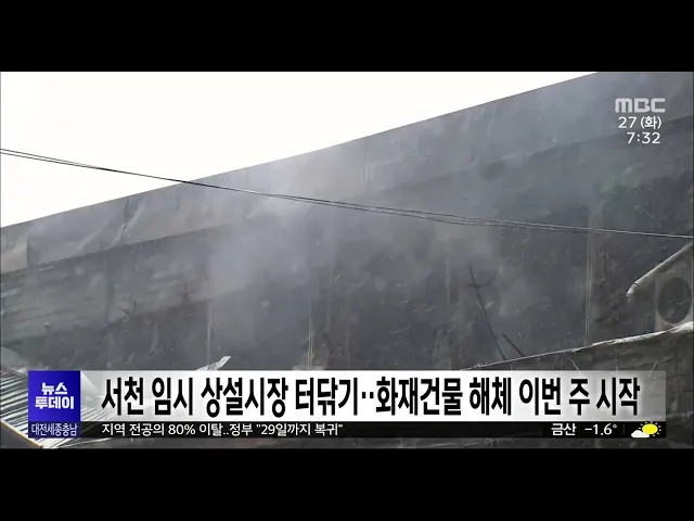 뉴스투데이 뉴스데스크뉴스투데이뉴스데스크 VOD(전체 다시보기)뉴스투데이 VOD(전체 다시보기)유튜브뉴스페이스북 뉴스카카오톡 뉴스인스타그램 뉴스 prev 2024.2.27 - 화요일 next '류현진 효과' 한화가 달라졌다/투데이 ◀ 앵 커 ▶12년 만에 친정팀으로 돌아온 괴물 투수 류현진이 일본 오키나와 스프링캠프에 합류한 지 닷새째를 맞고 있습니다.류현진의 합류로 팀 분위기까지 후끈 달아오르면서 한화이글스의 변화가감지되... 뉴스팀 세종시 공동캠퍼스에 올 하반기 첫 대학 개교 올해, 세종시 행정중심복합도시에 첫 대학이 개교합니다.임대형 캠퍼스에는 한밭대 AI·ICT 계열 대학과 대학원, 서울대 행정대학원, KDI 국제정책대학원, 충남대 의대·대학원 등이 오는 2학기 개강을 앞두... 문은선 민주당 세종시의원 "인사청문회 없는 문화재단 대표 임명 유감" 세종시의회 이순열 의장을 비롯한더불어민주당 소속 의원들이 기자회견을 열고시가 박영국 문화재단 대표이사를 인사청문회 없이 임명한 데 대해 유감을 표시했습니다.의원들은 청문회는 산하 기관장의자... 고병권 본선 대진표 윤곽/투데이 ◀ 앵커 ▶4.10 국회의원 총선거가 40여 일 앞으로다가오면서 여야 본선 대진표도 윤곽이드러나고 있습니다.더불어민주당에서는 황운하 의원이 불출마선언을 했고, 국민의힘은 장동혁 사무총장이당내 경선... 고병권 김광신 전 청장, 재산 축소 신고 혐의 추가 기소 공직선거법을 위반한 혐의로 대법원에서 유죄 판결을 받아 구청장 직을 잃은김광신 전 대전 중구청장이 지방선거 당시재산을 축소해 신고한 혐의로 추가 기소됐습니다.대전고법은 대전시선관위가 토지 매... 이승섭 서산시, 취약계층에 난방비 10만 원씩 지원 서산시가 기초생활수급자 3천8백여 가구에난방비 10만 원씩을 지원합니다.지원금은 별도 신청을 하지 않아도기존 수급 계좌로 이달 중 지급하며 계좌 이용이 안 되는 경우 행정복지센터에서 서산사랑상품... 문은선 태안 갯벌에서 상괭이 발견..1시간 만에 죽어 지난 24일 오전, 태안군 근흥면의 갯벌에서 멸종위기종인 토종 고래 상괭이 한 마리가 발견돼 경찰에 구조됐지만,한 시간 만에 죽었습니다.태안해경은 길이 1.7m 가량의 상괭이를 구조해응급처치를 했지만... 이승섭 충남 교통사고 사망자의 56.6%가 노인 충남도내 교통 사망 사고 피해자의 절반 이상이 노인인 것으로 나타났습니다.충남도 자치경찰위원회는지난해 교통사고 사망자 203명 중 65살 이상 노인이 115명으로 56%에 달하는 것으로 집계했습니다.도 ... 김광연 대전시, 봄 행락철 맞아 전세버스 780대 일제 점검 대전시가 봄 행락철을 맞아지역 33개 업체 전세버스 780대에 대해안전 점검을 벌입니다.점검 대상은 속도제한장치, 운행기록계, 차로 이탈 경보 장치 등과 불법 구조 변경, 소화기 관리 상태 등입니다.시... 고병권 서산서 민생토론회..지역 현안 힘 실리나/투데이 ◀ 앵 커 ▶서산에서 열린 민생토론회에서윤석열 대통령이 충남을 실리콘밸리에버금가는 첨단 산업기지로 만들겠다고약속했습니다.특히 천안, 홍성, 논산에 조성 중인국가산단과 당진 기업혁신파크 조성을적... 김광연 서천 임시 상설시장 터닦기…화재건물 해체 이번 주 시작 대형화재가 났던 서천 특화시장 복구작업이본격 시작됐습니다.오는 4월 광어·도미 축제 전까지 들어설임시 상설시장을 만들기 위해 서천특화시장서쪽 주차장에선 터닦기 공사가 한창입니다.또 불이 난 수... 문은선 '통계 조작 의혹' 전 국토부 차관 등 2명 영장 또 기각 문재인 정부 당시 국가 통계 조작에 가담한 혐의를 받는 윤성원 전 국토교통부 1차관과이문기 전 행정중심복합도시건설청장에 대한구속영장이 법원에서 또 기각됐습니다.대전지법은 어제 열린 영장실질심... 이승섭 이송 지연되다 응급 환자 사망/투데이 ◀ 앵 커 ▶정부의 의과대학 정원 확대에 반발해지역 전공의가 대거 병원을 떠난 지 일주일이 지났습니다.대전에서는 80대 응급 환자가 이송 병원을 찾던 도중에 숨지는 일이 벌어졌습니다.정부는 대전에 위... 이승섭 오는 29일부터 급행 간선버스 B1 노선 요금 300원 인상 대전시가 운행하는 BRT 급행 간선버스 B1 노선 요금이 300원 오릅니다.대전시는 오는 29일부터 운행 노선에 따라각각 1,700원~2300원까지인 B1 요금을 각각 300원씩 인상합니다.현재 운행 중인 BRT 6개 노... 고병권 다음 달부터 대전서 온라인 게임 대회 잇따라 개최 대전에서 e스포츠 대표종목인 '배틀그라운드 모바일' 프로시리즈와 '이터널 리턴' 정규시즌 경기가 다음 달부터 잇따라 열립니다.대전 이스포츠 전용경기장에선배틀그라운드 12경기, 이터널 리턴 7경기 등... 고병권