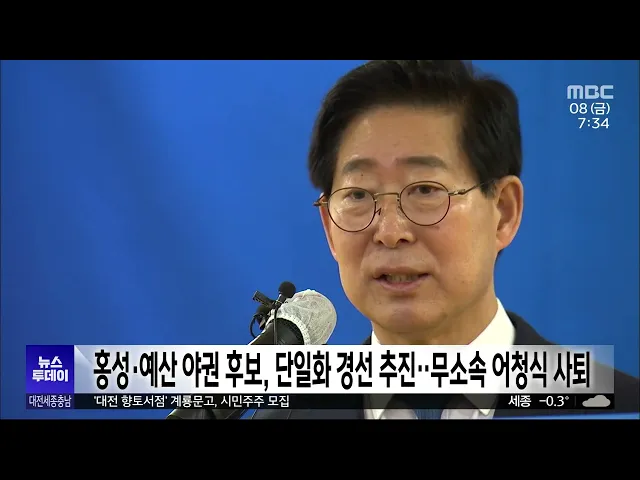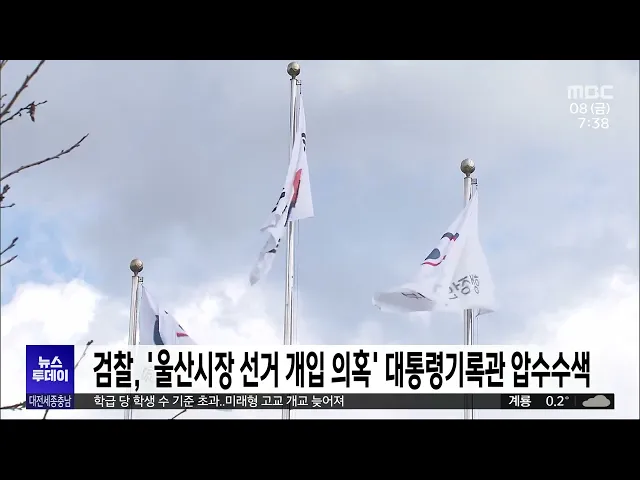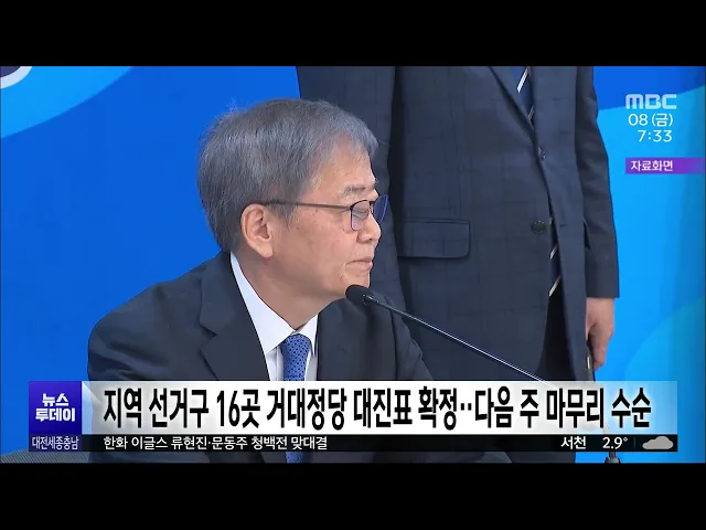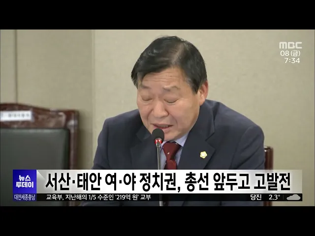 뉴스투데이 뉴스데스크뉴스투데이뉴스데스크 VOD(전체 다시보기)뉴스투데이 VOD(전체 다시보기)유튜브뉴스페이스북 뉴스카카오톡 뉴스인스타그램 뉴스 prev 2024.3.8 - 금요일 next 보정액 대폭 줄어..세종시교육청 반발/투데이 ◀ 앵 커 ▶정부는 세종시의 정착과 발전을 위해세종시교육청에 해마다 부족한 재정을 채워주는보통교부금 보정액을 교부하고 있습니다.그런데, 세종시교육청에 올해 배정된 보정액이지난해의 1/5 수준으로 ... 뉴스팀 지역 선거구 16곳 대진표 확정..다음 주 마무리 수순 대전과 세종, 충남 20곳의 선거구 가운데16곳에서 여야 거대정당 대진표가 확정된 가운데 늦어도 다음 주까지는 나머지 4곳의 후보도 결정될 전망입니다.지금까지 대진표가 완성되지 않은지역은 대전 중구... 고병권 홍성·예산 야권 총선후보, 단일화 경선 추진 총선을 한 달여 앞두고 홍성·예산지역더불어민주당과 진보당 후보들이 경선을 통해 야권 후보 단일화에 나서기로 했습니다.이번 단일화는 지난달 21일민주당과 진보당이 합의한 데 따른 것으로민주당 양승... 김태욱 서산·태안 여·야 정치권, 총선 앞두고 고발전 총선을 한 달여 앞두고 서산·태안지역여·야 정치권이 고발전을 이어가는 등 과열 양상을 보이고 있습니다. 더불어민주당 조한기 예비후보 캠프는지난 3일 서산장학재단 장학금 전달식에서'4월 10일 압도적... 김태욱 수용할 땅인데.. 철거명령부터 내려/투데이 ◀ 앵 커 ▶내포역이 신설되는 예산군 삽교읍 일대에는 오는 2028년과 2030년까지 내포농생명그린바이오클러스터와 미니신도시가 각각 들어설 예정인데요. 대규모 개발을 추진 중인 예산군이 토지 수용지역... 문은선 검찰, '울산시장 선거 개입 의혹' 대통령기록관 압수수색 지난 2018년 지방선거 당시청와대의 울산시장 선거 개입 의혹을다시 수사하는 검찰이 어제, 세종시에 있는 대통령기록관을 압수수색했습니다.서울중앙지검 공공수사2부는 재수사 대상인 임종석 전 대통령 ... 이승섭 관세청, 캄보디아와 공조로 마약 밀수입 적발 관세청이 캄보디아 관세총국과 공조해국내로 밀수입하려던 마약 2kg을 적발하고밀수를 시도한 한국인 두 명을 현지 프놈텐공항에서 체포했습니다.최근 캄보디아에서 밀수입되는 마약량이 급증하면서 여행... 박선진 檢, '성범죄 방조' JMS 간부에 중형 구형 검찰이 기독교복음선교회 총재 정명석 씨의성범죄를 도운 혐의로 재판에 넘겨진 JMS 간부 김지선 씨에 대한 항소심에서도 중형을 구형했습니다.검찰은 대전고법 제1형사부 심리로 열린결심 공판에서 김 씨... 이승섭 수년 째 침전물 방류?..주민 피해 호소/투데이 ◀ 앵 커 ▶금산의 한 마을 주민들이 주변 하천에 뿌연 침전물이 떠 있다고저희 MBC에 제보를 해주셨습니다.해당 지역에서는 여러 해 동안 침전물이 꾸준히 발견됐는데, 5년 전에 마을 옆에 들어선 석산 개... 뉴스팀 공군 20전비, 12일부터 사흘간 야간 전투기 출격 공군 제20전투비행단이 오는 12일부터 사흘 동안 전투기 야간 출격 훈련을 앞두고서산·태안지역 주민들에게 소음 발생에 대해양해를 구했습니다.20전투비행단측은 이번 야간 출격이 지휘소 연습과 기지 방... 김태욱 지난겨울 강수량 역대 1위...강수일수·평균 기온 2위 지난겨울, 대전과 세종, 충남 지역은기상 관측 이래 가장 많은 비가 내렸고 역대 두 번째로 평균 기온이 높았던 것으로 기록됐습니다.지난겨울 우리 지역에 내린 비의 양은 평년 강수량의 3배에 가까운 26... 이승섭 한화 이글스 류현진·문동주 청백전 맞대결 프로야구 한화 이글스로 돌아온 류현진 선수가국내 복귀 후 처음으로 등판한 자체 청백전에서국가대표 선발 투수로 성장한 문동주와맞대결을 펼쳤습니다.류현진은 어제, 대전 한화생명 이글스 파크에서 열... 이승섭 한국은거래소 소비자 피해 주의보/투데이 ◀ 앵 커 ▶지난해 말 한국소비자원은 한국은거래소 관련 피해 신고가 급증하자 소비자 피해 주의보를 발령했습니다.하지만 올 들어서도 관련 피해가 잇따르고 있습니다.김광연 기자가 보도합니다.◀ 리포트 ... 문은선