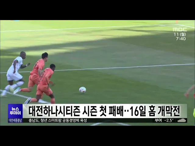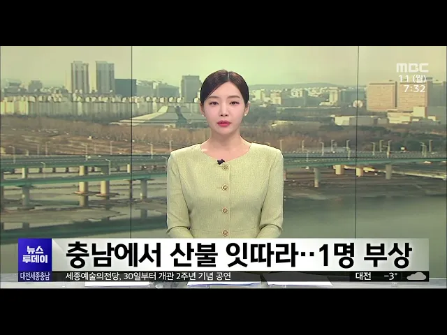 뉴스투데이 뉴스데스크뉴스투데이뉴스데스크 VOD(전체 다시보기)뉴스투데이 VOD(전체 다시보기)유튜브뉴스페이스북 뉴스카카오톡 뉴스인스타그램 뉴스 prev 2024.3.11 - 월요일 next 겨울철새의 천국 '천수만'/투데이 ◀ 앵 커 ▶매년 겨울이면 서산 천수만 일대는겨울철새들로 장관을 이룹니다.특히 올해는 전 세계 국제보호종인 흑두루미의 70%가 이곳을 찾은 것으로확인됐는데 오랜 기간 철새들이 찾아머물 수 있게 정부... 김태욱 부주의로 인한 산불 잇따라..주민 1명 화상 입기도 어제 오후 3시쯤 금산군 진산면의한 비닐하우스에서 시작된 불이인근 야산으로 옮겨붙어 주민 한 명이다쳤습니다.어제 오후 2시 40분쯤에는 공주시 정안면의 한 야산에서 낙엽을 태우다가 불이 나한 시간 ... 김광연 충남 화재 30% 봄철에 집중..원인 절반은 '부주의' 충남에서 발생한 화재의 30%는 봄에 집중됐고,화재 원인의 절반 이상은 부주의로 나타났습니다.충남소방본부는 최근 5년 동안 충남에서 발생한화재 만 4백여 건 가운데 3월부터 5월 사이에발생한 화재가 3... 김광연 여야, 중원 표심 잡기 본격화..오늘 이재명 충남행 제22대 국회의원 총선거가 한 달 앞으로 다가온 가운데 여야 지도부가역대 선거의 캐스팅보트 역할을 해온중원 표심을 잡는 데 주력하고 있습니다.이른바 '윤석열 정권 심판 벨트 지역구'를돌고 있는 이재... 이승섭 '아산 새마을금고 강도' 50대 남성 구속 아산의 한 새마을금고에서 강도 행각을 벌여1억여 원을 빼앗아 달아났다가 경찰에 검거된50대 남성이 구속됐습니다.대전지법 천안지원은 어제 오후에 진행한 영장실질심사에서 도주의 우려가 있다고 보고 ... 김광연 대전하나시티즌 시즌 첫 패배..16일 홈 개막전 K리그1 대전하나시티즌이 어제,제주월드컵경기장에서 열린 제주와의 2라운드경기에서 1대3으로 져 시즌 첫 패배를 안았습니다.개막 이후 두 경기에서 1무 1패로 승점 1점을 기록한 대전은 오는 16일, 대전... 이승섭 삼성디스플레이, 8.6세대 IT OLED 투자 본격화 삼성디스플레이가 4조 원을 들여 아산캠퍼스에 세계 최초로 구축하기로 한 8.6세대 IT 유기발광다이오드, 즉 OLED 전용 라인 투자를 본격화합니다.삼성디스플레이는 최근 신규 라인 내 클린룸 공사를 마무... 김광연 충남도, 청년 스마트팜 공동경영체 육성 충남도는 스마트팜을 운영하는 법인을 대상으로 청년 스마트팜 공동경영체 육성 사업 대상자를 모집합니다.도는 법인 구성원 가운데 18살에서 39살 청년이 절반 이상이고, 1년 이상 운영된 법인을 대상으... 김광연 세종시, 공영자전거 '어울링' 관리 강화 세종시가 공영자전거 '어울링'의 이용객이늘면서 자전거 재배치 요원과 콜센터 상담원을증원하고 상담 챗봇을 도입합니다.시는 자전거를 재배치하는 현장 인력과민원에 대응하는 상담원을 각각 두 배 늘리... 김광연 세종시, 청소년 활동 지원 '꿈끼카드' 발급 세종시가 이달 말부터 청소년에게 진로와 직업, 문화와 예술 등 다양한 체험 활동에 사용할 수 있는 '꿈끼카드'를 발급합니다.이 카드는 연간 10만 원 한도의충전식 포인트 카드로, 관련 분야의 가맹점 26... 이승섭 세종예술의전당서 오는 30∼31일 '스타인웨이 위너 페스티벌' 세종시문화관광재단이 세종예술의전당 개관 2주년을 맞아 오는 30일부터 이틀 동안'스타인웨이 위너 페스티벌'을 개최합니다.이번 공연은 세계적인 피아노 콩쿠르에서 우승한 국내외 유명 피아니스트들이 ... 이승섭 서산시, 군복무 청년 상해보험 최대 5천만 원 보장 서산시가 군 복무 중인 지역 청년을 위한상해보험 최대 보장액을 지난해보다 천만 원 많은 5천만 원으로 늘렸습니다.대상은 서산에 주민등록을 두고 복무 중인현역과 기초군사훈련 중인 보충역으로 복무 ... 이승섭 당진시, 신학기 맞아 집단급식소 합동점검 실시 당진시가 신학기를 맞아 오는 19일까지학교와 유치원 등 집단 급식소 33곳에 대한 합동점검을 실시합니다.시는 당진교육지원청과 합동점검반을 구성해급식 시설의 위생 상태와 식재료 보관 관리, 조리 종... 이승섭