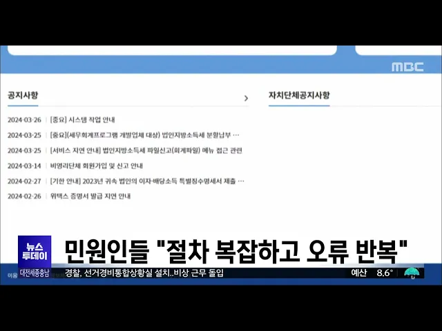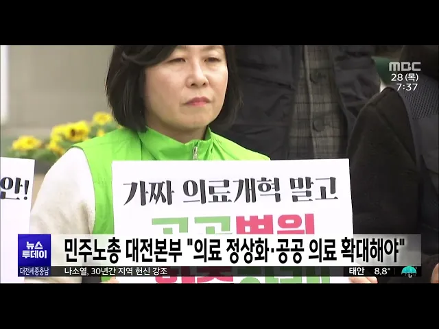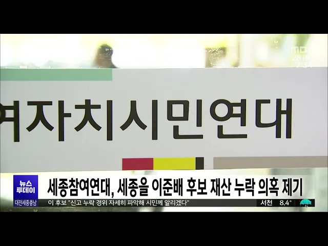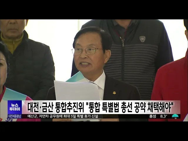 뉴스투데이 뉴스데스크뉴스투데이뉴스데스크 VOD(전체 다시보기)뉴스투데이 VOD(전체 다시보기)유튜브뉴스페이스북 뉴스카카오톡 뉴스인스타그램 뉴스 prev 2024.3.28 - 목요일 next "국회, 세종 완전 이전".."개헌 약속부터"/투데이 ◀ 앵 커 ▶국민의힘 한동훈 비상대책위원장이 국회를 세종시로 완전히 이전해 여의도 정치를 종식하고 세종을 정치행정 수도로 완성하겠다는 공약을 내놨습니다. 이번 총선에서 다시 행정수도론이 선거 주... 조형찬 대전·금산 통합추진위 "통합 특별법 총선 공약 채택해야" 대전·금산 통합 범시민 추진위원회는 대전시의회에서 기자회견을 열고대전과 금산 통합 문제를 국회의원 총선 후보들이 공약으로 채택하라고 촉구했습니다.추진위는 대전과 금산이 통합되면 중부권 수부도... 고병권 홍성·예산 후보, 지역 공약·홍문표와 화합 발표 홍성·예산에 출마한 더불어민주당 양승조,국민의힘 강승규 후보가 각각 지역 공약과홍문표 의원과의 화합과 정책 승계 등을 발표했습니다.더불어민주당 양승조 후보는 공약 기자회견을 열고, 서해선 경부... 김태욱 세종을 이준배 후보도 재산 누락 의혹..해명 요구 더불어민주당 세종갑 이영선 후보에 이어 국민의힘 세종을 이준배 후보에게도 재산 신고 누락 의혹이 제기됐습니다. 세종참여연대는 성명을 내고, 이준배 후보가 세종시 정무부시장 재임 시절 본인과 가족... 조형찬 보령·서천, 30년 지역 지킴이 VS 지역 정치적 자산/투데이 ◀ 리포트 ▶유권자들의 선택을 돕기 위해 총선 후보들의 공약을 들여다보는 시간,오늘은 보령·서천 선거구입니다.보령·서천에선 3선 서천군수 출신의더불어민주당 나소열 후보와 국민의힘 사무총장을 맡아 ... 김태욱 경찰, 선거경비통합상황실 설치..비상 근무 돌입 대전과 세종, 충남경찰이제22대 국회의원 선거를 2주 앞두고경찰청과 각 경찰서에 선거경비통합상황실을설치하고, 24시간 비상근무에 돌입했습니다.경찰은 공식 선거운동 기간에 경계를 강화하고, 선거 당... 이승섭 민주노총 대전본부 "의료 정상화·공공 의료 확대" 주장 민주노총 대전본부는 시청 앞에서 기자회견을 열고 의과대학 정원 확대를 두고 파행을 빚는 의료를 정상화하고 공공 의료를 확대해야 한다고 주장했습니다.이들은 시민들의 고통이 커지는데도기득권을 지... 이승섭 세종서 30대 산모 달리는 구급차 안에서 무사히 출산 세종시에서 조산 징후를 보인30대 산모가 병원으로 가는 구급차 안에서무사히 출산했습니다.세종소방서는 지난 22일 오전 새롬동에서 분만 진통으로 신고한 38살 산모가 대학병원으로 이송 도중 구급차 안... 고병권 '선거철만 되면..' 현수막 난립/투데이 ◀ 앵 커 ▶총선이 다가오면서 불법 설치된 정당 현수막이 기승을 부리고 있습니다. 올해부터 현수막 설치 규정을 강화했지만공식 선거운동이 시작되면 현수막 난립은더 심해질 수 있다는 우려가 나옵니다.... 박선진 위택스 오류 한 달 넘게 이어져 정부가 지난달 지방세 통합징수시스템 위택스를 개편한 이후 한 달 넘게 접속 장애 등 오류가 반복되면서 사용자들의 불편이 이어지고 있습니다.민원인들은 시스템 개편 이후세금을 낼 때마다 납세자가 대... 김태욱 충남도내 첫 스마트 가축경매시장 문 열어 충남도내 최초로 스마트전자경매 시스템을 갖춘 예산축협 가축경매장이 예산군 오가면 일대에 문을 열었습니다.예산축협 가축경매장은 예산군 오가면 신장리 일원 만 5천여 ㎡ 부지에건물 3개 동 3천여 ㎡... 김태욱 예산군, 저연차 공무원에 최대 5일 특별휴가 신설 예산군이 10년 미만 저연차 공무원의사기 진작을 위해 최대 5일간 휴가를 부여하는 자기 성찰 특별휴가를 신설했습니다.군은 지방공무원 복무 조례를 개정해1년 이상 5년 미만은 사흘, 5년 이상 10년 미만... 김태욱 '판사 부족' 법원장도 재판 심리/투데이 ◀ 앵 커 ▶요즘 의사가 모자라 증원을 추진하고 있는데판사의 수도 매우 부족합니다.그만큼 사건 처리가 늦어지면서국민의 피해가 커지자 법원장까지 직접 재판을 맡아 밀린 사건을 심리하고 있습니다.이승... 이승섭