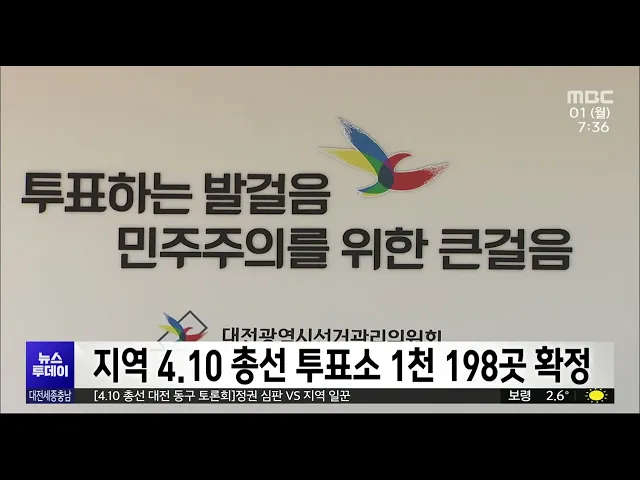 뉴스투데이 뉴스데스크뉴스투데이뉴스데스크 VOD(전체 다시보기)뉴스투데이 VOD(전체 다시보기)유튜브뉴스페이스북 뉴스카카오톡 뉴스인스타그램 뉴스 prev 2024.4.1 - 월요일 next 대전 동구..정권 심판 VS 지역 일꾼/투데이 ◀ 앵커 ▶4.10총선을 앞두고 대전 동구 선거구 후보자 토론회가 대전MBC에서 열렸습니다.현역 의원들의 맞대결로 관심이 큰 만큼여야 후보들은 대표 공약부터 선거 캠페인까지 선명한 차이를 드러냈습니다... 고병권 한화, 14대 3으로 KT 대파.. 황준서 데뷔전 승리투수 한화이글스가 어제대전 한화생명 이글스파크에서 열린 홈경기에서 kt 위즈를 14대 3으로 이기면서 개막 후 7연승을 질주했습니다.한화 신인 투수 황준서는 5이닝 1실점으로 호투하며 프로 선발 데뷔전에서... 김태욱 4.10 총선 선거 투표소 1,198곳 확정 대전과 세종 충남 선거관리위원회가제22대 국회의원 선거 투표소 1,198곳을확정했습니다.투표소는 대전 362곳, 세종 85곳, 충남751곳으로, 각 세대에 보내는 선거 안내문에투표소 건물명과 약도가 포함됐... 고병권 젊은 도시 아산을.."3선"vs"34년 정책통"/투데이 ◀ 앵 커 ▶유권자들의 선택을 돕기 위해총선 후보들의 공약을 들여다보는 시간,오늘은 아산을 선거구입니다.상대적으로 진보세가 강한 지역으로분류되는 이곳에는 민주당 강훈식 후보가3선 도전에, 30여 년... 김광연 히딩크 전 축구 대표팀 감독, 천안 축구센터 건설현장 방문 2002년 한·일 월드컵 4강 신화의 주역 거스 히딩크 전 감독이 천안 축구종합센터 건설 현장을 방문했습니다. 히딩크 전 감독은 어제천안시, 축구협회 관계자 등 40여 명과 축구종합센터 공사 현장을 둘러... 김태욱 '그냥 하고싶어서' 오토바이 난폭운전 4명 검거 대전 대덕경찰서가심야에 오토바이 난폭운전을 한 혐의로40대 배달대행기사 등 4명을 붙잡아 검찰에불구속 송치했습니다.이들은 지난달 11일 새벽대전 시내 도로에서 오토바이를 타고소화기를 뿌리는 등 ... 김태욱 운행 20년 맞은 KTX 누적 승객 10억 5천만 명 지난 2004년 4월 1일 첫 운행을 시작한KTX의 누적 이용객이 20년 만에 10억 5천만명을 기록했습니다.이는 우리나라 국민 한 명당 20번 이상탄 셈으로, KTX는 달린 거리도 지난 20년 동안 지구 둘레의 1만 ... 김태욱 특허청, 디자인 침해 단속지원단 운영 특허청이 디자인 침해 범죄 신속 대응을 위해오늘부터 디자인 침해 단속지원단을 운영합니다.단속지원단은 디자인 침해가 잦은 의류와 패션 분야를 중심으로 일반 구매자 등으로 활동하며 디자인 모방품 ... 김태욱 대전시 4월 '법인지방소득세' 신고·납부의 달 대전시가 4월 한 달을법인 지방소득세 신고 납부의 달로 정해 운영합니다.신고 대상은 영리, 비영리 법인, 국내 원천소득이 있는 외국 법인 등이며, 법인세와 동일한 과세표준 세액에 지방세법 세율을 적... 고병권 세종시, 임신 희망 부부에 검사비 지원 세종시가 임신과 출산을 희망하는 부부에게검진비를 지원하는 '임신 사전건강관리지원사업'을 시행합니다.지원 대상은 세종시에 거주하는임신 희망 부부로, 여성에게는 난소기능 검사와부인과 초음파 비용... 김태욱 충남도, 개 식용 종식 추진단 운영 개의 식용 목적 사육과 도살 등을 금지하는특별법이 3년의 유예를 거쳐 오는 2027년부터시행될 예정인 가운데, 충남도가 '개 식용 종식 추진단'을 운영합니다.개 식용 종식 추진단은 영업 사실 신고와 접... 김태욱