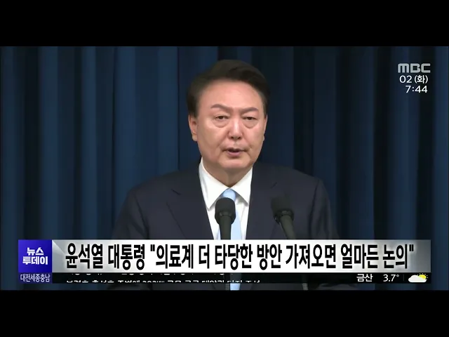 뉴스투데이 뉴스데스크뉴스투데이뉴스데스크 VOD(전체 다시보기)뉴스투데이 VOD(전체 다시보기)유튜브뉴스페이스북 뉴스카카오톡 뉴스인스타그램 뉴스 prev 2024.4.2 - 화요일 next 바닥 뚫린 채 고속도로 내달린 통학버스/투데이 ◀ 앵 커 ▶수십 명의 대학생을 태운 통학버스가 고속도로를 달리고 있다가 타이어가 터졌습니다. 그 충격으로 버스 내부 밑바닥에 큰 구멍이 뚫려 파편까지 안으로 튀어학생 3명이 다쳤습니다. 학생들은 버... 문은선 공주·홍성 골재장에서 노동자 사망 사고 잇따라 충남 지역 골재장에서 최근 잇따라사망사고가 발생했습니다.지난달 29일 오전 11시 50분쯤공주에 있는 골재장에서 70대 근로자가 대형 기계에 치여 숨졌고지난달 27일에도 홍성의 골재장에서 기계 점검을 ... 이승섭 세월호 참사 10주기 준비위 "안전한 사회 건설할 것" 세월호 참사 10주기 대전준비위원회는 어제, 시청 앞에서 기자회견을 열고 참사 피해자들과 연대해 안전한 사회를 건설하겠다고 말했습니다.준비위는 대전시가 '세월호 참사 기억 다짐 사업' 보조금을 전... 이승섭 도시철도 3·4·5호선..가능성은 의문/투데이 ◀ 앵 커 ▶대전시가 도시철도 3·4·5호선 구축계획을발표했습니다. 1호선 지하철, 2호선 트램과 더불어 대전의 동서, 남북을 연결하는 대중교통 체계로 기대를 모으는데요.차량 형식이나 사업비 등이 불투명... 조형찬 세종-충북, BRT전용 광역 자율주행버스 2대 증차 세종시와 충북도가 청주 오송역에서 대전 반석역까지를 오가는 간선급행버스 전용 광역 자율주행 버스를 1대씩 증차했습니다.해당 노선은 청주 오송역과 세종고속시외버스터미널, 대전 반석역을 연결하는 ... 박선진 보령호·홍성호 주변에 202㎿ 규모 태양광 단지 보령시가 보령호와 홍성호 주변 육상에 202MW 규모로 공공이 주도하는 태양광 집적화 단지 조성을 추진합니다. 시는 오는 2026년 하반기 완공을 목표로올해 상반기 안에 산업통상자원부에집적화 단지 지정... 문은선 "힘 있는 여당 후보"vs"준비된 행정가"/투데이 ◀ 앵 커 ▶유권자들의 선택을 돕기 위해총선 후보들의 공약을 들여다보는 시간,오늘은 천안을 선거구입니다.3선의 박완주 의원 불출마로민주당 이재관, 국민의힘 이정만,무소속 전옥균 후보 간 삼파전을 벌... 김광연 서산·태안..'세 번째 맞대결' 후보자 토론회/투데이 ◀ 앵 커 ▶4.10 총선을 앞두고 대전MBC에서 서산·태안 선거구 후보자 토론회가 열렸습니다.세 번째 리턴매치로 관심을 모으는 가운데두 후보들은 대표 공약부터 지역 숙원사업까지 설전을 벌였습니다.박선... 박선진 국민의힘 유승민 전 의원, 대전서 지원 유세 국민의힘 유승민 전 의원이 어제대전을 찾아 대덕구와 유성 갑·을 선거구에서 잇따라 지원유세를 갖고, 국민의힘 후보들을 꼭 당선시켜달라고 호소했습니다. 오늘은 한동훈 비상대책위원장이 세종과 대전... 고병권 천안갑 신범철 후보, 문진석 후보 고소 이번 총선 천안갑에 출마한 국민의힘 신범철 후보가 더불어민주당 문진석 후보를 허위사실 유포 혐의로 천안동남경찰서에 고소장을 제출했습니다.신 후보 측은 '문 후보가 지난달 30일 대전MBC를 통해 방... 김광연 7연승 한화.."올해는 다르다"/투데이 ◀ 앵 커 ▶프로야구 한화 이글스가 시즌 초반 돌풍을 일으키고 있습니다.무려 32년 만에 개막 이후 8경기에서 7승을 거두며, 리그 1위를 달리고 있습니다.경기력도 압도적이어서 하위권을 맴돌던 지난 몇 ... 이승섭 윤석열 대통령 "더 타당한 방안 가져오면 얼마든 논의" 윤석열 대통령이 의료 개혁 관련 대국민 담화에서 의과대학 정원을 2천 명 늘리는 정책을 두고, 의료계가 더 타당하고 합리적인 방안을 가져온다면 얼마든지 논의할 수 있다고 말했습니다.윤 대통령은 정... 이승섭 충청권 광역응급의료상황실 운영 시작 전공의의 진료 거부로 인한 비상 진료 상황에 대응하고, 충청 지역의 응급 환자 이송을 관제하는 충청권 광역응급의료상황실이 어제부터 운영을 시작했습니다.충청권 광역상황실은 상황 의사 1명과 상황 ... 이승섭