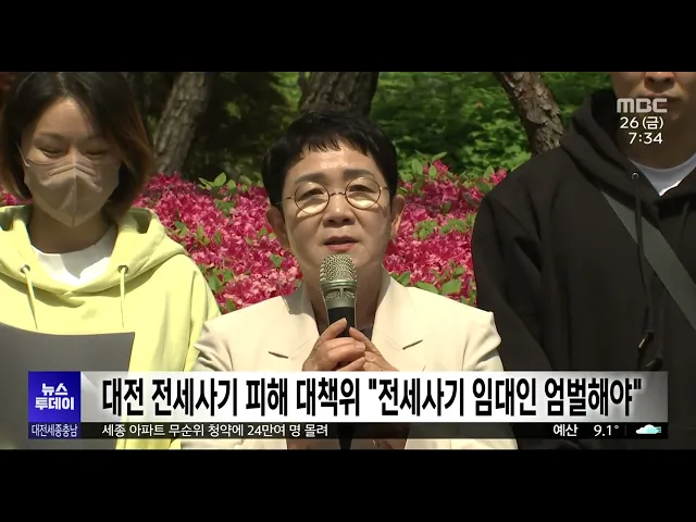 뉴스투데이 뉴스데스크뉴스투데이뉴스데스크 VOD(전체 다시보기)뉴스투데이 VOD(전체 다시보기)유튜브뉴스페이스북 뉴스카카오톡 뉴스인스타그램 뉴스 prev 2024.4.26 - 금요일 next "정말 살맛 나요" 서천 임시시장 개장/투데이 ◀ 앵 커 ▶지난 1월 발생한 큰불로 2백 개가 넘는 점포가 잿더미로 변한서천 특화시장에 석 달 여 만에 임시시장이 문을 열었습니다.사실상 영업을 정상화하면서시장 일대는 모처럼 활력을 되찾았습니다.임... 김태욱 충남대 의대 교수 "내일 휴진" 병원 "정상 진료할 것" 충남대 의과대학 교수 비상대책위원회가오늘부터 매주 금요일 휴진하겠다고 예고한 가운데 충남대병원 측은 정상 진료 입장을 재차 강조했습니다.충남대병원과 세종충남대병원은금요일은 비교적 진료가 적... 이승섭 대전 전세사기 피해 대책위 "전세사기 임대인 엄벌해야" 대전 전세사기 피해대책위원회가 대전지방법원 등에서 기자회견을 열고 전세사기 임대인에 대한 엄벌과 함께 이들에게 지나치게 대출을 많이 해 준 의혹이 제기된 새마을금고에 대한 수사를 촉구했습니다.... 김성국 "노인 복지관 가려면 대기"...방황하는 노인들/투데이 ◀ 앵 커 ▶대전 도심에서 자릿세를 받는 도박장이 버젓이 열리고 있다는 소식, 전해드렸는데요.도박장을 찾는 대부분은 노인이었는데 하나같이 '하루 종일 할 게 없어서 나왔다'고하소연합니다.건강한 노인... 윤소영 진실화해위 최초 대전·아산 유해 신원 확인 한국전쟁 당시 민간인 집단희생자를 발굴했던진실화해위원회가 1,2기 통틀어 처음으로 발굴 유해 두 기의 신원을 확인했습니다.이들은 각각 아산 공수리와 대전 곤룡골 희생자로 밝혀졌습니다. 진실화해위... 조형찬 국토부, '철도지하화' 설명회 대전서 개최 국토교통부가 철도 지하화 팀 조직후 처음으로 전국 지자체 담당 공무원을 상대로 설명회를 열었습니다. 국토부는 대전에 있는 국가 철도공단에서 대전과 천안을 포함한 전국 16개 광역, 지자체 담당자를 ... 고병권 세종 행정수도 완성 총력 기울여야/투데이 ◀ 앵 커 ▶4.10 총선 여·야 공통 공약을 확인하고이행을 촉구하는 기획 보도, 마지막 순서로 세종시입니다.국가 균형발전을 위한 세종시 행정수도 건설은 이번 총선을 통해 여야를 가리지 않고 공감대가 확... 문은선 탁구 금메달리스트 유남규, 늘봄학교 일일 강사 우리나라 최초로 탁구 종목에서 올림픽 금메달을 딴 유남규 한국거래소 탁구단 감독이 대전 동문초등학교를 방문해 일일 체육 강사로 학생들을 만났습니다.유 감독은 늘봄학교 1학년 학생들을 대상으로 탁... 김성국 대전시 생활임금제 개선방안 모색 토론회 열려 민주노총 대전본부와 대전시의회가정책 토론회를 열고 시 생활임금제 운영 실태와 개선방안을 주제로 논의했습니다. 토론회에서는 시 생활임금액이 올해만 천210원으로 전체 광역시도 가운데 최하위 수준... 박선진 '전국 최대 규모' 실내 내비게이션 앱/투데이 ◀ 앵 커 ▶지하상가나 터미널 등 복잡한 실내에서 길을 헤맨 경험, 한 번쯤 있으시죠.대전시가 지하상가에 전국 최대 규모의 실내 내비게이션 앱을 구축해 길 찾기는 물론 대형 화재 같은 사고가발생했을 ... 박선진