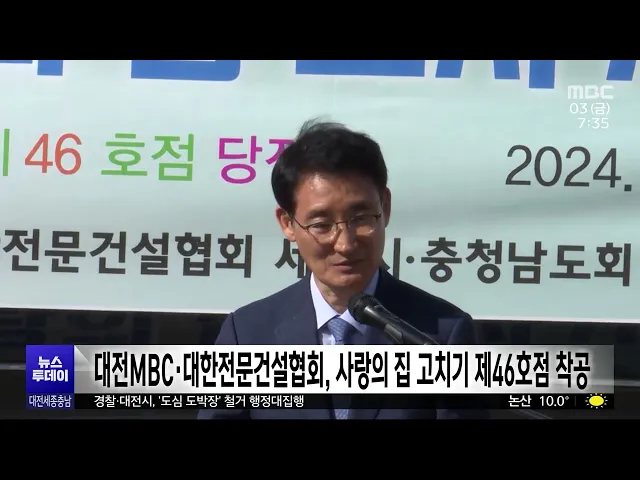 뉴스투데이 뉴스데스크뉴스투데이뉴스데스크 VOD(전체 다시보기)뉴스투데이 VOD(전체 다시보기)유튜브뉴스페이스북 뉴스카카오톡 뉴스인스타그램 뉴스 prev 2024.5.3 - 금요일 next 키즈카페 원산지 위반 무더기 적발/투데이 ◀ 앵 커 ▶어린이날을 앞두고, 키즈카페 이용하려는 분들 많으실 텐데요.키즈카페 안에 있는 음식점에서원산지를 속이거나 표기하지 않은 사례가무더기로 적발됐습니다.김성국 기자입니다.◀ 리포트 ▶대전의... 이승섭 "이물질 삼킴 걱정마세요" 내시경 로봇이 '쏙'/투데이 ◀ 앵 커 ▶아이를 키우는 가정에서는 한 번쯤 구슬이나 단추형 전지, 동전 등을 삼켜 급히 병원으로 달려가는 일이 생기고는 하죠.지금까지는 단단한 내시경을 사용해 이물질을 빼야 해서 기도가 좁은 아이... 김윤미 백일해 전국 33배 증가..대전시 차단 총력 발작성 기침을 일으키며 전염성이 높은백일해가 대유행해 주의가 요구됩니다.대전시는 지난달 10명 등 올해 18명의 백일해 환자가 발생했고, 전국적으로 365명의 환자가 발생하는 등 지난해 보다 33배 급... 조형찬 대전MBC·대한전문건설협회, 사랑의 집 고치기 제46호점 착공식 대한전문건설협회 세종시·충청남도회와 대전MBC가 함께 추진하고 있는 '사랑의 집 고치기' 제46호점 착공식이 당진시 신평면에서 열렸습니다. 열악한 환경에 노출된 이웃에게 쾌적한 주거 환경을 제공하는... 최기웅 대전세종충남영상기자회 '2024 보도영상전' 개최 대전세종충남영상기자회와 목요언론인클럽이 주관하는 '2024 보도영상전이' 대전시청 전시실에서 열려 오는 7일까지 계속됩니다. 지역 언론사 영상기자들의 작품을 소개하는 이번 보도영상전에는 대전MBC... 이승섭 도심 홀덤펍에서 수십억대 불법 도박/투데이 ◀ 앵 커 ▶도심 한복판에 홀덤펍 매장을 열고, 실제로는 도박장을 운영한 업주와 운영진, 도박 참여자 등 12명이 경찰에 붙잡혔습니다.지난 1년여간 판돈은 27억 원, 공무원을포함해 120여 명이 불법도박을... 문은선 경찰·대전시, '도심 도박장' 철거 행정대집행 대전 도심 하천변에서 노인 수백 명이 참여하는도박장이 성행한다는 대전MBC 보도와 관련해경찰과 대전시가 행정대집행에 나섰습니다.대전 중부경찰서와 대전시 하천관리사업소는어제, 도마교 아래에 있던... 이승섭 세종시 종합체육시설 건립 청신호..하계U대회 맞춰 건립 오는 2027년 열리는 충청권 하계세계대학경기대회에 활용될 세종시 종합체육시설이 기획재정부 예비타당성 재조사를 통과했습니다. 최민호 세종시장은 기자회견을 열고 "대평동 일대에 추진 중인 종합체육... 김광연 경찰병원 아산 분원 건립, 신속예타 대상 선정 오는 2028년 개원 예정인 경찰병원 아산 분원 건립 사업이 신속 예비타당성조사 대상으로 선정됐습니다.충남도는 해당 사업이 기획재정부의 재정사업평가위원회에서 신속 예타 대상으로 선정돼 예타 수행 ... 김광연 사고 내고 도주 "음주운전 안 했다"/투데이 ◀ 앵 커 ▶그제 대전의 한 아파트에서 승용차가 주차된 차량 7대를 들이받는 사고가 있었습니다.음주 운전이 의심됐지만,사고 직후 운전자는 잠적했는데요.사고 하루 만에 경찰에 붙잡힌 운전자는술을 마시... 이승섭 환경단체 "세종보 상류에서 물떼새 발견..재가동 중단해야" 재가동을 앞둔 세종보 상류에서멸종위기종이 포함된 물떼새 수십 마리가 서식중인 것으로 파악됐습니다.지역 환경단체는 지난달 29일,세종보 상류의 모래톱과 하중도에서멸종위기종인 흰목물떼새 5마리와... 이승섭 대전 정착형 청년일자리 참여 기업·청년 모집 대전시가 대전 정착형 청년일자리 종합 프로젝트, 일명 대전 잡스에 참여할 지역 기업과 청년을 이 말까지 모집합니다. 대전 잡스는 지역 우수 기업과 청년을 연결해 취업 성공을 지원하고, 지역 정착을 ... 조형찬 충남도, 고령 농업인 농지 이양 활성화 사업 추진 충남도가 고령의 농업인이 농지를 팔면1ha당 매년 1,100만 원을 지원하는고령 은퇴농업인 농지 이양 활성화 시범 사업을 추진합니다. 사업대상은 65살 이상 84살 이하 농업인으로충남도는 3년 이상 소유한... 김태욱 대전시, 소상공인 점포 시설개선·폐업 지원 대전시가 소상공인 시설 개선과 폐업, 원상 복구를 지원하는 자영업 닥터제를 추진합니다.이는 소상공인이나 예비창업자들이 시설을 개선하거나, 폐업 시 200~250만 원의 비용을 지원하는 사업으로, 참여 ... 조형찬 김태흠 지사, 5박 7일 카자흐·우즈벡 출장 김태흠 충남지사가 5박 7일 일정으로 카자흐스탄과 우즈베키스탄 등 중앙아시아를 찾아 K-제품 판로 확대 등을 모색합니다.김 지사는 오늘 카자흐스탄 수도였던 알마티시 시장 접견을 시작으로충남도가 현... 김태욱