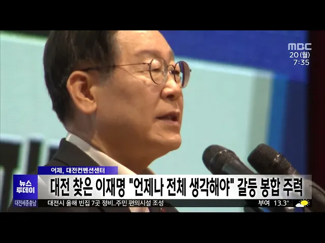 뉴스투데이 뉴스데스크뉴스투데이뉴스데스크 VOD(전체 다시보기)뉴스투데이 VOD(전체 다시보기)유튜브뉴스페이스북 뉴스카카오톡 뉴스인스타그램 뉴스 prev 2024.5.20 - 월요일 next '의무 채용 30%'라지만/투데이 ◀ 앵 커 ▶수도권에서 비수도권으로 이전한 공공기관에 의무적으로 지역 인재를 채용하도록 한 제도가 시행 7년 차를 맞았습니다. 채용 비중을 단계적으로 늘려 2년 전부터는 최대 30%를 지역 인재로 채용... 박선진 이재명 민주당 대표, 대전 찾아 당원 갈등 봉합 나서 더불어민주당 이재명 대표가대전에서 열린 충청권 당원 행사에 참석해 최근 당내 국회의장 후보 경선에서 추미애 당선인의 낙선으로 촉발된 당원 갈등 봉합에 주력했습니다.이 대표는 일부 강성 당원들의 ... 김태욱 오늘부터 병원·약국 갈 때 신분증 필수 지참 오늘부터 병·의원 등 의료기관과 약국에서 건강보험을 적용받으려면 반드시 신분증을 지참해야 합니다.이는 명의도용 등을 막기 위한 건강보험 본인확인 의무화 시행에 따른 것으로, 주민등록증이나 운전... 김윤미 충남도, 10개 시·군에서 고향사랑 기부 덤&덤 행사 충남도가 고향사랑기부제에 참여하면 기존 세액공제와 답례품 혜택에 더해 추가 답례품과 경품을 제공하는 행사를 다음 달 2일까지 진행합니다.행사는 천안과 아산, 예산과 서천을 제외한 충남 10개 시군... 김태욱 세종시, 청년 대상 전세사기 피해 예방 교육 부동산 정보에 상대적으로 취약한 청년들을 대상으로 세종시가 오는 24일 전세사기 피해 예방 교육을 실시합니다.공인중개사협회와 함께 진행하는 이번 교육에서는 부동산 기초 용어부터 계약 단계별 점검... 김태욱 대전시 올해 빈집 7곳 정비..주민 편의시설 조성 대전시가 올해 20억 원을 들여 빈집 7곳 정비에 나섭니다.대상은 동구 3곳과 그 밖의 자치구별 1곳씩으로 대부분 철거가 시급한 빈집 4등급에 해당하며시가 사들여 부족한 생활 기반 시설이나 주민 편의시... 조형찬 대전 중구, 맨홀 추락방지시설 121곳에 설치 국지성 호우가 잦아지는 장마철을 앞두고대전 중구가 유천 2구역을 비롯한 상습 침수 구역을 중심으로 맨홀 추락방지시설을 121곳에 설치했습니다.맨홀 추락방지시설은 맨홀 뚜껑 바로 아래 그물 모양의 ... 김윤미 '꿀벌 보호' 위해 해마다 여의도 13배 밀원숲 조성 꿀벌 실종 사태 해결과 양봉산업 지원을 위해 산림청이 해마다 여의도 면적의 13배 규모의밀원숲 조성에 나섭니다.산림청은 헛개나무와 광나무, 꽝꽝나무 등 단위 면적당 꿀 생산량이 우수한 수종을 발굴... 김태욱 충남농기원 "큰 일교차에 육묘장 관리 주의해야" 충남도 농업기술원이 최근 큰 일교차로 인한 벼 못자리 뜸묘와 입고병 등이 우려된다며 모내기를 앞두고 육묘장 관리에 각별한 주의를 당부했습니다.농업기술원은 지난 한 달 평균 기온이 평년보다 3도, ... 김태욱