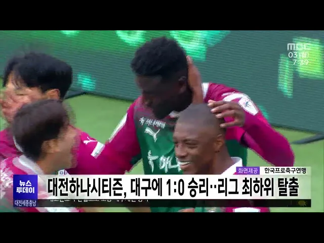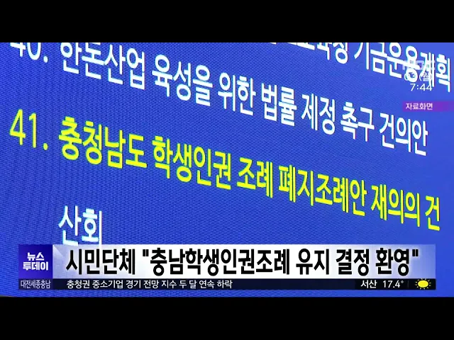 뉴스투데이 뉴스데스크뉴스투데이뉴스데스크 VOD(전체 다시보기)뉴스투데이 VOD(전체 다시보기)유튜브뉴스페이스북 뉴스카카오톡 뉴스인스타그램 뉴스 prev 2024.6.3 - 월요일 next "북극도 OK" 최첨단 '바다 위 연구소' 출항/투데이 ◀ 앵 커 ▶석유나 가스, 희토류까지 바닷속 자원을 최첨단 장비로 탐사해 바다 위 연구소로 불리는 '탐해 3호'가 첫 항해에 나섭니다.우리나라 바다는 물론, 이제 북극까지 그야말로 전 세계 바다를 누비며... 김윤미 서천 특화시장 임시 오일장 오는 7일 개장 대규모 화재 이후 서천 임시 시장을 개장한서천군이 오는 7일부터 임시 오일장 운영도재개합니다.서천군은 서천계량소에서 임시특화시장주 출입로를 차 없는 거리로 조성하고임시주차장으로 활용하고 있는... 문은선 대전시, 소규모 주택정비사업 사업성 분석 지원 대전시가 소규모 주택정비사업에 대해사업성 분석을 지원합니다.대상은 도로를 유지하면서 소규모로주거환경을 개선하거나 정비기반시설이양호한 지역의 소규모 공동주택 재건축, 역세권이나 준공업지역의... 문은선 세종 배달앱에서 여민전 결제 시 12% 캐시백 혜택 세종시가 민관협력 배달앱 '땡겨요'에서 지역화폐인 여민전으로 결제하면 추가 지급하는 캐시백 혜택을 올해 말까지연장 운영합니다.시는 애초 추가 캐시백 지급을 한시적 이벤트로 추진했으나 최근 정부... 김성국 민주당 충청권 의원 상임위 1차 배정 마무리 22대 국회 원내 1당인 더불어민주당이상임위원회 1차 배정을 마무리한 가운데충청권 의원들의 역할이 주목됩니다.우선 국토교통위원회에 간사를 맡은문진석 의원을 비롯해 박용갑, 복기왕 의원이 포함됐고... 문은선 대남 오물 풍선 부여·천안서도 발견 북한이 남한으로 날려 보낸 오물 풍선이전국 곳곳에서 발견된 가운데부여와 천안에서도 잇따라 확인됐습니다.어제 오전 6시쯤 부여군 임천면과 천안시 입장면에서 오물 풍선이 발견돼 군과 경찰이 출동해 ... 김성국 대전하나시티즌, 대구에 1:0 승..리그 최하위 탈출 K리그1 대전하나시티즌이 어제대전월드컵경기장에서 대구FC를 상대로1대 0으로 이기면서 3연패를 끊고 리그 최하위를 탈출했습니다.대전은 후반 39분 코너킥 기회에서 공격수 음라파가 극적인 헤딩골을 넣... 김성국 충남도, 최중증 발달장애인 24시간 돌봄 서비스 제공 충남도가 장애 정도가 심해 기존 복지 서비스를 받는 데 어려움을 겪어 온 최중증 발달장애인에게 24시간 돌봄 서비스를 제공합니다.도는 공모를 통해 북부권과 남부권을 맡을 기관을 선정했고 다음 달부... 김광연 충청권 중소기업 경기 전망 2개월 연속 하락 계속되는 경기 침체 속에서충청권 중소기업 경기 전망 지수가두 달 연속 하락했습니다.중소기업중앙회 대전세종충남본부의 조사 결과,충청권의 6월 중소기업 경기 전망 지수는 지난달보다 2.5포인트 하락... 김성국 시민단체 "충남학생인권조례 유지 결정 환영" 대법원의 충남학생인권조례 효력 유지 결정에 대해 시민단체 등이 환영하고 나섰습니다.충남시민사회단체연대회의는 논평에서대법원의 이번 결정으로 폐지조례안이 비상식적이고 무리였음이 드러났다고 평... 문은선 충남도 특사경, 염소고기 취급 업소 특별 단속 충남도 특별사법경찰이 여름철 수요가 느는 염소고기 취급 업소 370여 곳을 대상으로이달 말까지 특별 단속을 벌입니다.이번 단속에선 허가받지 않은 작업장에서도축하거나 가공·포장한 경우, 검사받지 않... 문은선