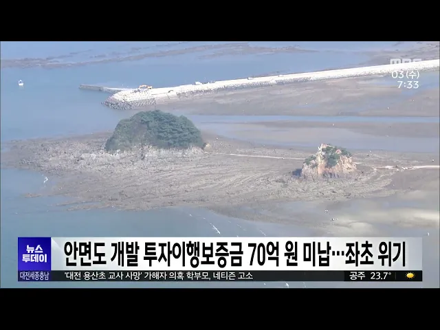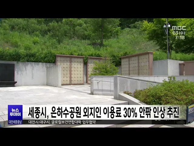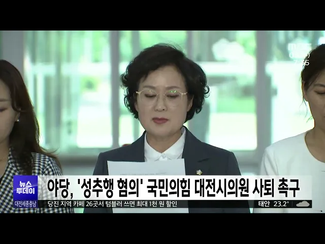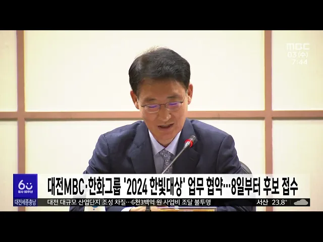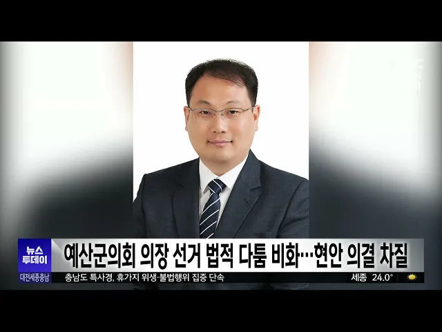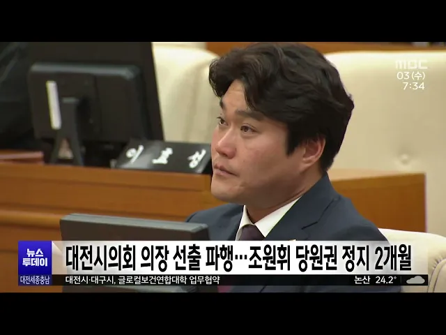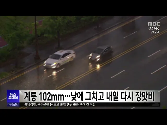 뉴스투데이 뉴스데스크뉴스투데이뉴스데스크 VOD(전체 다시보기)뉴스투데이 VOD(전체 다시보기)유튜브뉴스페이스북 뉴스카카오톡 뉴스인스타그램 뉴스 prev 2024.7.3 - 수요일 next 계룡 102mm..낮에 그치고 내일 다시 비 오늘 새벽부터 대전과 세종, 충남 지역에다시 장맛비가 내리고 있습니다.어제부터 내린 비의 양은 계룡 102mm를 최고로 대전 88.7mm,논산 84.5mm 등을 기록하고 있습니다.이번 비는 오늘 낮까지 5에서 30m... 이승섭 6,300억 출자.. 시작부터 난항?/투데이 ◀ 앵 커 ▶대전시가 일류경제도시 목표 달성을 위해 산업단지 조성에 공을 들이고 있는데요.산업단지를 늘리려면 재원 마련이 중요한데과연 실상은 어떨까요?박선진 기자가 단독취재했습니다.◀리포트▶대규... 김지훈 안면도 개발사업, 투자이행보증금 미납으로 좌초 위기 충남도 숙원사업인 태안 안면도 개발사업이 사업자 측의 투자이행보증금 미납으로 좌초될 위기에 놓였습니다.충남도는 사업 주관사인 온더웨스트 컨소시엄이 두 차례 납부 기한 연장에도 불구하고 투자이... 김태욱 대전시의회 의장 선출 파행..조원휘 당원권 정지 2개월 국민의힘 대전시당이 지난달 당내 투표로 결정된 의장 후보에게 본회의에서 무효표를 던진 조원휘 의원에게 당원권 정지 2개월을, 의장 선출안이 부결되자2차 투표를 방해한 김선광 의장 후보에게경고의 ... 고병권 '성추행 의혹 국민의힘 대전시의원' 사퇴 촉구 더불어민주당과 진보당 대전시당이국민의힘 소속 대전시의원이 지난 총선 캠프 여직원을 성추행한 혐의로 피소된 사건과 관련해 의원직 사퇴와 재발 방지 대책을 촉구했습니다.이들 야당은 해당 의원이 지... 고병권 행정수도 위상 높여..소통 필요 지적도/투데이 ◀ 앵 커 ▶민선 4기 세종 시정이 반환점을 돈 가운데 세종시의 행정수도 위상이 강화됐다는평가가 나오고 있습니다.하지만 세종시 성장이 정체되고 있고, 시정 운영에도 소통이 더 필요하다는 지적도 적지... 김광연 세종시 '은하수공원 타 지역 주민 이용료 인상' 조례 입법 예고 세종시가장사시설인 은하수공원 이용료를타지역 주민에 한해 인상하는 안을 추진하고 있습니다.세종시가 입법 예고한 시 조례에 따르면,다른 지역 주민의 화장장, 봉안당 사용료를각각 25%, 34% 인상하고,... 고병권 예산군의회 후반기 의장단 선출 놓고 법적 다툼 이어져 예산군의회 후반기 의장단 선출 관련 파행이법적 문제로 비화되면서 의회 운영에 차질을 빚고 있습니다.예산군의회는 지난달 이상우 의원과 강선구 의원을 각각 의장과 부의장으로 선출했지만, 한 군의원... 김태욱 천안·아산시의원 절반가량, 주택 2채 이상 소유 천안과 아산시의회 의원의 절반가량이 다주택 보유자인 것으로 확인됐습니다.천안아산경제정의실천시민연합의 조사 결과천안시의원의 46%인 12명이, 아산시의원의 59%인 10명이 주택을 2채 이상 보유한 다... 김광연 거센 폭우.."도로 잠기고, 교통사고"/투데이 ◀ 앵 커 ▶장맛비가 또다시 시작됐죠.어제는 특히 시간당 최대 40mm가 넘는 폭우가 쏟아져, 빗길 교통사고가 잇따랐고, 20여 건의 비 피해가 발생했는데요.오늘도 낮까지 비가 예보된 만큼 단단히 대비하셔... 윤소영 장마철 타이어 확인하세요!/투데이 ◀ 앵 커 ▶본격적인 여름 휴가철을 앞두고 장마가 시작됐는데요. 장거리 운전하시는 시청자 분들은 이 뉴스 눈여겨 보셔야할 것 같습니다. 타이어가 마모된 상태로 빗길을 달리면 제동거리가 두 배로 늘어... 김태욱 2024 한빛대상 업무 협약식 2024 한빛대상 업무 협약식이 진종재 대전MBC 사장과 김신연 한화커뮤니케이션 위원회 사장 등이 참석한 가운데 대전MBC에서 열렸습니다.올해 20주년을 맞이하는 한빛대상은 과학기술과 지역경제 등 5개 ... 조형찬 충남도, 국립치의학연구원 천안 설립 100만 서명 돌입 충남도가 대통령 공약인 국립치의학연구원 천안 설립의 조속한 이행을 위해 3달 동안범도민 100만 명 서명운동을 시작합니다.도는 100만 명 목표를 달성한 뒤 치의학연구원 설립 타당성 연구용역 중간보고... 김태욱