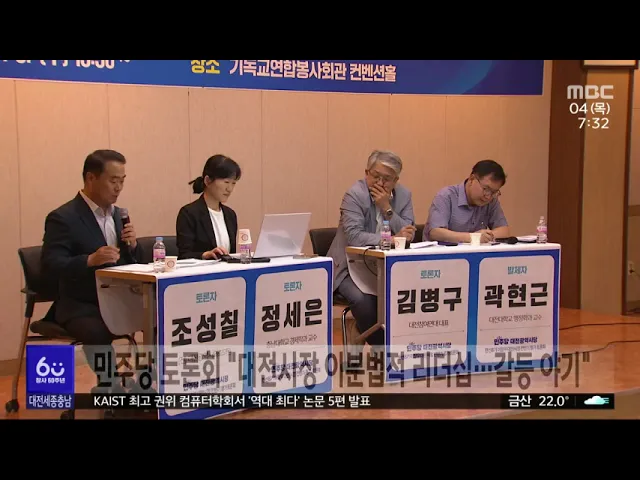 뉴스투데이 뉴스데스크뉴스투데이뉴스데스크 VOD(전체 다시보기)뉴스투데이 VOD(전체 다시보기)유튜브뉴스페이스북 뉴스카카오톡 뉴스인스타그램 뉴스 prev 2024.7.4 - 목요일 next 시의회 파행 계속..일은 언제 하나?/투데이 ◀ 앵 커 ▶지난주 파행 이후 일주일 만에 다시 열린 대전시의회 의장 선출이 국민의힘 내분이 재연되며 또다시 부결됐습니다. 자리 싸움으로 시작된 갈등이 수습은 커녕해결의 기미가 보이지 않는 건데요.... 김광연 조승래 "지역 정당 구시대 유물" 이장우 대전시장 비판 대전 유성갑 조승래 민주당 의원은 최근 이장우 대전시장이 지역 정당 가능성을 시사한 것과 관련해 "지역 정당은 구시대 유물이 된 지 오래"라고 비판했습니다.조 의원은 대전시청에서 기자들과 만나"이 ... 고병권 "이장우 시장 이분법·권위주의적 리더십…공공갈등 야기" 이장우 대전시장이 지난 2년간 보여준이분법·권위주의적 리더십이 많은 공공갈등을 야기했다는 주장이 나왔습니다.곽현근 대전대 교수는 민주당 대전시당이 주최한 민선 8기 대전시장 전반기 토론회에서온... 문은선 '재소자 살해 공범' 또 재소자 폭행?/투데이 ◀ 앵 커 ▶대전MBC는 3년 전, 공주교도소에서재소자 3명이 동료 재소자를 폭행해 숨지게 한 사건을 단독 보도한 바 있습니다.이들은 결국 재판에 넘겨져 주범은 무기징역을,다른 공범 2명은 10년 이상의 징... 김성국 '대전판 김호중' 음주 운전 혐의 송치/투데이 ◀ 앵 커 ▶술을 마시고 운전대를 잡아 교통사고를 내고도음주 운전을 하지 않았다고 발뺌해 공분을 산 가수 김호중 씨 사건.두 달 전, 대전에서도 비슷한 사건이 있었는데,경찰이 끈질긴 수사 끝에 운전자... 이승섭 대전지검, 불법 촬영 근절 대책 회의 개최 최근 지역사회에서 불법 촬영 범죄가 잇따른다는 대전MBC의 연속 보도와 관련해검찰과 경찰, 행정안전부 등 11개 관계기관이어제, 대전지방검찰청에서 공중화장실의불법 촬영 범죄를 근절하기 위한 대책 ... 이승섭 80대 치매 노인 상습 폭행 요양보호사 실형 선고에 항소 자신이 돌보던 치매 노인을 상습적으로 폭행한혐의로 기소돼 1심에서 징역 1년의 실형을선고받은 70대 요양보호사가 판결에 불복해 항소했습니다.피고인은 지난해 3월부터 8개월 동안가정집 방문 요양보호... 이승섭 충남산림자원연구소, 민간 매각 나선다/투데이 ◀ 앵 커 ▶충남 산림자원연구소는 충남도 산하 기관이지만, 행정구역상으로는 세종시에 위치하고 있죠.연구소를 다시 충남으로 이전할 계획을 밝힌충남도가 연구소 부지를 민간에 매각해 이전 비용을 충당... 김태욱 당진시, '천주교 세계 청년대회' 계기 지역 성지 국제화 모색 당진시가 오는 2027년 서울에서 열리는 '천주교 세계청년대회'를 앞두고 지역의 천주교 성지를 널리 알리기 위한 방안을 모색합니다. 시는 최근 대한민국 최초의 사제 김대건 신부 탄생지인 솔뫼성지에서 ... 고병권 대전 방문객, 유통시설에 치중..관광 콘텐츠 시급 대전의 외지 관광객이 늘고 있지만, 백화점 등 유통시설 등에 치중돼 있어, 관광 인프라나 콘텐츠 개발이 시급하다는 분석입니다.한국관광공사의 '한국관광 데이터랩' 분석 결과지난해 6월부터 올해 5월까... 조형찬 '투명도 내맘대로' 초대형 투명 스크린 개발/투데이 ◀ 앵 커 ▶투명도를 자유자재로 조절해화면 너머도 선명하게 볼 수 있는초대형 나노 투명 스크린 기술이 세계 최초로 개발됐습니다. 기존 제품보다 10분의 1 가격으로 대량 생산할 수 있어 다양한 분야에 ... 최기웅 코로나19 바이러스 대량 증식 원리 새롭게 규명 코로나19 바이러스가 인체 내에서 빠르게 대량 증식하는 원리를 국내 연구진이 새롭게 밝혀냈습니다.한국화학연구원 연구팀은 코로나19 바이러스가 몸속 세포에 침입한 뒤 세포 속 미토콘드리아의 구조와 ... 김윤미 대전시, 양자컴퓨팅 소부장 생태계 육성 대전시가 한국표준과학연구원과'양자컴퓨팅 소부장 스케일업 밸리 협의체'를출범하고 관련 생태계 육성에 나섭니다. 이번 협의체는 표준과학연구원이 주관하고국내외 양자 컴퓨팅 관련 25개 기관이 참여해... 박선진