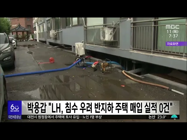 뉴스투데이 뉴스데스크뉴스투데이뉴스데스크 VOD(전체 다시보기)뉴스투데이 VOD(전체 다시보기)유튜브뉴스페이스북 뉴스카카오톡 뉴스인스타그램 뉴스 prev 2024.7.11 - 목요일 next 2백 년만의 폭우/투데이 ◀ 앵 커 ▶어제 충청권에는 시간당 100mm 안팎의 극한 호우가 쏟아졌습니다.2백 년 만에 한 번 발생할 만한기록적인 폭우였는데요.지난 주말부터 이어진 장맛비에피해가 속출하면서 충남도는 정부에 전폭적... 이승섭 제보 영상으로 본 호우/투데이 ◀ 앵 커 ▶우리 지역에 쏟아진 기록적인 폭우에현장에 계신 시청자들도 대전MBC에소중한 제보 영상을 보내주셨습니다.시청자 제보 영상으로 본 이번 집중호우 현장을이승섭 기자가 정리했습니다.◀ 리포트 ▶... 이승섭 극한 호우 흙더미 충청권 덮쳤다/투데이 ◀ 앵 커 ▶특히, 이번 극한 호우로 인한 인명피해는 산사태, 토사 유출 사고로 주로 발생했습니다. 계속된 장맛비에 약해진 지반이 무너져 내린건데 서천과 금산에서 60,70대 노인 2명이 숨졌습니다. 김태... 김태욱 지하주차장 침수로 승강기 갇힌 남성 사망‥"침수에 단전 추정"/투데이 ◀ 앵 커 ▶어제 충청권에는 3백mm 가까운물폭탄이 떨어졌죠.특히 새벽 시간에 내린 기습 폭우가인명 피해를 더욱 키웠는데요.논산에선 한 오피스텔 지하가 침수돼지하 승강기 안에 갇힌 입주민이 숨졌습니... 고병권 박용갑 “LH, 침수 우려 반지하 주택 매입 실적 0건” 2년 전 집중호우에 따른 인명 사고를 계기로 도입한 '반지하 퇴출' 사업 실적이 전무한 것으로 나타났습니다.민주당 대전 중구 박용갑 국회의원이LH로부터 제출받은 자료 분석 결과, 지하층 주택, 이른바 ... 김지훈 마을 고립 '공포의 4시간'..이재민 170여 명/투데이 ◀ 앵 커 ▶이번 집중호우로 대전의 한 마을은 송두리째 물에 잠겨 섬처럼 고립됐습니다.결국, 구조대가 보트를 타고 들어가 4시간 동안 공포에 떨던 주민들을 모두 구조했습니다.박선진 기자입니다. ◀ 리포... 박선진 장마로 채소류 가격 상승...시금치 30% 올라 장마철이 이어지면서 채소 가격이 계속해서 오르고 있습니다. 한국농수산식품유통공사에 따르면시금치 소매가격은 100g에 1,276원으로 일주일 만에 30.1% 올랐고 쌈배추와 적상추도 일주일 전보다 26%, 17... 김지훈 하천 위험에 '유등교 침하·출근 대란'/투데이 ◀ 앵 커 ▶극한호우는 도심 하천도 위험 수위로 끌어올렸습니다. 행인이 불어난 하천에 빠졌다 극적으로 구조되는가 하면, 일부 교량은 지반이 무너지며 아예 주저 앉기도 했습니다. 출근길 시민들은 극심... 김광연 대전시의회 후반기 의장단 늑장 선출..지방의회 난맥상 드러내 국민의힘 소속 시의원 간 내분 등으로 파행을 거듭하던 대전시의회가 후반기 원 구성을 마무리했습니다.대전시의회는 오늘 3차례에 걸친 의장 투표를통해 국민의힘 조원휘 의원을 후반기 의장에, 제1부의... 김지훈 정읍∼계룡 송전선로 금산 경유 '문제없음' 처분에 주민 반발 금산 지역 주민들이 한국전력공사의 '신정읍∼신계룡 송전선로'의 입지 선정 과정에 문제가 있다며 국민권익위원회에 민원을 제기했으나 받아들여지지 않았습니다.금산군 진산면 주민들에 따르면 권익위는 ... 김지훈 '수사 도중 또 불법 촬영' 고교생에 실형 선고 대전MBC가 단독 보도한, 수사 도중 또다시 불법 촬영 범죄를 저질러재판에 넘겨진 고교생이 실형을 받았습니다.대전지법 형사6단독 김지영 판사는"범행이 발각된 이후에도 재범을 저질렀고피해자들의 정신... 이승섭