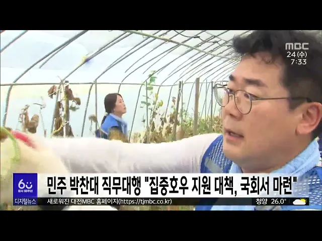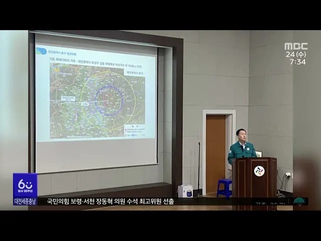 뉴스투데이 뉴스데스크뉴스투데이뉴스데스크 VOD(전체 다시보기)뉴스투데이 VOD(전체 다시보기)유튜브뉴스페이스북 뉴스카카오톡 뉴스인스타그램 뉴스 prev 2024.7.24 - 수요일 next 해루질하다 2명 숨져/투데이 ◀ 앵 커 ▶보령에서 해루질하던 40대 남성 2명이바다에 빠져 숨진 채 발견됐습니다.이번 주는 특히 서해안 밀물이 높아 바닷가 체험 활동에 각별한 주의가 필요한데요.서산에서는 음주 운전을 하다가오토바... 이승섭 민주 박찬대 직무대행 "집중호우 지원 대책, 국회에서 마련하겠다" 더불어민주당 박찬대 대표 직무대행이어제 부여군 수해 현장을 찾아,"올해 200년 빈도의 집중호우가 쏟아졌다며,더는 '사후약방문식' 대처로는 안 된다"고강조했습니다.박 직무대행은 "많은 농가가큰 피해... 고병권 대전서 소나무재선충병 발생..반출금지구역 지정 금강유역환경청에서 관리하는 상수원보호구역인대전 동구 추동 명상정원 인근에서 소나무재선충병이 발생해 관계기관이 긴급 대응에 나섰습니다.대전 동구는 지난 19일 소나무 세 그루가 소나무재선충병으... 김광연 장마 주춤하니 폭염...당분간 소나기/투데이 ◀ 앵 커 ▶정체전선이 충청권을 오르내리면서변덕스러운 날씨가 이어지고 있습니다.갑자기 낙뢰와 함께 기습 폭우가 쏟아지는가 하면, 무더위와 열대야도 기승을 부리고 있는데요.기상청은 당분간 무더위가... 윤소영 200년 빈도 폭우에도 농지 배수 기준은 제자리/투데이 ◀ 앵 커 ▶최근 무려 200년에 한 번꼴인 극한 호우로 충남에서는 막대한 농경지가 침수됐습니다. 매년 반복되는 농가 피해, 알고보니 구조적 문제가 있는 것으로 드러났습니다. 기후 변화로 극한 호우가 일... 김태욱 국민의힘 전당대회서 보령·서천 장동혁 의원 최고위원 선출 보령과 서천을 지역구로 둔 국민의힘 장동혁 의원이 어제 열린 국민의힘 전당대회에서 최고위원에 선출됐습니다.장동혁 의원은 선거인단과 여론조사를 합한 총 득표율 20.6%로, 후보 중 가장 많은 표를 얻... 김광연 민주당 박정현 의원 시당위원장 출마 선언..장철민 의원과 경선 예고 더불어민주당 박정현 국회의원이 어제 대전시의회에서 기자회견을 열고, 대전시당위원장 출마를 공식 선언했습니다. 박 의원은 "이재명 대표의 민주당 대전시당위원장으로서 윤석열 검찰 독재에서 시민을 ... 고병권 학생들은 어디로.. '예지재단 파산'/투데이 ◀ 앵 커 ▶대전에는 만학도들이 주로 다니는 평생교육시설, 예지 중·고등학교가 있습니다. 그런데 이 학교 재단이 최근 파산 선고를 받아 6백 명에 달하는 학생들의 배움의 앞날이 불투명해졌습니다.박선... 박선진 서천군, 국립생태원 상습 정체구간 국도 확장 마쳐 서천군이 동서천나들목과 국립생태원 인근 송내교차로를 잇는 국도 21호선과 29호선 구간 확장 공사를 마치고 오늘 정오부터 개통합니다.군은 지난 2017년부터 855억 원을 투입해 8.1km 구간 4차로 확·포... 김태욱 한의연 "저녁형 인간이 아침형보다 인지기능 높아" 한국한의학연구원 박지은 박사 연구팀이 아침형·저녁형과 같은 수면패턴과 인지 기능과의 관련성을 분석한 결과 저녁형 인간이 아침형보다 인지기능이 높은 것으로 나타났습니다. 이번 연구는 한의연이 영... 최기웅