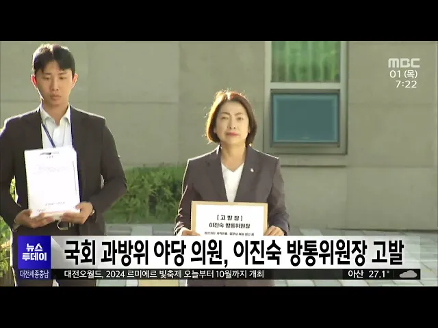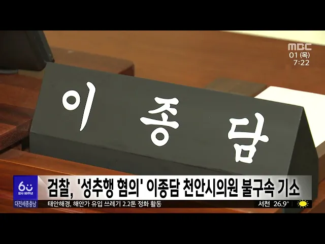 뉴스투데이 뉴스데스크뉴스투데이뉴스데스크 VOD(전체 다시보기)뉴스투데이 VOD(전체 다시보기)유튜브뉴스페이스북 뉴스카카오톡 뉴스인스타그램 뉴스 prev 2024.8.1 - 목요일 next 대전 펜싱 두 영웅 금메달..모교서 열띤 응원전 대전시청 소속 오상욱·박상원 선수가 속한 펜싱 남자 사브르 단체 국대표팀이 금메달을 획득한 가운데, 두 선수의 모교인대전 매봉중학교에서 열띤 응원전이 펼쳐졌습니다.친형인 오상민·박광원 펜싱 코치... 김성국 대전 0시 축제, 올해는 다를까?/투데이 ◀ 앵 커 ▶대전 0시 축제가 올해도 오는 9일부터중앙로 일원에서 진행됩니다.대한민국 대표 축제로 만들겠다며 규모를 키우고 있는데, 지난해 지적된 교통대란과 상인들의 반발을 잠재울 대책은 마련됐을까... 박선진 세종충남대병원, 전문의 부족으로 응급실 축소 운영 세종시의 유일한 지역응급의료센터인세종충남대병원이 응급의학과 전문의 부족으로 응급실을 축소 운영합니다.병원 측은 홈페이지 공지를 통해 오늘부터 매주 목요일 성인 응급실 운영을 일부 중단한다고 ... 김광연 '9월 도입' 세종 이응패스, 오는 8일부터 카드 발급 오는 9월 10일 이응패스 도입을 앞두고세종시가 오는 8일부터 카드 발급을 시작합니다.이응패스는 월 2만 원으로 최대 5만 원까지 시내버스와 이응버스, 공용자전거 어울링 등 모든 대중교통을 이용할 수 ... 김광연 충남도, 산업부에 경제자유구역 지정 신청 충남도가 산업통상자원부에 천안과 아산, 서산과 당진 일원 5개 지구 13.3㎢의 경제자유구역지정을 신청했습니다.도는 오는 2030년까지 사업비 3조 4,575억 원을 투입해 충남경제자유구역 사업을 추진할 ... 김태욱 청양군에 지천댐.. 기대·우려 교차/투데이 ◀ 앵 커 ▶그동안 세 차례나 무산됐던청양 지천댐이 또다시 추진됩니다.정부의 기후대응댐 14곳에 포함된 건데,충남도는 환영 입장을 밝혔지만반대 입장도 만만치 않습니다.김태욱 기자입니다.◀ 리포트 ▶지... 김태욱 국회 과방위 야당 의원, 이진숙 방통위원장 고발 국회 과학기술정보방송통신위원회 소속 더불어민주당 대전 유성을 황정아 의원이어제 대전 유성경찰서를 찾아이진숙 신임 방송통신위원장에 대한고발장을 접수했습니다. 과방위 소속 야당 의원들은 이 위... 박선진 검찰, '성추행 혐의' 이종담 천안시의원 불구속 기소 동료 의원을 성추행한 혐의를 받는 이종담 천안시의원이 재판에 넘겨졌습니다.대전지검 천안지청 형사2부는 당시 상황이 담긴 영상과 피해자 조사 등을 거친 결과 범행에 대한 고의가 인정돼 이 의원을 강... 김광연 대전 중부경찰서, 보이스피싱 수거책 일당 검거 대전 중부경찰서가 보이스피싱 피해자로부터1억 원 넘는 돈을 가로챈 혐의로 현금 수거책 20대 여성 3명을 불구속 송치했습니다.이들은 지난 5월 말부터 2주 동안 대전과 전주, 광주에서 금융감독원 직원... 김성국 민주당 세종시당위원장 선거 강준현vs이강진 강준현 의원과 이강진 세종갑 지역위원장이더불어민주당 세종시당위원장 후보로 등록하고선거전에 나섰습니다.강 의원은 "다음 지방선거 승리를 위해 강한 리더십이 필요하다"며 지지를 호소했고이강진 위... 김광연 대전시, 관광체험 상품 반값 할인 대전시와 대전관광공사가 오늘부터관내 주요 유료관광시설과 문화체험시설을 결합해 반값에 판매하는 '대전에 반할' 행사를 진행합니다. 반값 판매되는 결합상품은 대전오월드 자유이용권과 엑스포아쿠아... 박선진
