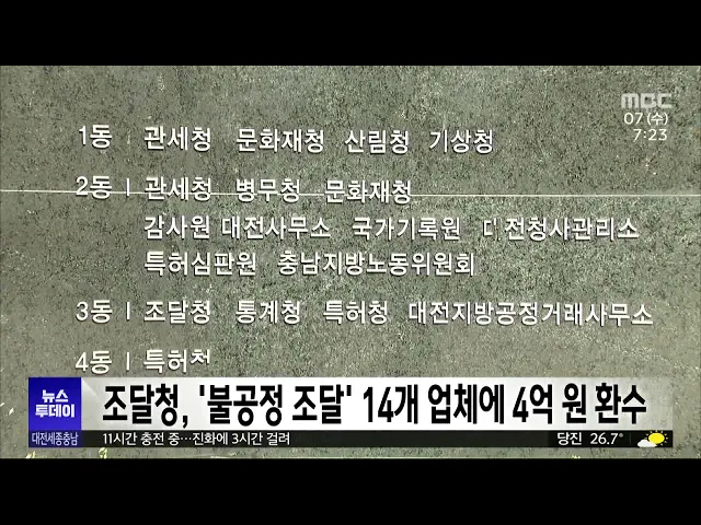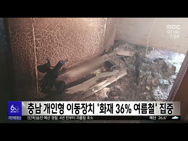 뉴스투데이 뉴스데스크뉴스투데이뉴스데스크 VOD(전체 다시보기)뉴스투데이 VOD(전체 다시보기)유튜브뉴스페이스북 뉴스카카오톡 뉴스인스타그램 뉴스 prev 2024.8.7 - 수요일 next 11시간 충전중이던 전기차에서 불‥ 경찰 "과충전 여부 조사"/투데이 ◀ 앵 커 ▶인천에 이어서 이번에는 충남 금산에서도 전기차 화재가 발생했습니다. 전기차 배터리가 충격을 받았을 때 일어나는 이른바 열폭주 현상때문에 3시간만에야 진화에 성공했습니다.이승섭 기자입... 이승섭 숨진 경찰, 4년 전부터 괴롭힘 호소/투데이 ◀ 앵 커 ▶과도한 업무와 상사와의 갈등을 호소하다숨진 예산 경찰서 20대 경찰 사망 사건. 이를 축소·은폐하려는 충남 경찰의 정황을대전MBC가 단독으로 전해드렸었죠.그런데 이 경찰이 4년 전부터 직장 ... 김성국 '대전 0시 축제' 원도심 도로 일부 전면 통제 오는 9일 개막하는 대전 0시 축제 개최로 오늘 새벽부터 오는 18일 새벽까지 대전 원도심 도로가 일부 통제됩니다. 통제 구간은 중앙로는 대전역부터 옛 충남도청까지, 대종로는 NC백화점부터 으능정이 네... 고병권 대전세종연구원 '대한민국 과학축제' 대전 고정 개최 필요 대전 세종연구원은비수도권 최초로 2년 연속 대전에서 열린대한민국 과학축제를계속 대전에서 개최할 필요가 있다고 주장했습니다.연구원이 발표한 '대한민국 과학축제의 대전 개최 효과 분석'에 따르면,... 고병권 세종보 재가동 중단 천막 농성 100일 기자회견 세종보 재가동 중단과 물정책 정상화를 촉구하는 환경단체들이 천막 농성 100일을 맞아어제 세종보 인근에서기자회견을 열었습니다. 이들은 "고인 물은 썩고 막힌 강은 죽는다"며 당장 보 재가동을 중단할... 박선진 대전시, '맞춤형 돌봄지원 근무제' 시행 대전시가 이번 달부터 0살부터 초등학교 6학년까지 어린 자녀가 있는 시청 소속 공무원 6백여 명을임신기와 육아기, 아동기로 세분화해 근무체계를 운영합니다. 우선 임신기 공무원에게는 주 1회 재택근무... 박선진 대전시 9월까지 반려견 등록 자진신고 기간 운영 대전시가 오는 9월까지, 반려견 등록 자진신고 기간을 운영합니다.동물 등록은 자치구에서 지정한대행업체에 신분증을 지참하고 반려동물과 함께 방문해야 합니다.동물보호법에 따라 가정에서 반려 목적으... 고병권 조달청 '불공정 조달 행위' 적발 14개 업체 4억원 환수결정 조달청이 직접 생산 위반 등불공정 조달 행위가 적발된14개 업체에 대해부당이득금 4억 원 환수를 결정했습니다.적발된 업체 14곳은LED 가로등, 구명조끼 등 18개 품목에서조달 계약과 달리 직접 생산하지... 고병권 충남도 개인형 이동장치 화재 36% 여름철에 집중 충남도에서 최근 5년 동안 전동킥보드 등개인형 이동장치에서 25건의 화재가 발생한 가운데 이중 9건, 36%가여름철인 7월과 8월에 집중된 것으로 분석됐습니다.충남도 소방본부는 전동킥보드 19건,전기자... 김태욱