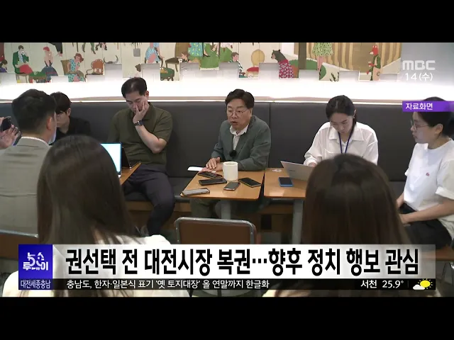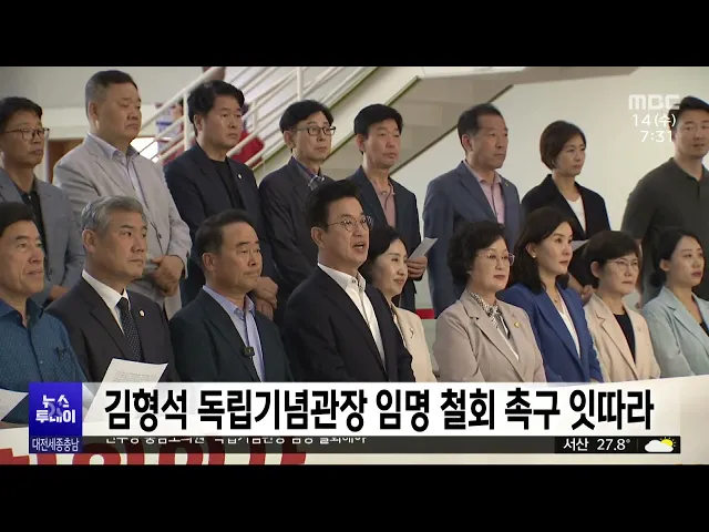 뉴스투데이 뉴스데스크뉴스투데이뉴스데스크 VOD(전체 다시보기)뉴스투데이 VOD(전체 다시보기)유튜브뉴스페이스북 뉴스카카오톡 뉴스인스타그램 뉴스 prev 2024.8.14 - 수요일 next 공무원 유튜버가 뜬다/투데이 ◀ 앵 커 ▶공튜버라는 말 들어보셨나요?유튜브에서 업무나 정책을 소개하는 공무원을 가리키는 신조어인데요.충남의 공튜버들도 유행하는 춤을 따라 추거나, 사투리로 지역 특산물을 활용한 먹거리를 알리... 김태욱 김형석 독립기념관장 임명 철회 촉구 잇따라 허태정 전 대전시장 등 민주당 소속 전·현직 단체장 등 30여 명이 대전시의회에서 기자회견을 열고, "김형석 독립기념관장을 임명한 것은대한민국 근현대사를 부정하는 행위"라며임명 철회를 촉구했습니다... 고병권 오늘 현충원에서 홍범도 장군 귀환 3주년 기념식 홍범도장군기념사업회가 내일 국립대전현충원에서 '광복 79주년 및 홍범도 장군 귀환 3주년 기념식'을 개최합니다.기념식에는 박홍근 홍범도기념사업회 이사장과우원식 국회의장, 광복회 대전지부 회원 등... 이승섭 음주 의심 차량에 20대 보행자 사망‥탑승자 모두 "운전 안 해"/투데이 ◀ 앵 커 ▶음주 운전이 의심되는 차량에 치여횡단보도를 건너던 20대 보행자가 사망했습니다.당시 차량에 타고 있던 3명 중 2명이 만취 상태였는데,3명 모두 자신이 차를 몰지 않았다고 진술해경찰이 조사... 조형찬 여신도 성폭행·강제추행 JMS 정명석 추가 구속 여신도를 상대로 성폭력을 저지른 혐의 등으로 기소된 JMS 총재 정명석 씨가 항소심 구속기간 만료를 이틀 앞두고 다시 구속됐습니다.대전지법 형사11부는 정 씨가 도망갈 염려가 있다며 구속 영장을 발부... 윤소영 '불법 하도급 주고 금품 수수' 전 국가철도공단 기술본부장 기소 대전지검 형사4부는 철도 시설 공사 과정에서 특정 업체에 불법 하도급을 주고, 뇌물을 받은 혐의로 전 국가철도공단 본부장을 구속 기소했습니다.피고인은 지난 2018년부터 4년 동안철도 공사를 낙찰받은... 이승섭 도시도 식품 사막.."온라인 배송 엄두 못 내"/투데이 ◀ 앵 커 ▶지역 소멸 여파로 집 주변에서 신선식품조차구하기 어려운 '식품 사막' 현상과 관련해앞서 농촌의 상황을 짚어봤는데요.식품 사막은 비단 농촌만의 문제가 아니었습니다.식품 사막 기획보도, 오... 윤소영 권선택 전 시장 8.15 광복절 특별사면 확정 권선택 전 대전시장이 광복절 특별 복권 대상에 포함돼 7년 만에 피선거권을 회복하면서 향후 정치 행보에 관심이 쏠리고 있습니다.지역 정가에서는 권 전 시장이 2년 뒤 지방선거나 4년 뒤 총선에 출마하... 고병권 당진시 면천면 특별재난지역 추가 선포 지난달 집중호우로 큰 피해를 본당진시 면천면이 특별재난지역으로 추가 선포됐습니다.당진시 면천면은 지난달 18일부터 이틀간 내린극한 호우로 천백여 건의 피해가 발생해47억 5천만 원의 재산피해가 났... 고병권 지구 지키는 텀블러..'선화보틀' 확산/투데이 ◀ 앵 커 ▶지역의 선한 영향력을 이어가기 위한대전MBC 창사 60주년 기획보도 이음 순서입니다.환경을 위해 대전 원도심에서 시작된 공공 다회용 컵 사용 운동, 이른바 '선화보틀 프로젝트'가 호평을 받으... 박선진 충남경찰, '광복절 폭주족' 강력 단속 충남경찰이 내일 광복절을 앞두고,폭주족이 자주 출몰하는 천안과 아산 일대에서 무관용 원칙으로 폭주족 합동 단속에 나섭니다.또, 광복절 당일에는 예상 집결지를 중심으로인력 480명과 장비 77대를 미... 이승섭 "영하 20도에서도 작동" 이차전지용 음극 소재 개발 영하 20도의 혹한에서도 작동하는 이차전지용 음극 소재가 개발됐습니다.한국에너지기술연구원은 이온의 산화 환원 반응이 용량을 늘린다는 사실을 토대로 기존 이차전지 음극으로 쓰이는 흑연보다 우수한... 김윤미 날숨으로 폐질환 초기 감지 가능 "3년 내 상용화" 내쉬는 숨에 담긴 미세한 산화질소 정보로 폐질환을 초기에 찾아낼 수 있는 기술이 국내에서 개발됐습니다.한국전자통신연구원은 기존 폐질환 진단에 쓰이는 각종 장비를 하나의 장치로 통합해 기도 염증 ... 김윤미 대통령배 전국 아마추어 e스포츠 대회 17~18일 아산에서 열려 충남도가 오는 17일부터 이틀 동안아산시 이순신체육관에서 제16회 대통령배전국 아마추어 e스포츠 대회를 개최합니다.이번 대회는 전국 16개 지역에서 예선을 통과한 선수들과 관계자 등 5백여 명이 참가... 김태욱 충남도서관, 오는 20일부터 로봇 체험·전시 프로그램 운영 충남도서관이 오는 20일부터 다음 달 1일까지기획전시실에서 로봇 체험·전시 프로그램을 운영합니다. 충남도서관은 인공지능 로봇 리쿠 체험을 비롯해 다양한 로봇 15점을 전시하고, 오는 21일에는 초등학... 김태욱
