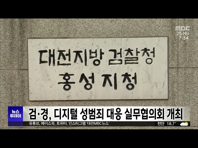 뉴스투데이 뉴스데스크뉴스투데이뉴스데스크 VOD(전체 다시보기)뉴스투데이 VOD(전체 다시보기)유튜브뉴스페이스북 뉴스카카오톡 뉴스인스타그램 뉴스 prev 2024.9.25 - 수요일 next 대전 유성구 부동산 '꿈틀'?/투데이 ◀ 앵 커 ▶대전의 재개발 사업 가운데 하나인 장대 B 구역이 사업 시행 인가를 받으면서 추진에 속도가 붙을 것으로 보입니다.최근 문을 닫은 유성호텔에도 고급주상복합 시설이 들어설 전망이라, 유성 구... 박선진 '공직선거법 위반' 박경귀 아산시장 다음 달 8일 대법원 선고 공직선거법을 위반한 혐의로 재판에 넘겨져파기환송심에서 당선무효형을 선고받은박경귀 아산시장의 대법원 선고 공판이다음 달 8일에 열립니다.박 시장은 2년 전 지방선거 당시상대 후보였던 오세현 전 ... 이승섭 경찰, '성추행 혐의' 송활섭 대전시의원 송치 지난 2월, 총선 후보 캠프의 여직원을여러 차례 성추행한 혐의를 받는송활섭 대전시의원이 검찰에 넘겨졌습니다.대전 대덕경찰서는 송 의원에게강제추행 혐의를 적용해 불구속 상태로송치했다고 밝혔습니... 이승섭 대전 대덕구의회 두달 여 만에 의장 선출 대전 대덕구의회가지난 7월 임기 후반기가 시작된 지두 달여 만에야 후반기 의장을 선출했습니다.대덕구의회는 어제 제1차 본회의를 열고무소속 전석광 의원의 의장 선임안에 대해재적의원 8명 가운데 출... 고병권 20개월 아이 학대 정황..'육아휴직'인데 퇴사했다?/투데이 ◀ 앵 커 ▶대전의 한 어린이집에서 보육 교사가 생후 20개 월 아이를 학대했다는 신고가 경찰에 접수됐습니다.그런데, 어린이집 측이 가해 교사가 퇴사했다고알리고도 정작 육아 휴직을 보내사건을 무마하... 김성국 검찰, 고 이예람 중사 '성범죄 피해' 삭제 보고 무죄에 상고 검찰이 고 이예람 중사 사망 사건을처음 국방부에 보고할 때 '성범죄 피해자'라는사실을 삭제하도록 지시한 혐의로 기소된전 공군본부 군사경찰단장에게 무죄를 선고한항소심 판결에 불복해 상고했습니다.... 이승섭 검경 수사실무협의회, 디지털 성범죄 등 허위 영상물 범죄 협력 대전지방검찰청과 대전지검 홍성지청이대전과 세종, 충남경찰청과 함께딥페이크 기술을 악용한 디지털 성범죄에대응하기 위한 검경 수사 실무협의회를열었습니다.검경은 영리 목적이나 아동·청소년을대상... 이승섭 세종시 "국제정원박람회 등 예산 통과" 촉구 국제정원 도시박람회 등최민호 세종시장의 공약사업 예산이 시의회에서 두 번 연속 제동이 걸린 가운데,세종시가 호소문을 내고 조속한 예산 통과를촉구했습니다.세종시는 이달 초 시의회에 제출한빛 축제... 고병권 "후원금까지" 장애인 시설 횡령 의혹/투데이 ◀ 앵 커 ▶시민 후원금과 대전시의 예산 지원을 받는 한 사회 복지 시설에서 비리 의혹이 불거졌습니다.시설 자금을 횡령하고,일하지도 않은 법인 이사장 가족에게월급을 줬다는 의혹인데요.대전시는 비리 ... 윤소영 예산종합병원, 지역응급의료기관 재지정 예산군이 2년 전 전문인력 부족 등을 이유로지정서를 반납했던 예산종합병원을지역응급의료기관으로 다시 지정했습니다.군은 병원 측과 수차례 면담을 통해지역응급의료기관 지정 신청을 요청해 왔으며,이... 김태욱 충남지역 경기 확장기 진입.. 소비·고용 위축은 과제 정보통신 중심의 생산과 수출이 회복돼충남의 경기가 확장기에 진입했다는 분석이나왔습니다.충남도는 제2차 경제 상황 관리 회의를 열고지역 경기가 확장기에 진입했지만, 중소기업의 회복력 둔화와 더딘... 김태욱 김태흠 지사, 미국에서 글로벌 메탄 감축 로드맵 제안 3박 6일 일정으로 미국 뉴욕 출장길에 오른김태흠 충남지사가 2030 글로벌 메탄감축 전략 토론에 참석해 메탄 감축에 대한 로드맵 수립을 제안했습니다.김 지사는 2030년까지 메탄 35% 감축을 목표로 추진... 김태욱 한화 이글스, 29일 NC전 한화생명이글스파크 마지막 홈경기 프로야구 한화이글스가 대전 한화생명이글스파크에서 치르는마지막 프로야구 정규리그 경기가 오는 29일,NC다이노스와의 경기로 확정됐습니다한화는 이날, 한화생명이글스파크에서 열리는 마지막 홈경기를... 이승섭 충남도, 다음 달 1일부터 구제역 백신 일제 접종 충남도가 다음 달 1일부터 14일까지 도내 농가에서 사육 중인 소와 염소 57만여 마리를 대상으로 구제역 백신 일제 접종에 나섭니다.도는 50마리 미만 소와 300마리 미만 염소 사육농가는 직접 접종을 지... 김태욱 당진시, 보물 '영탑사 금동비로자나불삼존좌상' 봉안식 보물 409호인 당진시 영탑사 금동비로자나불삼존좌상이 새로 건립한보호각 비로전으로 옮겨져 봉안식을거행됐습니다. 시는 이번 봉안으로 당진을 대표하는 보물인 불상을 시민들과 불교 신도들이 더 가까... 박선진 천안시, '유관순 열사 추모제' 거행 천안시가 이번 주 토요일(28) 병천면유관순 열사 사적공원에서 '순국 104주기유관순 열사 추모제'를 거행합니다.추모제는 유족 등 5백여 명이 참석한 가운데추념사 낭독과 헌화·분향 등이 진행될예정이며,... 박선진
