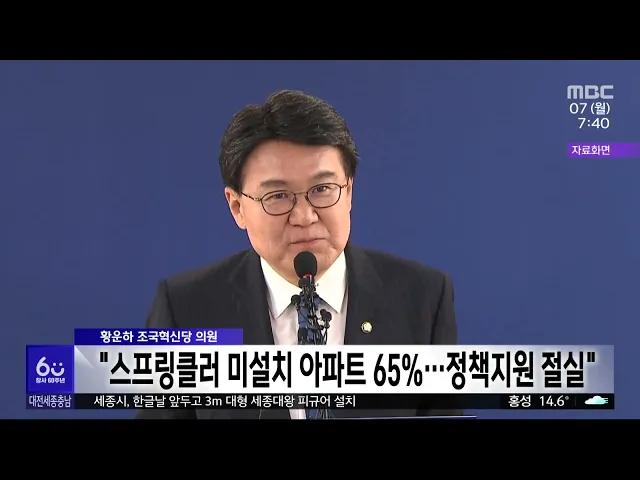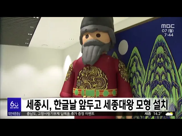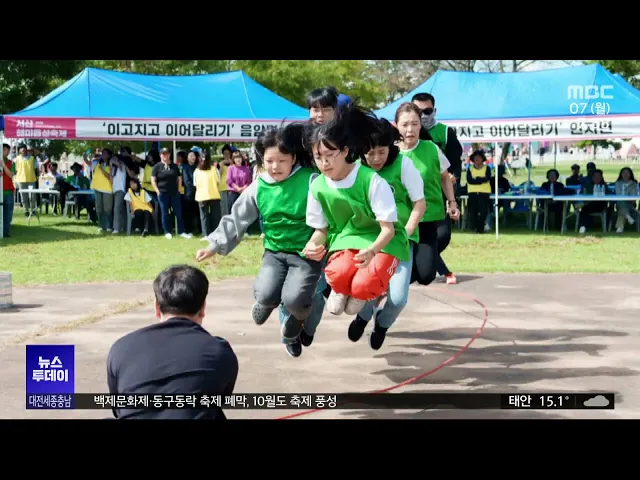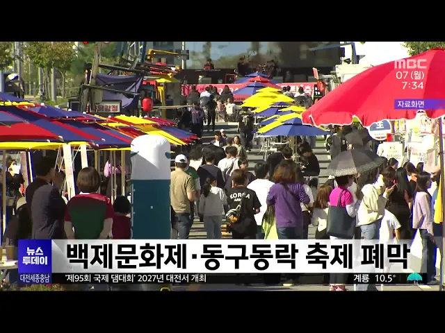 뉴스투데이 뉴스데스크뉴스투데이뉴스데스크 VOD(전체 다시보기)뉴스투데이 VOD(전체 다시보기)유튜브뉴스페이스북 뉴스카카오톡 뉴스인스타그램 뉴스 prev 2024.10.7 - 월요일 next 최민호 세종시장 단식 돌입..."예산 부활 필요"/투데이 ◀ 앵 커 ▶최민호 세종시장이 어제부터 국제정원박람회 예산 부활을 촉구하며 엿새 간의 단식 농성에 돌입했습니다.이미 세종시의회가 두 차례나 관련 예산 전액을 삭감한 전례가 있어, 효과가 미지수인데,... 윤소영 백제문화제·동구동락 축제 폐막, 10월도 축제 풍성 제70회 벡제문화제가 공주시에서 폐막식을 끝으로, 어제 9일 간의 일정을 마무리했습니다. 폐막식에 참석한 김태흠 충남지사는 공주와 부여를 중심으로 해상왕국, 문화강국 백제를 잇고, 역사문화 관광도... 조형찬 '제21회 서산해미읍성 축제' 27만 명 방문 집계 지난 2일부터 사흘 동안 열린 제21회 서산 해미읍성축제에 관광객 27만여 명이 다녀간 것으로 집계됐습니다.이는 축제를 개최한 이래 역대 최대치로, 서산시는 선조들의 지혜를 엿볼 수 있는 다양한 체험 ... 윤소영 최근 5년간 0세 신생아 증여 재산 '2천 7백억 원' 최근 5년 동안 0세 신생아에게 증여된 재산이 2천7백억 원에 달하는 것으로 나타났습니다.국세청이 박성훈 국민의힘 의원실에 제출한 자료를 보면, 증여세를 신고한 0세 신생아는 2천8백여 명으로, 1인당 ... 윤소영 땅굴 파 송유관 석유 훔치려던 일당 징역형 대전지법 제11형사부는 지하에 있는 송유관에서 기름을 훔치려고 한 혐의로 재판에 넘겨진 일당 2명에게 각각 징역 5년과 4년을 선고했습니다.이들은 지난 2월부터 넉 달 동안 천안 도심에 있는 창고를 임... 윤소영 황운하 "스프링클러 미설치 아파트 65%..정책지원 절실" 아파트의 3분의 2가량이 스프링클러가 설치되지 않아 화재 시 인명피해 우려가 큰 것으로 나타났습니다. 국회 국토교통위원회 조국혁신당 황운하 의원이 소방청으로부터 받은 자료에 따르면, 전국 아파트 ... 조형찬 '윤문식의 싸가지 흥부전' 대전시립연정국악원서 상연 배우이자 마당놀이 인간문화재 윤문식이 출연하는 '윤문식의 싸가지 흥부전'이 오는 18일과 19일 세 차례에 걸쳐 대전시립연정국악원에서 상연됩니다. 이번 흥부전은 원작을 재해석해 나눔에 인색한 놀부... 조형찬 충남도, 고향사랑기부제 답례품 추가 증정 이벤트 충남도가 고향사랑기부제 답례품을 추가로 증정하는 이벤트를 진행합니다.충남도는 오늘부터 오는 27일까지충남과 9개 시군에 고향사랑기부를 하고, 감태와 알밤 등 20개 답례품 가운데 하나를선택한 신청... 윤소영 세종시, 한글날 앞두고 3m 대형 세종대왕 피규어 설치 한글날을 앞두고 세종시 국립박물관단지에 3m 규모의 대형 세종대왕 모형이 들어섰습니다.세종시는 10월 한 달간 열리는 '한글문화특별기획전'을 기념해 독일 완구회사와 협업으로, 국립박물관단지 통합... 윤소영 '제95회 국제 댐대회' 2027년 대전서 개최...경제효과 43억 원 2027년에 열리는 '제95회 국제 댐대회' 개최지가 대전으로 최종 확정됐습니다.국제 댐 대회는 세계 최대 규모의 댐 기술과 운영 정보 등을 공유하는 행사로, 한국 수자원 공사는 최근 인도 뉴델리에서 열... 윤소영