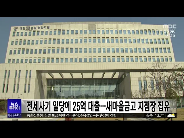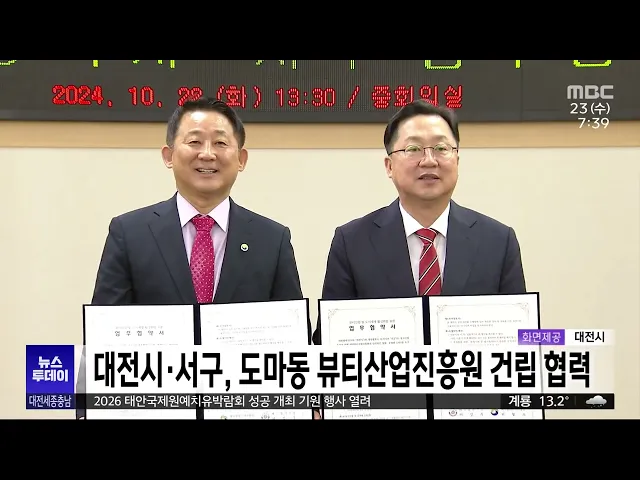 뉴스투데이 뉴스데스크뉴스투데이뉴스데스크 VOD(전체 다시보기)뉴스투데이 VOD(전체 다시보기)유튜브뉴스페이스북 뉴스카카오톡 뉴스인스타그램 뉴스 prev 2024.10.23 - 수요일 next "내가 잘못 살았나?"...40도 넘어도 선풍기만 '정규직과도 차별'/투데이 ◀ 앵 커 ▶ 한국타이어 하청업체 직원들이 안전에 심각한 위협을 받고 있다며 기자회견을 열었습니다. 분진과 화학물질이 가득한 현장에서방진 마스크에만 의존해 근무를 하고 있는데특히 정규직 직원들과 ... 조형찬 열차 중단 없이 공사?코레일 직원 4명 직위 해제 대전시 대덕구 대전조차장역에서 관제 실수로 대형 사고가 발생할 뻔 한 것으로뒤늦게 밝혀졌습니다.코레일에 따르면, 지난 7일 관제 실수로 운행을 허가받은 무궁화호 열차가 50여 명이 배치된 대전조차... 조형찬 세종 종합체육시설 공사 네 번째 유찰…충청권 U대회 '차질' 오는 2027년 충청권 하계세계대학경기대회를 치를 세종시 종합체육시설 건립 공사가 네 번째 유찰돼 대회 개최 전 완공이 불가능하다는 관측이 나오고 있습니다.행정중심복합도시건설청 등에 따르면,최근 ... 김윤미 갈비뼈 골절됐는데 당뇨?...교도관 집단 폭행 의혹/투데이 ◀ 앵 커 ▶대전교도소에서 50대 재소자가 교도관들에게집단 폭행을 당해 갈비뼈가 부러지고 장기가 파열되는 중상을 입어 교정당국이 조사에 나섰습니다.교도소 측은 그러나, 피해자 측에 폭행이 아닌 당뇨... 김성국 천안 전세사기 일당에 25억 대출한 새마을금고 지점장 집행유예 대전지법 천안지원 형사 1부 전경호 부장판사는천안에서 전세사기 일당에게 25억 원가량의불법 대출을 한 혐의로 재판에 넘겨진50대 새마을금고 지점장에게 징역 2년 6개월에 집행유예 3년을 선고했습니다... 김태욱 보상금 17억 가로챈 천안시 공무원 2심도 징역 7년 대전고법 제1형사부 박진환 판사가서류를 조작해 17억 원가량의 토지보상금을가로챈 혐의로 기소된 천안시 공무원에 대한항소심에서 징역 7년과 벌금 4천만 원, 10억 7천여만 원을 추징한 1심 판결을유지... 김태욱 '감투싸움에 내홍'...대덕구의회 '일 안 하나?'/투데이 ◀ 앵 커 ▶대전 기초의회 가운데 유일하게 후반기 원 구성을 마치지 못한 곳이 있습니다.바로 대덕구의회인데요.의장은 간신히 뽑았지만, 상임위원회는 여전히 구성되지 않았고,의장 선출 과정에서 불거진 ... 이승섭 유성복합터미널 중앙투자심사 통과.."연내 착공, 내년 말 준공" 대전 유성복합터미널 건립 사업이 정부의 중앙투자심사를 최종 통과해 내년 말 준공에 청신호가 켜졌습니다.대전시는 456억 원을 들여 대전도시철도 1호선 구암역 인근에 연면적 3,700㎡ 규모의 여객시설 ... 조형찬 대전시-서구, 뷰티산업진흥원 건립 위해 맞손 대전시와 서구가 대전뷰티산업진흥원 건립과 도시재생 활성화를 위해 협력하기로 했습니다.민선 8기 공약인 대전뷰티산업진흥원은대전 도마동에 건립될 예정으로뷰티산업 전문 인력 양성 등 이·미용 분야 ... 김광연 "김장 배춧값 방제·날씨 관건"/투데이 ◀ 앵 커 ▶여름부터 계속된 배춧값 고공행진이다음 달 본격적인 김장철을 앞두고까지 이어지고 있습니다.폭염과 집중호우로 작황도 나쁜데산지 해충 피해에 11월 이른 추위도 예보돼가격 변동에 변수로 꼽... 문은선 '국내 최대 와인의 향연' 대전국제와인엑스포 27일 개막 국내 최대 와인 행사인 대전국제와인엑스포가 오는 27일부터 다음 달 3일까지대전컨벤션센터와 한빛탑 등지에서 열립니다.이번 행사에는 주빈국인 헝가리를 비롯해 17개 나라에서 230여 개 회사가 참여하... 김광연 대천해수욕장서 26∼27일 보령 김 축제 보령 김 축제가 오는 26일과 27일 이틀간대천해수욕장 머드광장 일원에서 펼쳐집니다.이번 축제에서는 90m에 이르는 김밥 만들기와 김 뜨기, 김 말리기, 김 굽기 등 체험행사가 마련되고, 제철 수산물 할... 조형찬 카이스트 교수협의회 총장 예비 후보 투표 돌입 내년 2월 제18대 카이스트 총장 선출을 앞두고교수협의회가 어제부터총장 후보 선임 위원회에 추천할 예비 후보2명을 뽑기 위한 투표에 들어갑니다.이번 투표는 배충식, 김정호, 류석영 교수 등3명을 대상... 고병권