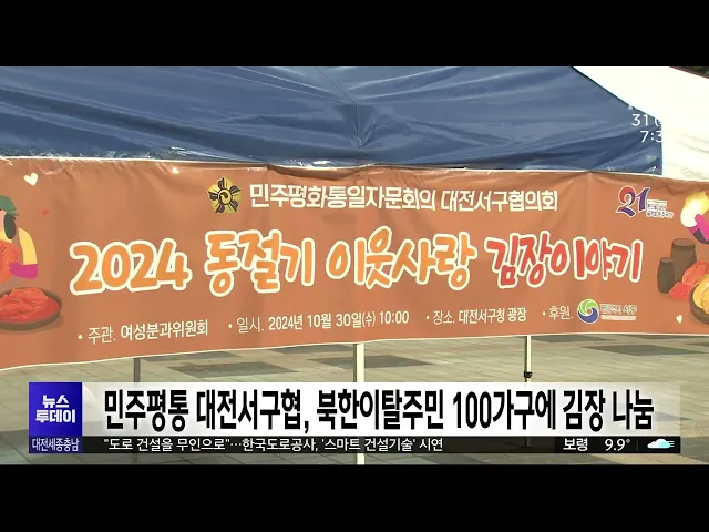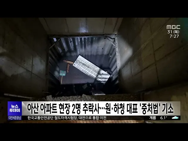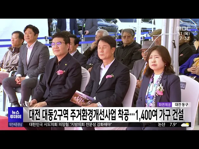 뉴스투데이 뉴스데스크뉴스투데이뉴스데스크 VOD(전체 다시보기)뉴스투데이 VOD(전체 다시보기)유튜브뉴스페이스북 뉴스카카오톡 뉴스인스타그램 뉴스 prev 2024.10.31 - 목요일 next 해외 수학여행 사전답사...실상은 가족여행?/투데이 ◀ 앵 커 ▶오늘은 단독 보도로 시작합니다.지역 소멸로 통폐합되는 농촌 학교에는 정부가 기금을 투입해 학생들의 교육 여건 개선에 나서고 있는데요.그런데, 공주의 한 초등학교 교장이학생들을 위해 써야... 윤소영 검찰, 아산 공사현장 2명 추락사 원·하청 대표 중처법 기소 대전지검 천안지청이 지난 2022년 아산시 아파트 공사현장에서 발생한하청업체 노동자 2명 추락사와 관련해 원청과 하청업체 대표 등 2명을 중대재해처벌법 위반 혐의로 기소했습니다.검찰은 두 회사가 추... 김태욱 대기발령 충남경찰 간부, 음주운전 방조 혐의로 송치 청탁금지법 위반 혐의로 검찰에 넘겨져 지난 5월부터 대기발령 중이던 충남경찰청 소속 40대 간부가 음주 운전 차량을 함께 타고 가다 사고가 나자, 자신이 운전했다고 거짓 진술한 혐의로 검찰에 추가 송... 김성국 정년연장 어떻게 생각하십니까?/투데이 ◀ 앵 커 ▶행정안전부가 소속 공무직의 정년을65살까지 늘리기로 하면서 정년 연장 이슈가 뜨거워졌습니다.초고령 사회 진입을 앞둔 충청권도예외는 아닌데요.하지만 경제계는 물론 처한 상황에 따라의견은... 문은선 대전시, 내년도 국비 확보 위해 국회 캠프 설치 대전시가 내년 국비 확보를 위해 다음 달부터 서울 여의도 대외협력본부에 국회 캠프를 설치합니다.앞서 내년 국비 확보 목표액을 4조 4천억여 원으로 잡은 대전시는 도시철도 2호선 트램 시설비와 사정교... 김광연 대전 대동2구역 주거환경개선사업 기공식 개최 대전 동구와 한국토지주택공사가 어제, 노후 주택이 많은 대동2구역을 아파트 단지로개선하기 위한 첫 삽을 떴습니다.대동2구역 주거환경개선사업은 대동과 용운동 일대의 부지 10만여㎡에 공동주택 천4백... 이승섭 대전 도안 2-2지구에 초등학교·중학교 신설 확정 오는 2027년 하반기부터 4천 가구가 넘는 공동주택 입주가 이뤄질 도안 2-2지구에 초등학교와 중학교 신설이 추진됩니다.대전시교육청은 가칭 학하2초등학교와 학하중학교 등 학교 2곳의 설립 계획이 교육... 김윤미 슈퍼컴퓨터 핵심 '가속기 칩' 기술 개발/투데이 ◀ 앵 커 ▶고정밀 연산을 해내는 슈퍼컴퓨터는기후 예측, 신약 개발 등에 쓰이며수요 분야가 급격히 증가하고 있는데요.국내 연구진이 슈퍼컴퓨터 제조의핵심인 가속기 칩 기술을 확보해 세계 5번째 제조... 박선진 공주시, 국내 투자 전문업체와 투자 유치 업무 협약 공주시가 국내 투자 전문업체인한국투자파트너스와 우수 기업의 투자를유치하기 위한 업무 협약을 체결했습니다.두 기관은 우수 기업의 정보를 교류하고,행정과 재정을 지원해공주시에서 조성하고 있는 스... 이승섭 민주평통대전서구협, 북한이탈주민 100가구에 김장 나눔 민주평화통일자문회의 대전서구협의회가 대전 서구청 광장에서 이웃사랑 김장 나눔 행사를 개최했습니다.이번 행사에는 서철모 대전 서구청장과 민주평통 서구협 자문위원 등 80여 명이 참여했으며, 김치... 김태욱 수공 대청댐지사, 주민과 함께 '청초동음 음악회' 개최 한국수자원공사 대청댐지사는 대청댐 물문화관 야외 광장에서 댐 주변 지역 주민들과 함께 하는가을음악회 '청초동음' 콘서트를 개최했습니다. 이번 음악회에는 댐 주변 5개 초,중학교 학생들이 대청 첼로... 조형찬 120년의 인연 '대전과 철도'/투데이 ◀ 앵커 ▶1904년 경부선 대전역이 생긴 뒤 대전과 철도는 무려 120년 동안 동반성장을 해왔는데요.전 세계에서 유례를 찾아볼 수 없을 정도의대전과 철도의 특별한 인연을 담아낸 특집 다큐멘터리 철도 르... 고병권 철도자격시험장 대전으로 통합 이전 한국교통안전공단 철도자격시험장이중구 오류동에 문을 열었습니다.공단 측은 시험장의 접근성 등을 고려해경기도 의왕과 경북 김천에서 열리던 철도자격시험을 대전으로 통합해 시험장을 이전했다고 설명... 이승섭 2026년까지 세종에 복합커뮤니티센터 3곳 추가 건립 오는 2026년까지 세종시 신도심에 주민센터와 도서관 등을 한곳에 모아놓은복합커뮤니티센터 3곳이 추가로 건립됩니다.행정중심복합도시건설청은현재 운영 중인 15곳을 비롯해 4생활권인 집현동과 6생활권... 김윤미 "무인 중장비로 안전하게" 스마트건설 도입/투데이 ◀ 앵 커 ▶각종 공사 현장마다 인력 부족과 안전사고는 오랜 고민인데요.이런 문제를 해결하기 위해무인 중장비가 공사를 하고드론과 로봇이 안전관리를 책임지는 '스마트 건설 기술'이 국내에 처음으로 도... 김성국 민주당 일부 논산시의원 "해당 행위 경징계한 윤리위 규탄" 민주당 소속인 논산시의원 4명이후반기 의장 선출 과정에서 같은 당 시의원 3명에게 경징계를 내린 민주당 충남도당 윤리위원회를 규탄했습니다.서원, 조배식 논산시의원 등은 성명에서, 윤리위가 해당 행... 이승섭 예산군 의회 정상화 수순...다음 달 4일 의장·부의장 재선거 의장·부의장 선거 정족수 미달 논란으로 법적 