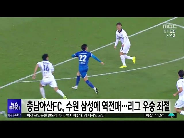 뉴스투데이 뉴스데스크뉴스투데이뉴스데스크 VOD(전체 다시보기)뉴스투데이 VOD(전체 다시보기)유튜브뉴스페이스북 뉴스카카오톡 뉴스인스타그램 뉴스 prev 2024.11.1 - 금요일 next 펄로 뒤덮인 국가 명승지 고마나루/투데이 ◀ 앵 커 ▶국가 명승지 고마나루 일대에 넓게 펼쳐진 백사장은 관광객을 비롯해물떼새들이 거니는 휴식처인데요.그런데, 지난 백제문화제 기간 공주보 수문을 닫자 불과 20여 일 만에심각한 악취와 함께 사... 김태욱 '탑 위에 탑' 공주 마곡사 오층석탑 국보로 승격 탑 위에 탑을 쌓은 양식을 갖춘 공주 마곡사 오층석탑이 국보로 승격됩니다.고려 후기인 14세기 때 만든 마곡사 오층석탑은 기단을 2단으로 쌓고 그 위에 5층의 몸체를 올린 뒤 '풍마동'이라고도 불리는 1... 김윤미 부여 석성동헌 탱자나무, 천연기념물 지정 조선 시대인 1628년 부여군 석성면에 옮겨 심어진 것으로 추정되는 탱자나무가천연기념물로 지정됐습니다.조선 시대 관청인 석성동헌 앞마당에 심어진탱자나무는 형벌의 일종인 위리안치의 증거로역사적 ... 이승섭 공동관리아파트 개발 방향 선회?/투데이 ◀ 앵 커 ▶대전의 노른자위인 곳에서 10년 넘게 방치된낡은 아파트 단지가 있습니다.바로 대전 대덕특구 공동관리아파트인데요.애초 대전시가 과학기술 관련 시설을 설치해신산업거점으로 활용하려고 했지... 김광연 대전 대덕구의회, 부의장 선출..오늘 원 구성 마무리할 듯 의원 간의 갈등으로 원 구성에 파행을 빚던대전 대덕구의회가 부의장으로 선출하고, 원 구성의 돌파구를 마련했습니다.대덕구의회는 어제 임시회 본회의에서만장일치로 조대웅 의원을 부의장으로 선출하고... 이승섭 세종시 정원박람회 2026년 가을 변경 개최...의회 통과 미지수 세종시가 시의회의 예산 삭감으로 무산 위기에 놓인 정원도시박람회를 애초 2026년 봄에서 가을로 개최 시기를 변경해 추진하기로 했습니다.세종시는 이를 위해 10여 일 뒤 열리는 세종시의회 정례회에 제... 김지훈 세종빛축제 시민추진단 구성..."시민 모금으로 축제 개최" 금강수변상가번영회 등 세종 지역 11개 단체로구성된 세종시 빛축제 시민추진단이 "시의회의 예산 6억 원 전액 삭감으로 폐지 위기에 놓인 빛축제를 시민의 모금을 통해 개최하겠다"고 밝혔습니다.세종 빛... 김지훈 대전교도소 교도관 집단 폭행 "또 있었다"/투데이 ◀ 앵 커 ▶대전교도소 교도관들이 재소자를 의식을 잃을 때까지 폭행하고 당뇨병으로 은폐하려 했던 사건, 대전MBC 연속 보도 이어갑니다.취재진이 어렵게 접촉한 폭행 피해 재소자는사건 당시를 떠올리며 ... 김성국 검찰, 박완주 전 민주당 의원 징역 5년 구형 보좌관을 성추행한 혐의 등으로 기소된 박완주 전 국회의원에게 검찰이 징역 5년을 구형했습니다. 그제 서울남부지법에서 열린 결심 공판에서 검찰은 "피고인이 취약한 지위의 피해자를 상대로 범행했고, ... 고병권 충남아산FC, 수원 삼성에 역전패..리그 우승 좌절 K리그2 충남아산FC가 수원 삼성에 덜미를 잡혀리그 우승이 좌절됐습니다.충남아산은 그제, 용인 미르스타디움에서열린 수원 삼성과의 경기에서 후반 추가시간에 수원 김상준에게 결승골을 허용해 1대2로 ... 이승섭 충청광역연합의회 의정 설명회..12월 17일 첫 임시회 대전시와 세종시, 충남도와 충북도가 모인충청광역연합의회가 연말 출범을 앞두고,어제, 세종시에서 의정 설명회를 개최했습니다.충청광역연합의회는 4개 시도의회에서 의원 4명씩 모두 16명으로 구성돼 ... 이승섭 금강 미술대전 초대작가 특별전 개막 대전MBC와 공주시가 공동 주최하는 '금강미술대전 초대작가 특별전'이공주시 반포면 아트스페이스 특별 전시장에서 개막했습니다.대전MBC 창사 60주년과 금강 미술대전 개최40주년을 기념하는 이번 전시는... 고병권 세종 첫 동계 체육시설 '반다비 빙상장' 11월 개장 세종시 첫 동계 체육시설인 '반다비 빙상장'이 이번 달 임시 개장에 이어 12월 중 정식 운영을 시작합니다.빙상장은 세종동 세종중앙공원 부지에 연면적 4천600여 제곱미터, 지하 1층, 지상 2층 규모로 조... 김윤미 보령·당진시 '탄소중립 선도도시' 최종 선정 정부가 2030년까지 총 10곳을 조성할 계획인 탄소중립 선도도시로 보령시와 당진시가 최종 선정되면서 1차 대상지 4곳 중 충남에서 두곳이 포함됐습니다. 환경부와 국토교통부가 주관한 탄소중립 선도도시... 최기웅 충남도, 집단 폐사 바지락 양식장에 35억 지원 지난 여름 고수온 등의 영향으로 서해안 일대에서 바지락 집단 폐사가 발생한 가운데 충남도가 복구비를 지원합니다. 도는 34억 9천여만 원의 예산을 폐사한 바지락 수거와 처리 작업 등 어장 복구비로 지... 최기웅 대전 사정교 ~ 한밭대교 도로 건설 사업 예타 통과 대전 사정교와 한밭대교를 잇는 도로 건설 사업이 정부의 예비타당성조사를통과했습니다.이 사업은 대전시 중구 사정동에서 대덕구 오정동까지 7.61km 구간에 왕복 4차로 도로를 개설하는 것으로오는 2031... 이승섭