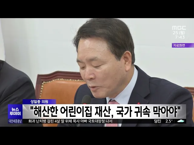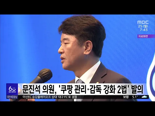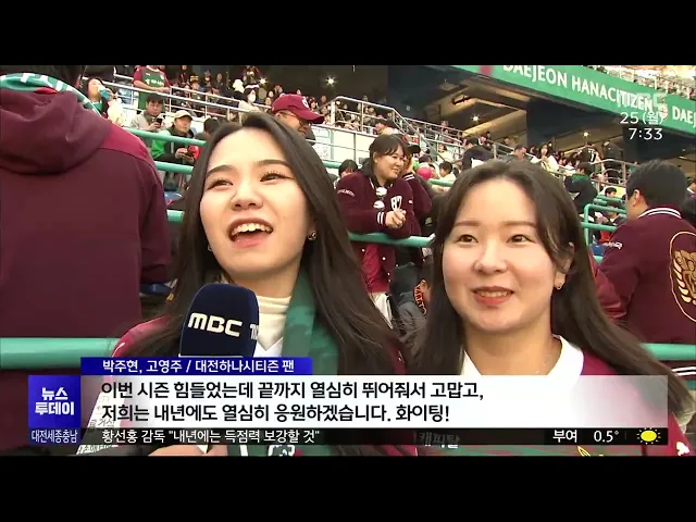 뉴스투데이 뉴스데스크뉴스투데이뉴스데스크 VOD(전체 다시보기)뉴스투데이 VOD(전체 다시보기)유튜브뉴스페이스북 뉴스카카오톡 뉴스인스타그램 뉴스 prev 2024.11.25 - 월요일 next '최종전 역전승' 대전하나시티즌 8위/투데이 ◀ 앵 커 ▶K리그1 대전 하나시티즌이 제주와의시즌 최종전에서 역전승을 거두면서 리그 8위로 시즌을 마감했습니다.올 시즌 한때 리그 최하위까지추락했지만, 막판 무패 행진을 이어가며 유종의 미를 거둔... 김성국 충남도, 겨울철 대비 '추계도로정비' 마쳐 충남도는 겨울철을 앞두고올여름 집중 호우와 태풍 등으로 파손된 도로와 시설물을 복구하는 도로정비를 마쳤다고밝혔습니다. 도는 위임국도인 32호와 40호지방도 602호, 609호 등 26.3km구간에 걸쳐 도로... 김성국 국내 인공지능 보안기슬 특허출원 건수 세계 3위 국내 인공지능 보안기술 특허출원 건수가 세계 3위인 것으로 나타났습니다. 특허청이 지난 2012년부터 10년간 주요국의 인공지능 보안기슬 특허출원 현황을 분석한 결과, 우리나라는 2021년 1천 492건으로... 고병권 한국예술영재교육원 세종캠퍼스 교육생 65명 모집 한국예술종합학교 부설 한국예술영재교육원 세종캠퍼스가다음 달 2일부터 5일까지내년도 예술 영재 교육생 65명을 모집합니다.모집 분야는 음악 31명을 비롯해 무용 15명, 전통예술 19명 등으로,충청권 초... 김윤미 논산시 내년 예산 1조768억 원 편성…성장동력 확보 논산시가 올해보다 80억 원 증가한 1조768억원 규모의 내년도 예산안을 편성했습니다.신규 사업으로는 강경도시가스 보급 사업 77억 원, 복합문화체육센터 건립 63억 원, 탑정호 휴양 관광단지 사업 45억 ... 김지훈 예산군, 내년 예산안 8천742억 원 편성…올해보다 1천75억 원↑ 예산군이 올해보다 천75억 원 늘어난 8천742억 원 규모의 내년도 예산안을 편성해 군의회에 제출했습니다.주요 내용을 보면, 충남형 스마트팜 복합단지 조성에 237억 원, 덕산온천 휴양마을 조성47억 원, ... 김지훈 문진석 의원, '쿠팡 관리·감독 강화 2법' 발의 문진석 더불어민주당 의원이 택배물류회사에 대한 정부의 감독 강화와 함께, 물류 사업장에 냉·난방시설을 설치하도록 하는 내용의 '쿠팡 관리·감독 강화 2법'을 대표 발의했습니다.이들 법안에는 노동자... 김성국 성일종 의원, 법인 배려 '영유보육법 개정안' 발의 국민의힘 성일종 의원이사회복지법인 어린이집이 문을 닫을 때잔여 재산의 국가 귀속을 막고유사한 목적의 법인에 출연할 수 있도록 하는내용의 '영아 보육법' 개정안을대표 발의했습니다.개정안에는 저출... 김성국