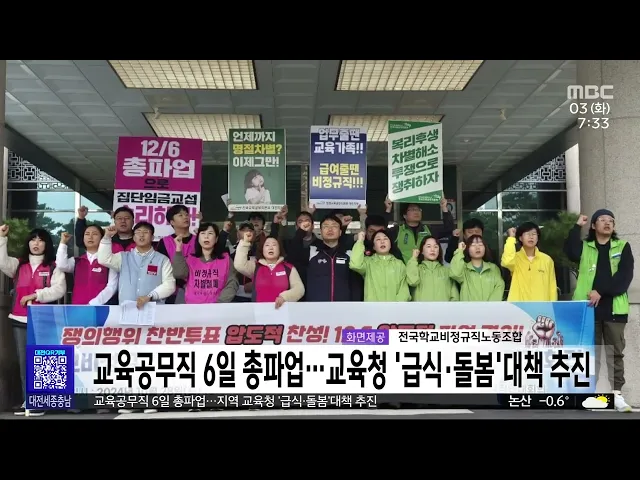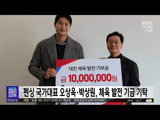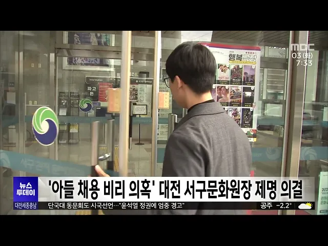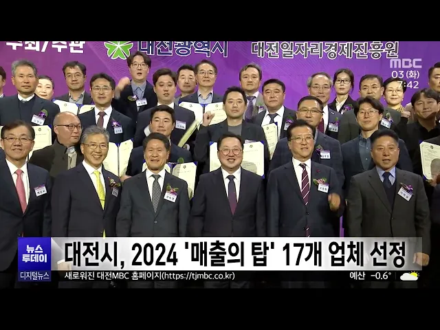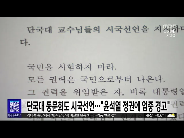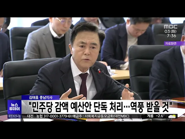 뉴스투데이 뉴스데스크뉴스투데이뉴스데스크 VOD(전체 다시보기)뉴스투데이 VOD(전체 다시보기)유튜브뉴스페이스북 뉴스카카오톡 뉴스인스타그램 뉴스 prev 2024.12.3 - 화요일 next "동물도 함께해요" 사랑의 온도탑/투데이 ◀ 앵 커 ▶지난여름 폭염과 폭우부터최근 폭설까지 취약 계층에게는 올해가 특히 더 힘든 한 해인데요.올해도 이런 어려운 이웃에게 온정을 나누는 '희망 2025 나눔 캠페인'이 시작됐는데,충남에서는 반려... 김성국 2차 공공기관 이전 내년으로 또 연기..시민사회 반발 정부가 수도권에 본사를 둔 공공기관의2차 지방 이전을 내년으로 또다시 연기하겠다는뜻을 밝히자, 시민사회단체가 강력하게반발하고 있습니다.충청권을 포함한 비수도권 시민사회단체는 어제 성명을 내고... 이승섭 단국대 동문회도 시국선언 "윤석열 정권에 엄중히 경고" 충청권 대학교수들의 시국선언이 최근 잇따르는 가운데 단국대 동문회도윤석열 대통령의 퇴진을 촉구하는 시국 선언문을 발표했습니다.단국대 천안교정 민주동문회 2백여 명은지난달 29일 단국대 교수 135... 김윤미 충남대-공주대 통합! 한밭대는?/투데이 ◀ 앵 커 ▶내년 정부의 글로컬대학30 추가 지정을 앞두고충남대와 공주대가 통합을 추진합니다.과거 두 차례 무산됐던 두 대학 통합이이번엔 진짜 이뤄질 수 있을지, 또 최근 통합 논의가 중단된 한밭대와... 문은선 '아들 채용 의혹' 대전 서구문화원장 제명 의결..관장직 사퇴 대전MBC가 단독 보도한 대전 서구문화원장의아들 채용 비리 의혹과 관련해 서구문화원이 원장의 제명을 의결했습니다.서구문화원은 인사위원회를 열어아들 채용 비리 의혹이 불거진 원장을 제명하기로 하... 이승섭 교육공무직 6일 총파업..교육청 '급식·돌봄 대책' 마련 교육공무직 차별 해소 등을 요구하며오는 6일로 예정된 교육공무직 총파업에 대비해 지역 교육청이 급식과 돌봄 대책을 마련합니다.지역 교육청은 조리원 파업으로 학교 급식이 어려울 경우, 빵과 우유 등... 김윤미 "담합 깨면 교복 없다"...대전 7개 권역 '나눠 먹기'/투데이 ◀ 앵 커 ▶교복 카르텔 기획보도 순서입니다.대전의 교복 값이 다른 지역보다 10만 원 정도 높다는 사실, 전해드렸죠.다 이유가 있었습니다.취재진 분석 결과, 대형 교복 브랜드들이 대전을 7개 권역으로 ... 윤소영 김태흠 지사 "민주당 감액 예산안 단독 처리 유감" 김태흠 충남지사는 더불어민주당이 국회 예산결산특별위원회에서 감액 예산안을 단독 처리한 데 대해 자신의 페이스북에 "민주당이 민생과 직결한 내년 예산안마저 힘으로 밀어붙이는 폭거를 하고 있다"며... 최기웅 개혁신당 지도부 대전 방문 "재·보궐선거에 후보 낼 것" 개혁신당 허은아 대표를 비롯한 지도부가어제 대전에서 기자 간담회를 열고내년 재·보궐선거와 2년 뒤 지방선거에 충청권에서 많은 후보를 내겠다고 밝혔습니다.허은아 대표와 권중순 대전시당위원장은대... 이승섭 세종소방본부장, 호주 해외연수 돌연 취소..외유성 논란 이달 말 퇴임을 앞둔 장거래 세종소방본부장이 관광 일정을 추가해 해외연수를 떠나려다 돌연 취소해 논란이 확산하고 있습니다.앞서 세종소방본부는 직원 9명이 오는 8일까지 호주에서 소방 관련 선진지 ... 김태욱 에너지 전환 시대 핵심 자원 '풍력'/투데이 ◀ 앵 커 ▶2050년 탄소 중립 달성을 목표로 하는 우리나라의 경우 현재 온실가스 배출량의 85% 이상을 에너지가 차지하고 있는데요. 기후위기에 따른 산업 전환을 위해 2036년까지 전국 석탄화력발젼소 28... 최기웅 논산 방산업체 "무기 생산 시설 확충 안 할 것" 논산시 양촌면에 들어선 확산탄 생산업체를두고 지역 사회에서 갈등이 불거진 가운데업체 측이 무기 생산 시설을 더 늘리지 않겠다고 발표했습니다.업체 측은 어제, 대표이사 명의의입장문을 내고, 주민들... 이승섭 펜싱 국가대표 오상욱·박상원 선수 체육 발전 기금 기탁 2024 파리 올림픽 금메달리스트인대전시청 펜싱팀 소속 오상욱 선수와박상원 선수가 대전시체육회에 발전 기금을기탁했습니다.오상욱, 박상원 선수는 지역의 체육 발전과펜싱 활성화를 위해 써달라며각각 ... 이승섭 대전시, 2024 매출의 탑 시상 대전시가 매출액이 백억 원을 넘는 기업에 매출의 탑을 시상하고,유망 중소기업에 인증서를 수여했습니다.지난 2007년부터 제정된 매출의 탑은올해 성심당을 보유한 로쏘가 천억 원 부문을,조미김 제조 업... 이승섭 세종시, '세종시티앱' 등으로 스마트도시 인증 세종시가 시민 소통과 참여를 지원하는 '세종시티앱' 등으로 국토교통부로부터 스마트도시 인증을 받았습니다.이번 평가에서는 '세종시티앱'을 비롯해 혼잡도 등 86가지 도시 데이터를 수집해 실시간 제공... 김윤미 충남도, 공주 마곡사 대광보전 굴피자리 등 2건 문화유산 지정 충남도가 공주 마곡사 대광보전 굴피자리와 부여 무량사 묘법연화경 등 2건을 도 문화유산으로 새로 지정했습니다. 마곡사 굴피자리는 참나무의 두꺼운 껍질인 굴피를, 가는 올로 쪼개 엮은 자리로 역사성... 최기웅 천안 자율주행 시범운행지구 지정..충청권 광역교통망 확대 KTX 천안아산역 일대 5.9km가 자율주행 