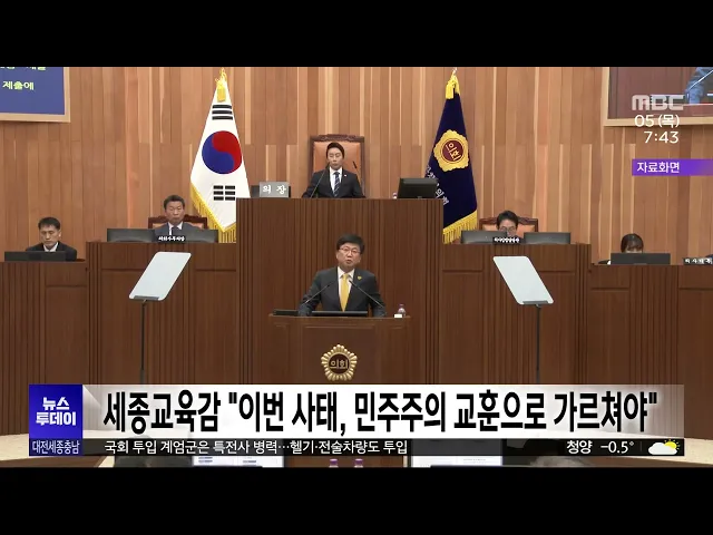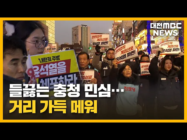 뉴스투데이 뉴스데스크뉴스투데이뉴스데스크 VOD(전체 다시보기)뉴스투데이 VOD(전체 다시보기)유튜브뉴스페이스북 뉴스카카오톡 뉴스인스타그램 뉴스 prev 2024.12.5 - 목요일 next 천안시의회, '폭설 피해' 특별재난지역 선포 건의문 채택 천안시의회가 지난달 27일 폭설로 인한 대규모 축사와 농작물 피해와 관련해 정부에 특별재난지역 선포를 촉구하는 건의문을 채택했습니다. 천안시의회는 건의문을 통해 특별재난지역 지정과 더불어 정부... 김윤미 축구협회장 후보들 'NFC' 외면에 천안시 "소송도 불사" 대한축구협회장 선거에 나선 일부 후보들이 천안에 조성 중인 대한민국 축구종합센터, 이른바 NFC를 외면하는 공약을 내걸면서 천안시가 강한 우려를 나타냈습니다. 박상돈 천안시장은 긴급 브리핑을 열고... 김윤미 대전시 국내 유망기업 7개사 유치..1천195억 규모 투자 협약 대전시가 국내 유망 기업 7개 사와 안산 국방산단 등지에 천 195억 원 규모를 투자하는 내용의 업무 협약을 체결했습니다. 대전시는 협약 참여 7개 기업 가운데 6곳이 외지 기업이라며 지역 산단에 입주가... 김지훈 국공립대교수연합 "대통령 탄핵해야"..최교진 "민주주의 교훈으로 가르쳐야" 충남대와 공주교대 등 전국 40개 국공립대학 교수회 연합회가 시국 성명을 통해 불법적 비상 계엄으로 대한민국을 극도의 혼란과 불안에 빠뜨린 윤석열 대통령의 탄핵과 관련자 처벌을 촉구했습니다. 또, ... 조형찬 '초유의 6시간'...'명백한 헌정 유린"/투데이 ◀ 앵 커 ▶ 이번 12·3 비상계엄 사태는 명백한 헌정 유린인 만큼 대통령이 책임을 져야 한다는 데에 뜻이 모아지고 있습니다. 대통령을 향한 각계각층의 목소리를 들어봤습니다. 고병권 기자가... 고병권 "2024년 맞나?"...비상계엄에 충격·분노/투데이 ◀ 앵 커 ▶ 법과 상식을 뒤엎는 비상계엄은 불과 6시간 만에 끝이 났지만, 그 파장은 여전히 뜨겁습니다. 충격과 분노에 휩싸인 시민들은 대통령에게 그 책임을 물어야 할 때라고 목소리를 높였습니다. 이... 윤소영 "계엄 선포부터 해제까지"...긴박했던 충청/투데이 ◀ 앵 커 ▶ 45년 만의 비상계엄. 지난밤, 윤석열 대통령이 비상계엄을 선포하면서 대전과 세종,충남 지역도 긴장감 속에 하루를 보냈습니다.군과 경찰이 비상 대기에 들어갔고, 각 지방자치 단체는 비상 상... 이승섭 들끓는 충청 민심⋯거리 가득 메워/투데이 ◀ 앵 커 ▶12·3 비상계엄 사태에 반발해 윤석열 대통령의 퇴진을 촉구하는 목소리가, 전국에서 터져 나오는 가운데, 충청권 민심도 들끓고 있습니다. 수천 명의 시민들이 대전 도심으로 나와 이번 비상계엄... 김성국 "우리가 끌어내려야"...정권 퇴진 운동 '봇물'/투데이 ◀ 앵 커 ▶ 국회의 의결로 6시간 만에 해제됐지만, 윤석열 대통령의 비상계엄 선포에 대한 민심의 불안과 분노는 컸습니다. 아침 출근길부터 도심 곳곳에서 대통령 퇴진을 외치는 목소리가 울려 퍼졌고,각... 김윤미