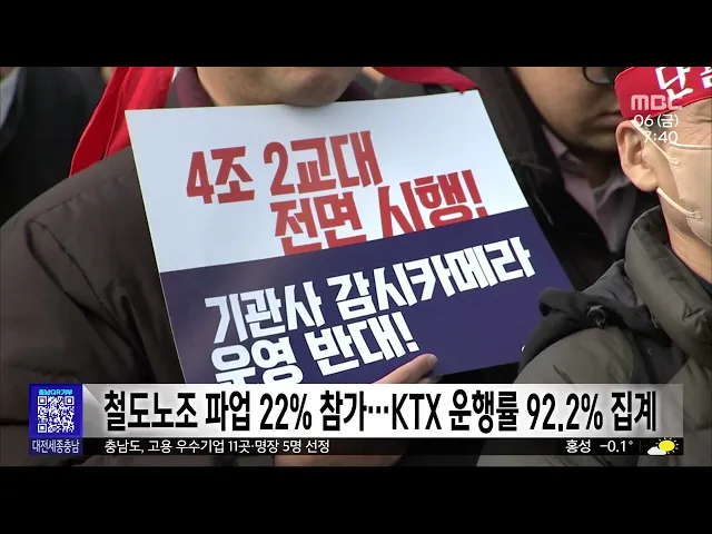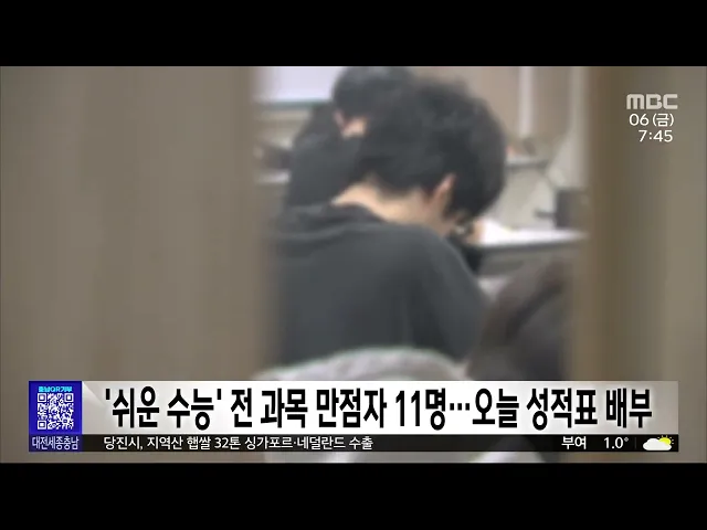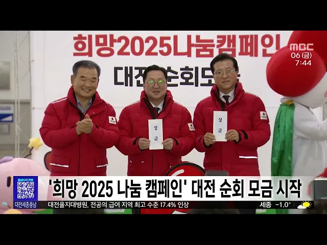 뉴스투데이 뉴스데스크뉴스투데이뉴스데스크 VOD(전체 다시보기)뉴스투데이 VOD(전체 다시보기)유튜브뉴스페이스북 뉴스카카오톡 뉴스인스타그램 뉴스 prev 2024.12.6 - 금요일 next 대전 최초 통합학교 '둔곡초중학교' 개교식 대전에서 처음으로 유치원은 물론, 초등학교와 중학교가 통합된 학교인 둔곡초·중학교가 전교생 380여 명과 교직원 등이 참석한 가운데 개교식을 가졌습니다. 초·중 통합의 본보기로 운영되고 있는 대전 ... 김윤미 '쉬운 수능' 전 과목 만점자 11명..오늘 성적표 배부 지난달 14일 치러진 대학수학능력시험이 지난해와 비교해 대체로 쉬워 지난해 1명뿐이었던 전 과목 만점자가 11명으로 크게 늘어난 것으로 나타났습니다. 한국교육과정평가원이 공개한 수능 채점 결과에 ... 김윤미 대전을지대병원, 전공의 급여 지역 최고수준인 17.4% 인상 대전 을지대학교병원이 전공의 급여를 지역 대학병원 최고 수준인 최대 17.4% 인상하기로 했다고 밝혔습니다. 을지대병원은 지난해 말에도 지역 필수 의료진 양성과 의료 서비스 질 향상을 위해 전공의 ... 김태욱 '희망2025 나눔캠페인' 대전 순회 모금 시작 대전사회복지공동모금회가 대전시를 시작으로 '희망 2025 나눔 캠페인' 순회 모금에 나섰습니다. 모금회는 오는 17일까지 대전시와 5개 구를 돌며 모금 활동을 펼칠 예정입니다. 대전의 '희망 2025 나눔 ... 이승섭 "학교도 밀어주기 의혹"...손 놓은 교육당국/투데이 ◀ 앵 커 ▶ 교복 카르텔 기획보도 순서입니다. 대전 지역 교복 업체간 담합에 일부 학교도 연루됐다는 의혹이 제기됐습니다. 올해 한 학교의 교복 업체 입찰에서 접근성이 뛰어난 다른 브랜드 업체를 제치... 윤소영 보령경찰서, 관광지 마트 턴 가출청소년 등 3명 검거 보령경찰서가 관광지 인근 가게를 돌며 수십만 원 상당의 금품을 훔친 혐의로 가출청소년인 10대 남성 2명과 20대 남성 1명을 붙잡았습니다. 대전에서 온 이들은 지난달 19일부터 이틀 동안 여행 경비를 ... 김성국 예산서 SUV차량이 카페로 돌진.."페달 헷갈려" 그제 낮 1시 반쯤 예산군 삽교읍에 있는 한 카페로 70대 남성이 몰던 SUV차량이 돌진해 매장 유리문과 집기류 등이 파손됐습니다. 사고 당시 카페 안에 손님 등 5명이 있었지만 다행히 다친 사람은 없었으... 김성국 철도파업에 22% 참가..KTX 92.2%·화물열차 58.8% 운행 철도노조가 임금 인상 등을 요구하며 무기한 파업에 돌입하면서, 일부 열차가 지연되거나 운행을 중단해 이용객 불편이 이어지고 있습니다. 국토교통부는 출근 대상자 만2천9백여 명 중 22.1%가 파업에 참... 김태욱 연말대목 앞두고..소상공인 '절망'/투데이 ◀ 앵 커 ▶ 12.3 비상계엄 사태 후폭풍이 거셉니다. 시민 사회의 분노는 물론이고 자영업자와 소상공인들은 가뜩이나 어려운 경제 여건에 초현실적인 불확실성까지 더해져 당장 먹고 살 일이 걱정입니다. ... 문은선 대전참여연대 "'경고성 계엄' 터무니없는 거짓말" 대전 참여자치 시민연대가 12·3 비상계엄 사태가 국민의 주권을 침탈하려는 시도였다며, 윤석열 대통령의 퇴진을 촉구했습니다. 연대 측은 성명을 내고, 이번 비상계엄이 '경고성 계엄'이었다는 대통령실... 이승섭 충청권 74% 윤석열 대통령 탄핵 찬성 대전과 세종, 충·남북 등 충청권 주민 10명 가운데 7명 이상이 윤석열 대통령의 탄핵에 찬성한다는 여론조사 결과가 나왔습니다. 리얼미터가 에너지경제신문 의뢰로 그제 벌인 여론조사에서 12·3 비상계엄... 고병권 비상계엄 반발 이틀째...거리로 나선 시민들/투데이 ◀ 앵 커 ▶ 12·3 비상계엄 사태와 관련해 대통령 퇴진을 촉구하는 시민들의 분노가들불처럼 번지고 있습니다. 아침부터 대통령 퇴진을 요구하는 시민들이 거리로 나섰고, 노동계는 일손을 놓고 탄핵 요구에... 김태욱 "자리 비우고 계엄 옹호하고?"...시도지사 입장 논란/투데이 ◀ 앵 커 ▶ 이번 비상계엄 사태에서 지역 시도지사의 행적과 입장 발표를 두고, 논란이 일고 있습니다. 비상계엄 상황에서 자리를 비우거나 이번 비상계엄을 옹호하는 듯한 입장을 내놓았다는 겁니다. 이승... 이승섭