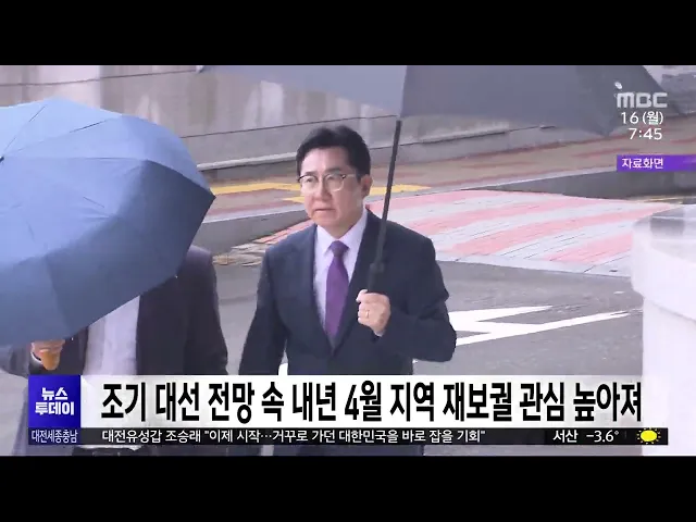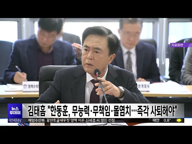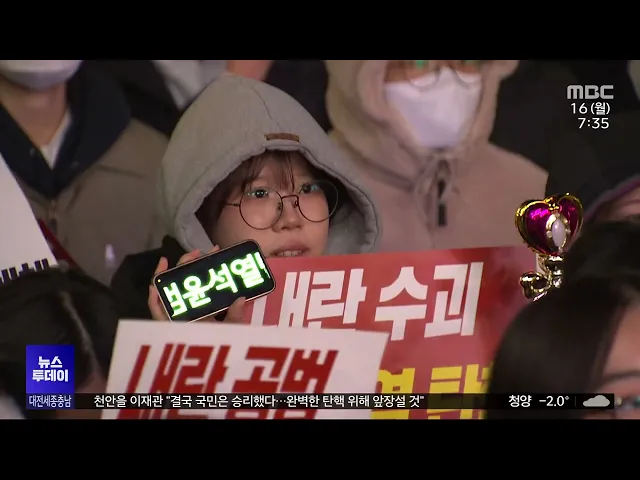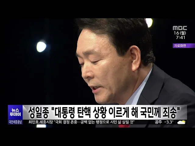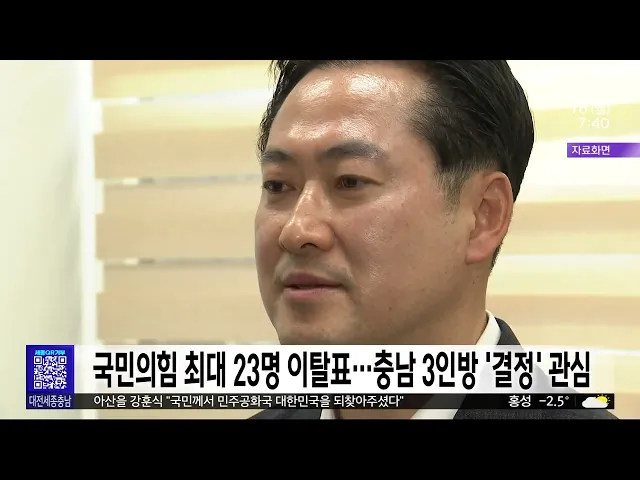 뉴스투데이 뉴스데스크뉴스투데이뉴스데스크 VOD(전체 다시보기)뉴스투데이 VOD(전체 다시보기)유튜브뉴스페이스북 뉴스카카오톡 뉴스인스타그램 뉴스 prev 2024.12.16 - 월요일 next "내란부터 탄핵까지"...민주주의 되살린 시민들/투데이 ◀ 앵 커 ▶12.3 내란 사태 이후 시민들이 열흘 넘게 거리로 나와 목소리를 낸 끝에윤석열 대통령 탄핵소추안이 가결됐습니다.비상계엄 선포부터 1차 탄핵 표결 불성립,이후 탄핵안 가결까지 치열했던 열하... 김광연 대전서 '대통령 탄핵 인용 촉구 집회' 열려 윤석열 대통령의 탄핵안이 가결된 이후에도헌법재판소의 탄핵 인용을 촉구하는 집회가이어졌습니다.어제 대전에서는 대전촛불행동과 민주당 대전시당 평당원협의회 등이 대전역 서광장에서 '대전촛불대행... 김광연 김태흠 "한동훈, 무능력·무책임·몰염치...즉각 사퇴해야" 대통령 탄핵 가결 이후 김태흠 충남지사가 다시 한 번 국민의힘 한동훈 대표를 직격했습니다.김 지사는 자신의 sns를 통해 "윤 대통령의 비이성적 계엄 선포 판단까지는 집권당 대표로서 사사건건 대통령... 김지훈 국민의힘 최대 23명 이탈표...충남 3인방 '결정' 여부 관심 대통령 탄핵소추안 가결 과정에서 국민의힘 이탈표가 최대 23명으로 추정되는 가운데 충남 국민의힘 소속 국회의원 3명이 어떤 결정을 했을지 관심을 끌고 있습니다.지역 국민의힘 의원들의 계파는 홍성예... 김지훈 성일종 "대통령 탄핵 상황 이르게 해 국민께 죄송" 이번 탄핵 정국에서 큰 지탄을 받았던 충남 국민의힘 국회의원 3인방 가운데 서산태안 성일종 의원이 "국민께 죄송하다"는입장을 내놨습니다.성 의원은 자신의 sns를 통해 "지난 3일 계엄 선포가 부끄럽고... 김지훈 박용갑, "尹 보수 지급 중단해야"...관련 법 개정안 발의 대전 중구 민주당 박용갑 의원이 탄핵소추로 직무가 정지된 대통령에게 보수 지급을 중단하는 내용의 법률 개정안을내놨습니다.박 의원은 "대통령 직무가 정지됐지만 헌재 결정이 나올 때까지 월 2천백여 ... 김지훈 조기 대선 전망 속 내년 4월 지역 재보궐 관심 높아져 대통령 탄핵으로 내년 4월에서 8월 사이 조기 대선 전망이 정치권에서 나오는 가운데 내년 4월 2일 치러질 지역의 재보궐선거가충청 민심의 가늠자가 될 전망입니다.지역 선관위에 따르면, 내년 4월 2일로... 김지훈 대전 반려동물 관련 화재 3년간 32건...예방 수칙 지켜야 최근 반려 인구가 늘고 있는 가운데대전소방본부가 반려동물로 인한 화재 예방에 주의를 당부했습니다.소방본부에 따르면 최근 3년 동안 대전에서 반려동물로 인한 것으로 추정되는 화재가 32건이 발생해 ... 김광연