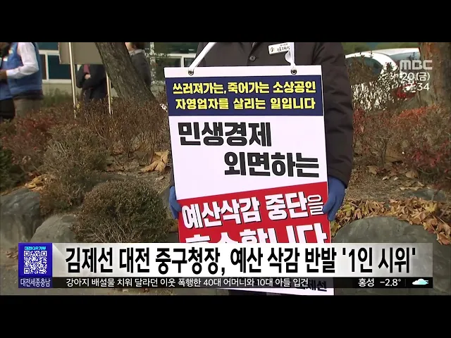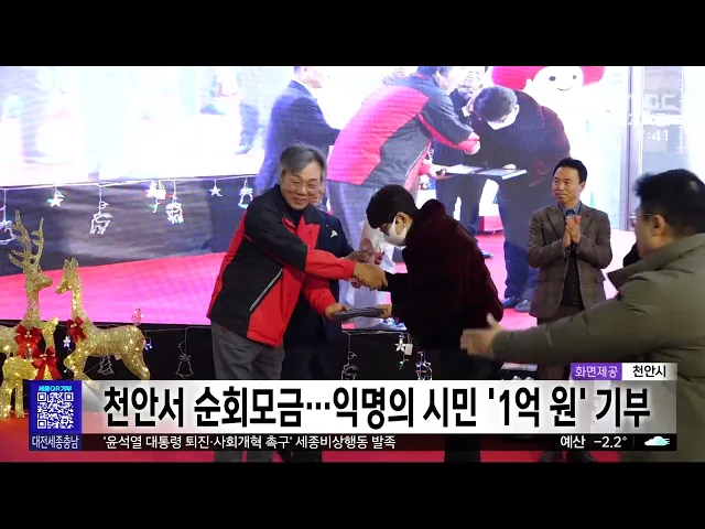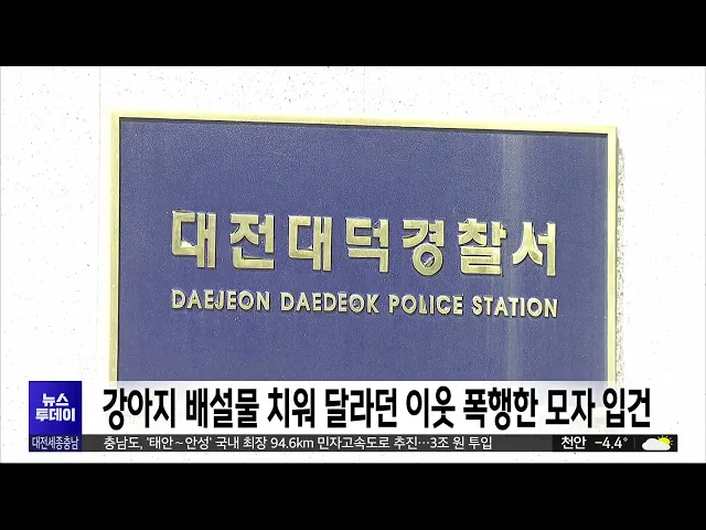 뉴스투데이 뉴스데스크뉴스투데이뉴스데스크 VOD(전체 다시보기)뉴스투데이 VOD(전체 다시보기)유튜브뉴스페이스북 뉴스카카오톡 뉴스인스타그램 뉴스 prev 2024.12.20 - 금요일 next "장애인·비장애인 함께 이용" 천안 반다비체육센터 개관 장애인과 비장애인이 함께 이용하는 생활체육시설인 천안 반다비체육센터가 천안시 유량동 천안시장애인종합체육관 내에 문을 열었습니다.지하 1층, 지상 2층 규모로 건립된천안 반다비체육센터는 2레인 ... 김윤미 아산시, '100원 행복택시' 대상 출산 후 1년까지로 확대 아산시가 임신부를 대상으로요금 100원에 운행하던 '행복택시'를 내년부터 출산 후 1년까지로 확대 운영합니다.시는 출산 장려와 교통 복지 정책 확대를 위해대상을 출산 후 1년까지로 확대했으며 이에 따... 김윤미 부여군, 국민권익위 청렴도 평가 3년 연속 1등급 국민권익위의 올해 공공기관 청렴도 평가에서 부여군이 전체 716개 공공기관 가운데3년 연속 1등급을 받았습니다.이번 평가에서 세종시와 충남도는 각각 3등급을, 대전시는 전체 5등급 가운데 4등급에 그... 김윤미 순찰차 추돌 유도해 동료 도주시킨 폭주족 징역 1년 6개월 대전고법 1형사부는 세종 도심에서 난폭운전을 하다 동료들이 도망칠 수 있게 순찰차 추돌사고를 유도한 혐의로 기소된 20대 오토바이 폭주족의 항소심에서 1심과 같은 징역 1년 6개월의 실형을 선고했습... 조형찬 강아지 배설물 치워 달라던 이웃 폭행한 모자 입건 대전 대덕경찰서가 강아지 배변을치워달라던 이웃을 폭행한 혐의로 40대 어머니와 10대 아들 등 2명을 입건했습니다.이들은 지난 8일 대전 대덕구의 한 다세대주택 아랫집에 사는 50대 여성에게 찾아가 왜... 김성국 천안서 순회모금 행사..익명의 시민 '1억 원' 기부 연말연시 어려운 이웃을 돕기 위한 희망2025 나눔캠페인 성금 순회모금 행사가 어제 천안시청에서 진행됐습니다.이번 순회모금 행사에서는천안에 사는 익명의 시민이 1억 원을 기부해 '아너소사이어티' 회... 김윤미 대전MBC '교도소 재소자 집단폭행' 목요언론인상 수상 어제 '2024 목요언론인클럽 대상' 시상식이 유성컨벤션웨딩홀에서 열린 가운데, '대전교도소 재소자 집단폭행·은폐 사건'을집중 보도한 대전MBC가 올해 4분기이달의 기자상을 수상했습니다.심사위원들은 ... 김성국 김제선 대전 중구청장, 예산 삭감 반발 1인 시위 김제선 대전 중구청장이 중구청 앞에서 중구의회가 내년도 예산안을 대폭 삭감한 것에 반발해 1인 시위를 벌였습니다. 김 청장은 지역화폐와 공동체지원센터, 주민참여예산제 등의 예산을 의회가 구청장의... 이승섭 경찰, 2살 딸 학대해 숨지게 한 30대 부부에 구속영장 신청 생후 25개월 된 딸을 학대해 숨지게 한 30대 부부에게 경찰이 아동학대 특례법상 아동학대치사 혐의로 구속영장을 신청했습니다.이들은 지난 16일 새벽 대전 서구 거주지에서아기가 숨을 쉬지 않는다고 11... 김광연 '윤석열 대통령 퇴진·사회개혁 촉구' 세종비상행동 발족 세종 지역 14개 시민사회단체가 윤석열 대통령의 퇴진과 3대 사회개혁을 촉구하는 세종비상행동을 발족하고,본격적인 활동에 들어갔습니다.이들은 발족 기자회견에서 "비상계엄 선포는 헌법을 파괴한 범죄... 김윤미 "산타 선물 같아요"...작은 관심이 큰 기부로/투데이 ◀ 앵 커 ▶더 나은 세상을 만드는 기획보도 이음순서입니다.최근 아이들의 옷을 만드는 회사에서 4억 원 상당의 옷을 아동양육시설과 한부모가정에 기부를 하면서 주변을 훈훈하게 하고 있는데요.이같은 선... 김성국 탄소 제로 시대의 화두...'공정한 전환'/투데이 ◀ 앵 커 ▶탄소중립시대로 가기 위한 에너지 전환, 그 필요성과 과제를 짚어보는 대전 MBC 기획보도 마지막 순서입니다. 에너지 전환은 지속 가능한 미래를 위해 반드시 가야할 길이지만, 기존 산업의 패러... 최기웅 내란에 발길 '뚝'...소상공인 살려라!/투데이 ◀ 앵 커 ▶가뜩이나 어려운 서민 경제는12·3 내란 사태로 더 나빠졌습니다.소비 심리가 얼어붙어특히 소상공인의 타격이 큰데요.지방자치단체와 정치권까지 나서소비 촉진 대책을 내놓고 있습니다.이승섭 ... 이승섭 진격의 트랙터 군단, "윤석열 구속, 농정 개혁!"/투데이 ◀ 앵 커 ▶충남과 영남·호남, 전국 각지의 농민들이 트랙터를 몰고 서울로 향하고 있습니다.박근혜 탄핵 이후 8년 만에 다시 결집한'전봉준투쟁단'입니다.12.3 내란 범죄자 처벌과 농업 현안 개혁 등에관한... 윤소영