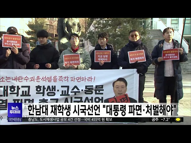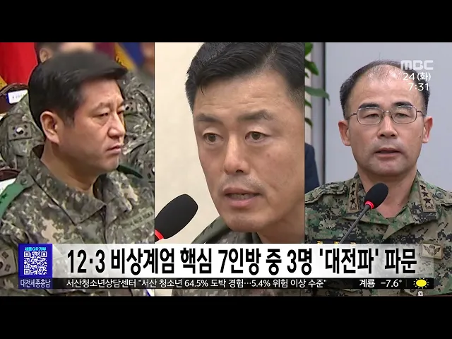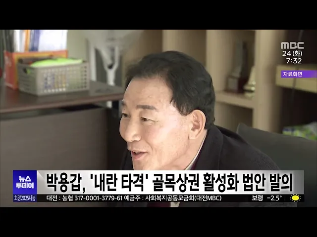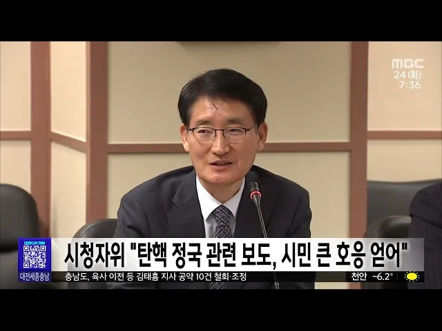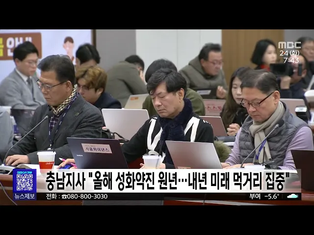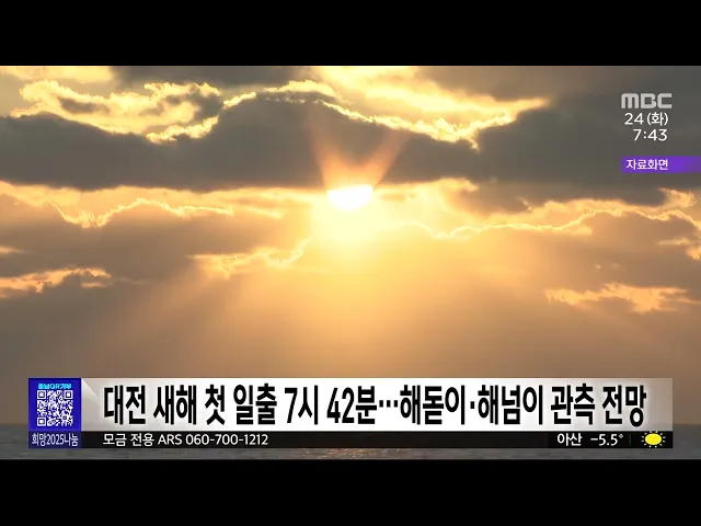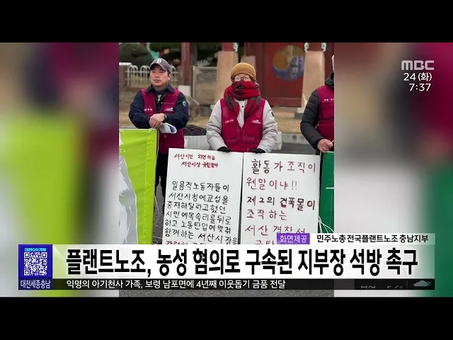 뉴스투데이 뉴스데스크뉴스투데이뉴스데스크 VOD(전체 다시보기)뉴스투데이 VOD(전체 다시보기)유튜브뉴스페이스북 뉴스카카오톡 뉴스인스타그램 뉴스 prev 2024.12.24 - 화요일 next 세종법원·검찰청 건립 사업 본격화..2028년 착공 세종지방법원과 검찰청 건립 사업이내년부터 본격 추진됩니다.행정중심복합도시건설청은 관련법 개정에 따라 세종법원과 검찰청 사업계획 적정성 검토를 요청했으며, 내년에 건축 기획과 설계 공모 등을 ... 문은선 충남지사 "올해 성화약진 원년..내년 미래 먹거리 집중" 김태흠 충남지사는 송년 기자회견을 열어 "올해 사상 최대 규모의 정부예산을 확보하는 등 성화약진의 원년을 만들었다"고 자평했습니다. 김 지사는 올해 주요 성과로 10조 9천여억 원 정부 예산 확보 외... 최기웅 대전 새해 첫 일출 7시 42분..해돋이·해넘이 관측 전망 2025년 새해 첫날 대전에서는 오전 7시 42분에 첫 일출을 볼 수 있습니다.한국천문연구원에 따르면, 지역의 새해 첫 일출 시각은 대전 오전 7시 42분을 시작으로 세종 7시 43분, 충남 천안 7시 44분입니다... 김지훈 사기 피해로 동반 자살하려다 아들 숨지게 한 40대 중형 대전지법 천안지원 형사1부가 지난 1월 보이스피싱으로 1억 원 넘는 피해를 본 뒤 예산에 있는 자신의 집에서 자녀들과 동반자살을 시도해 아들을 숨지게 한 혐의로 기소된 40대 여성의 1심 선고 공판에서... 김광연 플랜트노조, 농성 혐의로 구속된 지부장 석방 촉구 민주노총 전국플랜트노조가 서산시청에서 기자회견을 열고 지난 9월 시청에서 5시간 동안 농성을 벌인혐의로 최근 구속된 플랜트노조 충남 지부장의 석방을 촉구했습니다.이들은 "농성 당시 지부장이 민원... 김광연 공주 유구천 벙커A유 4천 리터 유입..이번 주 내내 방제해야 지난 21일 공주시 유구읍 대전당진고속도로에서유조차가 넘어져 유출된 기름 4천ℓ 가량이공주 유구천에 흘러든 가운데 긴급 방제 작업이 계속되고 있습니다.공주시는 충남도, 한국환경공단 등과 함께하천... 이승섭 시청자위 "탄핵 정국 관련 보도, 시민 큰 호응 얻어" 대전MBC에서 열린 12월 시청자위원회에서 위원들은 탄핵 정국과 관련해 연속 보도한 '시민들이 되살린 민주주의' 기획 뉴스를 높이 평가했습니다.또 현대제철 노동자 사망과 대전교도소 재소자 집단 폭행... 김지훈 박용갑, '내란 타격' 골목상권 활성화 법안 발의 대전 중구 민주당 박용갑 의원이12·3 내란 사태로 어려움을 겪는 골목상권을활성화하기 위해 전통시장 상인과 소상공인의소득공제 한도 40%에서 50%로 높이는 내용의조세특례제한법 개정안을 발의했습니다... 이승섭 천안시·아산시, 탄핵 정국 속 지역 상권 살리기 나서 천안시와 아산시가 탄핵 정국으로 어려움을 겪는 지역 상권 살리기에 나섰습니다.천안시는 부서별 연말 모임과 회식을 독려하고이달 말까지 천안사랑카드 10만 원 이상 이용자를 대상으로 최대 3만 원을 ... 문은선 12·3 비상계엄 핵심 7인방 중 3명 '대전파' 파문 12·3 비상계엄을 주동하거나 가담해 구속된 군 인사 7명 가운데 대전 출신 장성 3명이 포함돼 파문이 확산하고 있습니다.비상계엄 관련 군 구속자 가운데 대전 출신은 노상원 전 국군정보사령관과 문상호 ... 김지훈 한남대 재학생 시국선언 "대통령 파면·처벌해야" 한남대 재학생들이 어제헌법재판소의 대통령 파면을 촉구하는시국선언을 발표했습니다.학생들은 탄핵 사유가 차고 넘치는 윤석열 대통령이 헌법재판소의 탄핵 심판에서도출석 요구서를 받지 않는 식의 태... 이승섭 43년 만에 찾은 대전..."포기하지 않겠습니다"/투데이 ◀ 앵 커 ▶올 한 해 대전MBC 뉴스가 만들어낸 우리 사회 의미 있는 변화를 살펴보는 연말 기획보도 '취재가 시작되자' 첫 순서입니다.지난여름, 저희 대전MBC는 친부모를 찾아43년 만에 대전을 방문한 노르... 김성국 유성복합터미널 드디어 첫 삽...1년 뒤 완공/투데이 ◀ 앵 커 ▶20년 가까이 지지부진하던대전 유성복합터미널 건립 사업이드디어 첫 삽을 떴습니다.민간 자본 유치와 주상복합 형태 등여러 개발 방안이 거론됐지만, 일단 여객 시설 중심의 터미널만 세워집니... 이승섭 "생명 못 지킨 안전 수칙"...사고 내면 징계/투데이 ◀ 앵 커 ▶현대제철소에서 가스 배관을 점검하던 노동자가 유독 가스에 질식해 숨진 사고, 전해드렸죠.그런데 이 노동자가 살아 있었다면, 회사로부터 징계를 받았을 거란 주장이 나왔습니다.산재 노동자를... 윤소영 "당당하지 못한 대통령".."천막당사라도 쳐야"/투데이 ◀ 앵 커 ▶윤석열 대통령이 내란 혐의 수사에 협조하지 않고 있는 가운데, 김태흠 충남지사가'당당하지 못하다'고 직격탄을 날렸습니다.아예 '천막당사를 치고 민심을 받들자'는 주장까지 나오고 있지만, ... 최기웅