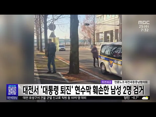 뉴스투데이 뉴스데스크뉴스투데이뉴스데스크 VOD(전체 다시보기)뉴스투데이 VOD(전체 다시보기)유튜브뉴스페이스북 뉴스카카오톡 뉴스인스타그램 뉴스 prev 2024.12.25 - 수요일 next 공공과기노조 카이스트유니온지부, 근로감독 청원 연구와 행정, 기술 등 370여 명의 무기계약직과 비정규직으로 구성된 공공과학기술연구노조 소속 카이스트유니온지부가 지난 12일카이스트의 노무 행정에 대한 근로 감독을청원했습니다. 지부는 "국내 굴... 박선진 홍성군, 2027년까지 청년 임대형 첨단 스마트팜 조성 홍성군이 국비 등 2백억 원을 들여오는 2027년까지 스마트팜 기반 청년 농업인 육성 시스템을 마련합니다.군은 서부면에 5ha 규모의 임대형 스마트팜을 조성하고 청년 농업인에게 기본 5년, 최대 10년을 ... 김광연 서천사랑상품권 내년부터 환급 방식으로 혜택 변경 서천군이 내년부터 지역화폐인 모바일 서천사랑상품권의 10% 할인 혜택을 결제 후 환급 방식으로 바꿉니다.이에 따라 내년부터 한 달에 최대 30만 원의서천사랑상품권을 충전해 결제하면캐시백 10%가 적립... 이승섭 태안군 "내년은 서해안 치유관광도시 도약 원년" 태안군이 내년을 서해안 치유관광도시 도약의 원년으로 삼아 사계절 관광 콘텐츠를 확충합니다.내년 관광객 2천만 명 유치를 목표로 하는 태안군은 오는 31일 안면도 꽃지해수욕장에서'2025 태안 방문의 ... 김지훈 대전시, 참전유공자 수당 5만 원 인상한 20만 원 지급 대전시가 내년부터 지역 참전유공자 4천9백여 명에게 지급하는 명예수당을월 15만 원에서 20만 원으로 인상합니다.시는 지난해에 이어 내년에도 명예수당을 올려3년 사이 명예수당을 두 배 수준으로 인상... 이승섭 대전시, 청년 1천5백 명에게 월세 최대 240만 원 지급 대전시가 올해 하반기 대전청년월세지원사업 선정자 천5백 명에게 앞으로 1년간 최대 240만 원의 월세를 지원합니다.이 사업을 통해 해마다 3천 명의 청년에게 월세를 지원하고 있는 대전시는 2022년 사업... 김지훈 충남도, 가로림만 디지털 갯벌 지도 구축 충남도가 유네스코 세계자연유산 등재를 추진 중인 서산 가로림만을 체계적으로 보존·활용하기 위해 전국에서 처음으로 디지털 갯벌 지도를 구축했습니다.가로림만 일대 갯벌 45㎢를 고해상도 드론으로촬... 김지훈 대전·충남 행정통합 협의체 출범...내년 상반기 법률안 제안 대전시와 충남도가 행정통합을 선언한지한 달 만에 주민 의견을 수렴하며,실무를 맡을 민관 협의체를 구성했습니다.민관 협의체는 광역 의원과 기초단체장, 전문가 등 30명으로 구성돼 내년 상반기까지통... 이승섭 수능 격려품 등 제공한 기초단체장 등 공무원 3명 고발 충남선거관리위원회가 지난달 14일 실시된 대학수학능력시험과 관련해 법적 근거 없이 수험생에게 수능 격려품 등을 제공한 현직 기초단체장 등 공무원 3명을 대전지검 논산지청에 고발했습니다.선관위에 ... 조형찬 대전서 '대통령 퇴진' 현수막 훼손한 남성 2명 검거 윤석열 대통령 퇴진 문구 등이 적힌 현수막이 잇따라 훼손돼 경찰이 수사에 나섰습니다.대전경찰청은 지난 15일부터 최근까지 현수막이 훼손됐다는 신고 10건을 접수하고수사에 나서, 지난 20일과 그제각... 김광연 "불공정, 감시로 변화"/투데이 ◀ 앵 커 ▶올 한 해 대전MBC 뉴스가 만들어낸 우리 사회의 의미 있는 변화를 살펴보는 연말 기획보도 '취재가 시작되자' 순서입니다.지난달 자신의 아들을 채용하고 심사에도 관여했다는 보도 이후 대전 관... 김광연 호흡기 중복 감염 '비상'..."예방 접종 서둘러야"/투데이 ◀ 앵 커 ▶갑자기 날이 추워지면서 지난주부터인플루엔자 독감 환자가 크게 늘었습니다.질병관리청은 독감 유행주의보를 발령했고 특히 백일해, 코로나19 등 다양한 호흡기 중복 감염이 많아 고위험군은 지... 문은선 혹한에 학원차에 갇힌 5살 아이..."이야기 안 할 거야"/투데이 ◀ 앵 커 ▶혹한의 날씨 속에서 5살 어린이가 학원 차량에 한 시간 넘게 갇혀 있다 뒤늦게 발견됐습니다.학원 측은 수업이 끝날 때까지 아이가 사라진 사실조차 알지 못했습니다.아이는 여전히 정신적인 충... 윤소영 정권 퇴진 운동 1년..."사회 개혁의 시작"/투데이 ◀ 앵 커 ▶12·3 내란 사태 이후 윤석열 대통령이서둘러 퇴진해야 한다는 시민의 목소리가날이 갈수록 커지고 있습니다.12.3 내란과 같은 상황을 우려라도 했던 것일까요?대전에서는 이미 1년 전부터 윤석열... 이승섭