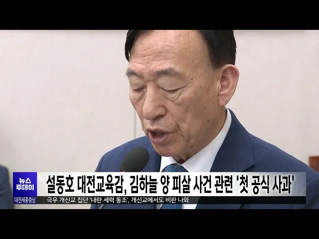 뉴스투데이 뉴스데스크뉴스투데이뉴스데스크 VOD(전체 다시보기)뉴스투데이 VOD(전체 다시보기)유튜브뉴스페이스북 뉴스카카오톡 뉴스인스타그램 뉴스 prev 2025.2.19 - 수요일 next "단체급식 찐 밥도 집밥처럼" 충남농기원, 지키미쌀 개발 충남도 농업기술원이 단체급식소에서 스팀 솥으로 조리할 때도 찐 밥이 아니라 집밥처럼 맛을 낼 수 있는 신품종 벼 '지키미'를 개발했습니다.도 농기원이 12년간 연구해 만든 지키미는 쌀 전문의 구성 성... 조형찬 강철같이 단단하고 스티로폼처럼 가벼운 신소재 개발 카이스트와 토론토대 공동 연구팀이 강철같이 단단하면서도 스티로폼처럼 가벼운 나노 구조의 신소재를 개발했다고 밝혔습니다. 연구팀은 광학 기술을 이용해 탄소 소재를 복잡한 격자 구조로 최적화했으... 고병권 대전시, 올해 신규공무원 353명 선발…전년 대비 127명 증가 대전시가 지난해보다 127명이 증가한 353명의 신규 공무원을 선발합니다. 직군별로는 행정직이 202명으로 가장 많고, 기술직 148명, 연구직 3명 등으로, 장애인과 저소득층, 고졸자 등 사회적 배려 계층에... 조형찬 황명선 의원 "흑색비방과 무고는 악질적 범죄 행위" 더불어민주당 황명선 의원이자신을 정치자금법 위반 혐의로 고발한 이들의무고 등 혐의 첫 공판에 앞서대전지법 논산지원 앞에서기자회견을 열었습니다.황 의원은 "선거 때마다 지역에서 벌어지는 흑색비... 김광연 충남선관위, 허위 학력 공표한 예비후보자 고발 충남선거관리위원회가 4.2 재·보궐선거와관련해 언론사를 통해 허위 학력을 공표한 혐의로 예비후보자를 어제 당진경찰서에 고발했습니다. 선관위에 따르면, 해당 예비후보자는 본인이 출마하고자 하는 선... 조형찬 산림청, 내달 1일부터 2개월간 임업·산림 직불금 신청 접수 산림청이 임업인의 소득 안정을 위한 임업, 산림 공익 직접지불금을 지급하기로 하고다음 달 1일부터 두 달간 신청을 받습니다. 지급 대상은 지난 2019년 4월부터 2022년 9월까지 직전 1년 이상이나 연간 ... 조형찬 아산시, 곡교천 '국가생태탐방로' 지정 추진…생태자원 활용 아산시가 생태 습지로 사랑받는 곡교천을 국가생태탐방로로 지정하는 방안을 추진합니다.시는 이달 말 신청해, 5월 말 선정하는 환경부의 국가생태탐방로 공모사업에 참여해 총사업비의 50%인 국비 30억 ... 조형찬 교육부, 고 김하늘 양 피살 관련 대전교육청 감사 지난 10일 대전의 한 초등학교에서 발생한 고 김하늘 양 피살 사건과 관련해 교육부가 대전교육청에 대한 감사에 나섭니다.교육부는 정확한 사실관계를 파악하고 사건 발생 시까지 학교에서 일어난 상황과... 김윤미 설동호 대전교육감, 김하늘 양 피살 사건에 "책임 통감" 설동호 대전시교육감이 고 김하늘 양 피살 사건과 관련해 처음으로 공식 사과했습니다. 설 교육감은 어제 국회에서 열린 교육위원회 현안 질의에서 "책임을 통감하고,앞으로 안전한 학교를 만들기 위해 ... 조형찬 김경수·이광재 "행정수도 재추진..대통령실 세종 이전" 더불어민주당 차기 대선주자로 거론되는김경수 전 경남지사와 이광재 전 강원지사가 행정수도 재추진과 대통령실 세종 이전을 나란히 언급해 눈길을 끌고 있습니다.김 전 지사는 어제 강준현 의원 등이 주... 김윤미 세종시-행복청, 국가상징구역 조성 등 현안 해결에 협력 세종시와 행정중심복합도시건설청이 국회 세종의사당과 대통령 제2 집무실이 들어설'세종 국가상징구역' 조성 등 현안 해결에 힘을 모으기로 했습니다.특히, 국가상징구역의 도시계획과 대통령 제2 집무실... 김윤미 공공요금까지 고공 행진‥ 깊어지는 한숨/투데이 ◀ 앵 커 ▶들썩이는 물가에 대전과 세종의소비자물가 상승률이 두 달 연속 2%대를보였습니다.반년 가까이 1%대를 기록했던 충남마저도2%를 넘었는데요.특히 대전 상·하수도 요금도 당장 이달부터오르는 데... 박선진 늘봄학교 확대에 '안전 대책' 최대 과제/투데이 ◀ 앵 커 ▶정규 수업이 시작되기 전 이른 아침부터 저녁 8시까지 학교에서 돌봐주는 늘봄학교,지난해 초등학교 1학년 대상에서올해부터는 2학년까지 무상 지원되고 전체 학년으로 운영이 확대됩니다.더 많... 김윤미 "살해 방법 검색 기록 나와"...계획범죄 무게/투데이 ◀ 앵 커 ▶고 김하늘 양을 살해한 40대 교사가 살해 방법 등을 사전에 검색한 기록이 나와계획범죄에 무게가 더욱 실리고 있습니다.또 가해교사가 100% 급여를 받기 위해교육부 지침을 어기고 방학에 맞춰... 김성국 "조속한 파면 촉구" 대전 지역 기자회견/투데이 ◀ 앵 커 ▶윤석열 대통령에 대한 탄핵심판 9차 변론이진행된 어제 대전에서는 조속한 파면을촉구하는 릴레이 기자회견이 열렸습니다.참가자들은 윤 대통령이 반성 없이남 탓만 하고 있고 여당과 극우 유튜... 김광연