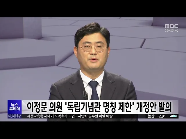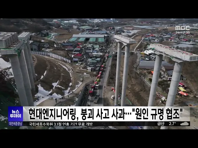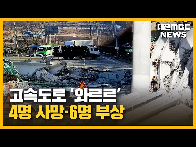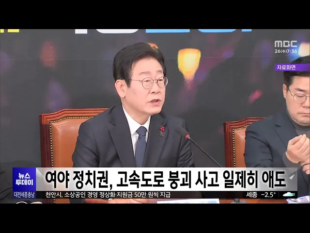 뉴스투데이 뉴스데스크뉴스투데이뉴스데스크 VOD(전체 다시보기)뉴스투데이 VOD(전체 다시보기)유튜브뉴스페이스북 뉴스카카오톡 뉴스인스타그램 뉴스 prev 2025.2.26 - 수요일 next 부여군, 60살 이상 모든 치매환자 치료비 연간 36만 원 지원 부여군은 다음달부터 소득 수준에 관계없이 60살 이상 치매 환자를 대상으로 치매 치료관리비를 확대 지원합니다. 군은 기준 중위소득 120% 이하 가구를 대상으로 했던 지원을 60살 이상 모든 환... 문은선 코레일, 전기요금 절약 자구책 마련..요금 신설 협의 한국철도공사가 열차 운행용 전기요금 절감을 위해 자구책 마련에 나섰습니다. 코레일은 운전 방법에 따라 전력 소비량을 12% 줄일 수 있는 자체 연구를 바탕으로 운전자보조시스템 마련, 최대 수요... 문은선 세종교육청 새내기 도약휴가 도입 세종시교육청이 저연차 공무원의 공직 이탈을 예방하기 위해 특별휴가를 도입했습니다. 최교진 세종교육감은 지방공무원 인사제도 개선 방안 기자회견에서 재직기간 1년 이상 5년 미만 공무원을 대상으로 ... 문은선 대전시·한국신용데이터, 소상공인 특화 인터넷은행 설립 협력 대전시와 한국신용데이터가 업무협약을 맺고 국내 최초로 소상공인에 특화한 인터넷전문은행인 '한국소호은행' 본사의 대전 설립에 힘을 모으기로 했습니다. 이에 따라 대전시는 소호은행 설립 인가 추... 김윤미 세종 빛축제 등 대한민국축제콘텐츠 대상 세종시 빛축제 등 지역 축제들이 한국축제 콘텐츠협회가 주최한 제13회 대한민국 축제콘텐츠 대상을 받았습니다. 시의회의 예산 전액 삭감으로 폐지 위기에 놓였다 시민추진단을 구성해 축제를 개최한... 문은선 서산 LG화학·롯데케미칼 정전…공장 가동 중단/투데이 ◀ 앵 커 ▶ 서산 대산석유화학단지 내 전기 공급이 끊겨 LG화학과 롯데케미칼 공장 가동이 멈춰 서는 사고가 발생했습니다. 또, 중단된 생산공정에 투입된 원료를 태우는 작업이 진행되면서 ... 최기웅 이정문 의원, '독립기념관 명칭 남용 제한' 개정안 발의 더불어민주당 이정문 의원이 최근 무분별하게 사용되고 있는 '독립기념관' 명칭에 제한을 두는 개정안을 대표 발의했습니다. 개정안에는 유사 명칭 사용으로 인한 혼란을 방지하기 위해 독립기념관법에 따... 김윤미 대전MBC 2월 시청자위원회 열려..다양한 지역 의제 설정 주문 대전MBC 2월 시청자위원회에서 위원들은 '초등학생 피살 사건'과 관련해, 교사와 학생들에 대한 2차 피해 사례가 없도록 세심한 보도를 주문했습니다. 위원들은 또 토론 프로그램 시시각각이 지역 사회 다... 김지훈 초등생 살해 교사 산소호흡기 제거..대면조사 미정 고 김하늘양을 살해한 혐의를 받는 가해 교사의 상태가 호전됐지만, 아직 경찰의 대면 조사는 이뤄지지 않고 있습니다. 대전서부경찰서 전담수사팀은 "피의자인 40대 교사가 그제 산소호흡기를 제거했지만... 김광연 "국회·대통령실 세종으로" 행정수도 완성론 급부상/투데이 ◀ 앵 커 ▶ 조기 대선 가능성이 커지면서 정치권에선 연일 세종시의 행정수도 완성을 요구하는 목소리가 이어지고 있습니다. 개헌 필요성과 함께 행정수도론이 주요 의제로 떠오르고 있는건데, 국회와 대통... 문은선 여야 정치권, 안성 고속도로 붕괴 사고에 일제히 애도 어제 세종포천고속도로 공사 현장에서 발생한 교량 붕괴 사고와 관련해 여야 정치권도 일제히 애도하고 조속한 사고 수습을 당부했습니다. 이재명 더불어민주당 대표는 SNS를 통해 "희생된 분들의 명... 김윤미 현대엔지니어링, 붕괴 사고 사과.."원인 규명 적극 협조" 현장공사를 맡은 현대엔지니어링이 이번 붕괴 사고와 관련해 "사상자들에게 진심으로 사과한다고 밝힌 뒤 현장 수습과 사고 원인 규명을 위해 모든 노력과 필요한 조치를 다하겠다"고 덧붙였... 김지훈 철수하다 와르르‥? "추가 붕괴 가능성도 대비해야"/투데이 ◀ 앵 커 ▶ 이번 사고는 교량 상판에 구조물을 설치하는 장비가 철수하는 과정에서 발생했습니다. 이 장비가 교각 위에서 이동하는 중에 균형을 잃은 듯한 모습이 CCTV 화면에 포착됐는데요. ... 김윤미 "5초만 늦었어도.." 아찔했던 사고 순간/투데이 ◀ 앵 커 ▶ 교량 상판이 엿가락처럼 휘어지며 갑자기 무너지는 붕괴 사고에 인근 마을에서는 큰 굉음과 흔들림이 느껴졌다고 합니다. 사고가 일어나기 불과 5초 전, 바로 아래 도로를 지나던 차량 ... 김광연 고속도로 '와르르'...4명 사망·6명 부상/투데이 ◀ 앵 커 ▶ 어제 오전 경기도 안성에 있는세종포천 고속도로 공사 현장에서 교량이 무너졌습니다. 이 사고로 다리 위에서 작업하던 노동자 10명이 50여 미터 아래로 추락하면서, 구조물에 깔려 4명이... 김성국