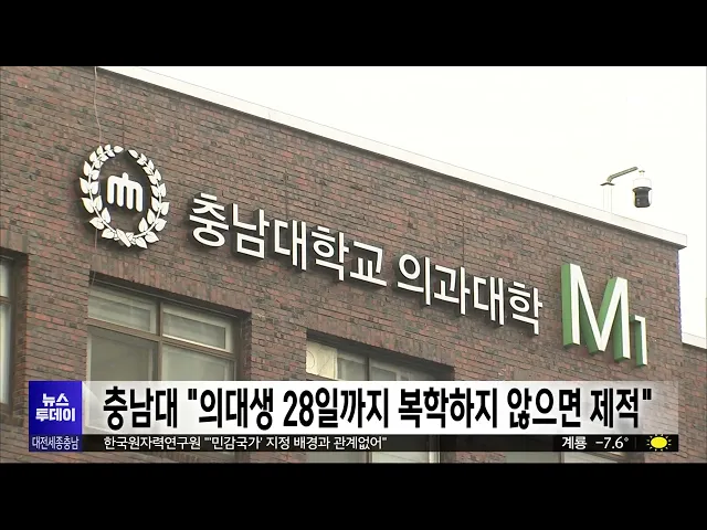 뉴스투데이 뉴스데스크뉴스투데이뉴스데스크 VOD(전체 다시보기)뉴스투데이 VOD(전체 다시보기)유튜브뉴스페이스북 뉴스카카오톡 뉴스인스타그램 뉴스 prev 2025.3.19 - 수요일 next 대전시, 우송정보대학에 4번째 '반려동물 놀이터' 개장 대전 동구에 위치한 우송정보대학에 반려동물 놀이터가 문을 엽니다. 대전시는 대덕구와 유성구, 중구에 이어 4번째로 동구 우송정보대학에 2천 제곱미터 규모의 반려동물 놀이터를 조성해 내일 개장한다... 김윤미 녹색연합 "오월드 재창조 사업, 동물 복지 개선해야" 대전충남녹색연합이 성명을 내고 최근 대전 오월드가 발표한 총사업비 3천 백억원의 시설 개선 사업이 동물 복지를 위한 전시환경 개선에 초점을 맞춰야 한다고 주장했습니다. 단체는 지난 20... 박선진 국내 첫 사립수목원 '천리포수목원 기록' 문화유산 예고 우리나라 최초의 사립수목원인 태안 천리포수목원의 역사를 담은 기록이 국가등록문화유산이 될 전망입니다. 국가유산청은 1962년 수목원을 만들기 위해 설립자가 9천 제곱미터 규모의 땅을 사들인 ... 김윤미 "유니콘 기업 키운다" 대전스타트업파크 시동/투데이 ◀ 앵 커 ▶ 빠른 속도로 변화하는 산업 환경 속에서 번뜩이는 아이디어를 활용한 창업의 중요성이 날로 높아지고 있습니다. 대전에 창업 기업을 지원하기 위한 대전스타트업파크 본부가 문을 열고 ... 김광연 충남도, 중소기업 매출채권 보험료 10억 6천만 원 지원 중소기업의 거래 안정성을 높이기 위해, 충남도가 올해 매출채권 보험료 지원사업에 10억 6천만 원을 투입합니다. 매출채권 보험은 중소기업이 거래처로부터 대금을 회수하지 못하는 경우 발생하는... 최기웅 금강 세종보 6개월만에 수문 가동...환경단체 반발 정부가 지난해 9월 이후 다시 금강 세종보 수문 가동에 나선 가운데, 환경단체가 세종보 재가동을 위한 준비라며 반발하고 있습니다. 한국수자원공사 측은 "세종보 정기점검 차원에서 수문을... 김지훈 청양군수 "지천댐 주민협의체 참여"/투데이 ◀ 앵 커 ▶ 청양 지천댐 건설을 둘러싼 찬반 갈등 속에 청양군은 그동안 '일방적인 피해를 주는 댐 건설은 반대한다'는 입장을 고수해 왔는데요. 김돈곤 청양군수가 일단 충남도가 주관하... 최기웅 충남 교통사고 사망자 30% '두 바퀴 차' 운전자 지난해 충남에서 발생한 교통사고 사망자의 30% 가량이 오토바이나 자전거 등 이른바 두 바퀴 차 운전자로 나타났습니다. 충남경찰청 분석 결과, 지난해 충남에서 오토바이나 자전거, 개인형 이동장... 김성국 충남대 "의대생 오는 28일까지 복학하지 않으면 제적" 충남대학교가 오는 28일까지 휴학 중인 의대생들이 복학하지 않을 경우 제적 처리하겠다는 방침을 밝혔습니다. 김정겸 총장은 서한문을 통해 "정부가 복학을 전제로 한 의대 정원 조정 방안... 윤소영 세종시 제2보건소 건립 언제쯤?/투데이 ◀ 앵 커 ▶ 코로나19 대유행을 겪으면서 공공의료의 필요성을 여실히 확인했는데요 하지만 인구 40만 명을 눈앞에 두고 있는 세종시에는 보건소가 하나밖에 없습니다. 의정 갈등 장기화... 문은선 '민감국가' 지정 배경 논란에 원자력연구원 "관계없어" 미국 에너지부가 우리나라를 민감국가로 지정한 배경에 원자력연구원이 참여한 양국의 공동 연구 과정에서 생긴 보안 사고 문제가 원인일 수 있다는 일부 언론 보도와 관련해 원자력연구원이 ... 고병권 예산 덕산지구 지방상수도 부적합 시공 일부 확인 예산 덕산지구 농어촌 지방상수도 확충 사업과 관련해, 일부 구간에서 부적합 시공이 드러나면서 예산군이 대책 마련에 나섰습니다. 예산군은 배수관과 급수관을 설치하는 해당 공사의 관로 매설 상태... 최기웅 '국민저항권' 외치느라...'입법' 뒷전인 의원님들/투데이 ◀ 앵 커 ▶ 국회의원의 본분은 유권자를 대표해 입법 활동을 하고, 지역구는 물론,국민의 삶을 개선할 정책을 논의하는 것이겠죠. 그러나 12·3 내란 이후 충청권 일부 의원들은 국민저항권과... 윤소영