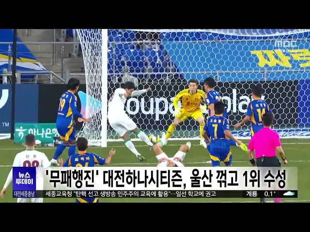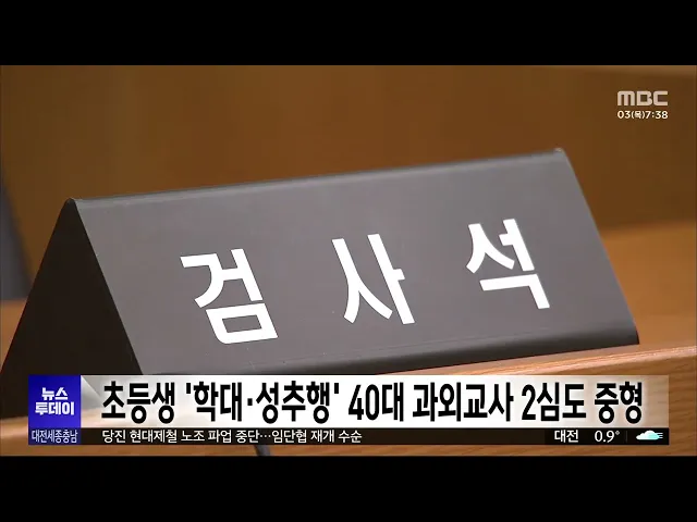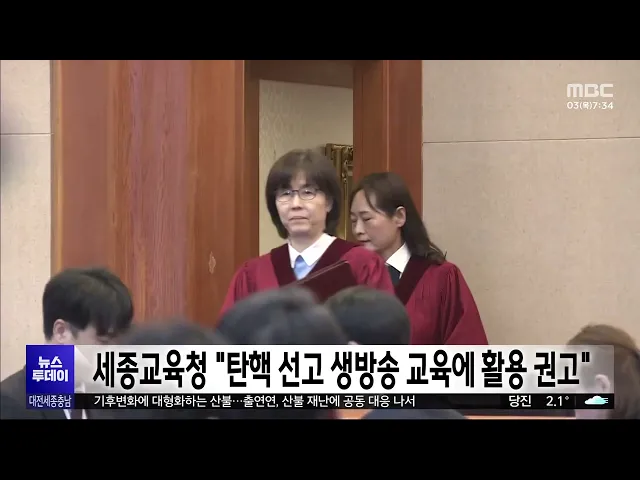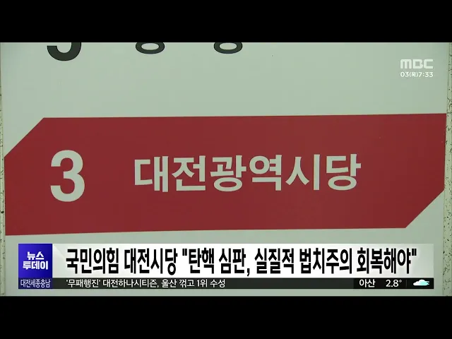 뉴스투데이 뉴스데스크뉴스투데이뉴스데스크 VOD(전체 다시보기)뉴스투데이 VOD(전체 다시보기)유튜브뉴스페이스북 뉴스카카오톡 뉴스인스타그램 뉴스 prev 2025.4.3 - 목요일 next 충남경찰청, 암행순찰차로 교통법규 약 2천 건 단속 충남경찰청이, 올해 들어 암행순찰차를 활용해 교통 법규 위반 1천 9백여 건을 단속했다고 밝혔습니다.위반 유형별로는 속도위반이 1천358건으로 가장 많았고, 신호위반 360건,안전띠 미착용 108건 등으로... 윤소영 레지오넬라균 검출 증가..소독 등 관리 필요 최근 레지오넬라균 검출이 늘고 있어, 보건당국이 다중이용시설 등에 철저한 관리를 요청했습니다.세종시 보건환경연구원은 올해 의뢰받은 25건을 검사한 결과, 12%인 3건에서 레지오넬라균이 검출됐으며 ... 문은선 대전과학산업진흥원, 한남대 캠퍼스혁신파크로 이전 대전시의 과학 정책을 기획하고 평가하는 '시 산하기관'인 대전 과학산업 진흥원이,한남대 캠퍼스혁신파크로 이전합니다.대전과학산업진흥원은 현재 대전시 신성동에 있는 사옥이 지은 지 48년이 지나 낡... 이승섭 산림청, 전국 629개 학교에 무궁화 2만 그루 보급 산림청이 오는 5일 제80회 식목일을 앞두고나라꽃을 통해 민족의 역사를 느끼고 자긍심을 갖도록 전국 629개 초·중·고교에무궁화 묘목 2만 그루를 보급합니다.올해 보급되는 무궁화는 단심계 홀꽃 형태의 ... 김윤미 세종시, 정보통신기술 활용 고독사 위험가구 집중 관리 세종시가 정보통신기술을 활용해, 고독사 위험가구를 집중 관리합니다.시는 고독사 위험군의 휴대전화와 전력 사용량, 앱을 통한 움직임 등을 분석해이상징후가 감지되면 인공지능 안부 연락 발신과 담당 ... 문은선 '주민규 결승골' 대전하나시티즌, 울산에 3대2 승리 프로축구 대전하나시티즌이 울산HD를 꺾고, 리그 단독 1위를 굳게 지켰습니다.대전은 그제 울산 문수경기장에서 열린울산과의 경기에서 2대2로 맞선 후반 18분,주민규가 결승골을 넣어 3대2로 이겼습니다.... 이승섭 대한상의, 대전 진잠초 '다함께 나눔프로젝트' 진행 대한상공회의소가 한화, 코오롱그룹과 함께대전 진잠초등학교에서 '다함께 나눔프로젝트' 행사를 갖고, 미래세대의 환경 인식 향상을 위한 지원계획을 밝혔습니다.한화는 이 학교의 남는 교실을 정비해휴... 문은선 산림청, 늘봄학교 숲교육 본격 운영..전국 253개교 올해부터 늘봄학교 대상이 초등학교 2학년까지로 확대됨에 따라 산림청도 늘봄학교 숲교육 프로그램을확대 운영합니다.올해 늘봄학교 숲교육에 참여를 신청한초등학교는 전국 253개교로, 산림과 목재 교육... 문은선 초등생 '학대·성추행' 40대 과외교사 2심도 중형 대전고법 제3형사부 김병식 부장판사가 자신에게 과외를 받던 초등학생에게 신체·정서적 학대와 성추행을 일삼은 혐의로 기소돼 1심에서 징역 10년을 받은 40대 여성에 대한 항소심에서 징역 8년을 선고했... 김성국 당진 현대제철 노조 파업 중단...임단협 재개 수순 파업 철회와 재개를 반복해 온 현대제철 노조가 당진제철소 냉연공장의 파업을 중단하고 업무에 복귀했습니다.현대제철 노사는 지난해 9월부터임금·단체협약 교섭을 이어왔지만성과금 지급 등을 둘러싼 이... 윤소영 세종교육청 "탄핵 선고 생방송 교육에 활용 권고" 세종시교육청이 내일 예정된 윤석열 대통령에 대한 헌법재판소의 탄핵 심판 선고 생방송 시청을학교 교육에 활용할 것을 권고했습니다.교육청은 민주적 의사결정 과정을 이해하고 헌법 기관의 기능을 확인... 김윤미 국민의힘 대전시당 "실질적 법치주의 회복해야" 국민의힘 대전시당도 대변인 명의의 논평을 내고, 이번 헌법재판소의 탄핵 심판 선고로 실질적 법치주의를 회복해야 한다고 주장했습니다.국민의힘은 "국회의 다수 의석을 가진 야당이 멋대로 입법권을 휘... 이승섭 더민주대전혁신회의 "만장일치로 대통령 파면해야" 윤석열 대통령 탄핵 심판 선고와 관련해 더불어민주당의 이른바 '친명계' 원외조직인 더민주대전혁신회의가 대전시청 앞에서 기자회견을 열어 헌법재판소가 윤 대통령을 만장일치로 파면하라고 촉구했습니... 이승섭 KTX 공주역 10주년 기념식..공주시 "활성화 노력" KTX 공주역 개통 10주년 기념식이,어제 공주시와 코레일 관계자 등 백여 명이 참석한 가운데 열렸습니다.최원철 공주시장은 기념식에서 "공주역과 연계한 관광상품을 개발하고, 철도 운임을 할인하는 등 ... 이승섭 충남도 "전력자립률 고려한 '차등 전기요금제' 시행해야" 충남도와 부산, 인천 등 5개 시도가 "전기를 많이 쓰는 첨단산업 기업들이 해당 지역에 쉽게 이전할 수 있도록 전력 자립률을 고려한 지역별 차등 전기요금제를 시행해달라"는 공동 건의안을 산업통상자원... 최기웅 고교학점제 도입..학교 현장은?/투데이 ◀ 앵 커 ▶올해 고등학교 1학년부터 적성에 맞춰수업 과목을 선택해 듣는, 고교학점제가 전면 시행됐습니다.일찍부터 진로를 고민한다는 취지는 좋지만졸업 요건이 강화되고 다양한 과목 개설에관리, 진로 ... 문은선 탄핵정국 속 'MZ세대'…새로운 주역/투데이 ◀ 앵 커 ▶대통령 탄핵 심판 선고일이하루 앞으로 다가왔는데요.민