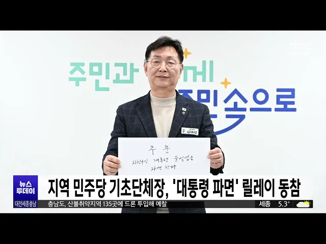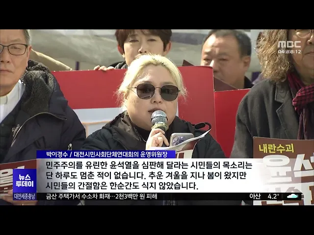 뉴스투데이 뉴스데스크뉴스투데이뉴스데스크 VOD(전체 다시보기)뉴스투데이 VOD(전체 다시보기)유튜브뉴스페이스북 뉴스카카오톡 뉴스인스타그램 뉴스 prev 2025.4.4 - 금요일 next 관세청, 외국 무역선서 마약 2톤 밀수 적발 관세청이 해경과 함께, 강릉시 옥계항에 입항한 외국 무역선에서 코카인으로 의심되는 2톤 상당의 상자 57개를 적발해, 선장 등을 상대로 마약의 출처와 밀수 경로 등을 수사하고 있습니다.이는 우리나라... 문은선 산림청, 청명·한식 맞아 산불 특별 기동단속 산림청이 오늘과 내일 각각 청명과 한식·식목일을 맞아, 성묘객과 입산객이 크게 늘 것으로 보고, 산불 특별 기동단속을 전국적으로 실시합니다.이번 단속에선 불법 소각, 산림 내 흡연,인화물질 사용 등... 문은선 대전 중구, 지역화폐 '중구통' 발행 준비 본격화 대전 중구가, 지역화폐인 '중구통' 발행에 앞서, 현직 통장들로 구성된 홍보단을 꾸려, 연 매출 30억 원 이하인 상점을 대상으로 가맹점 만 곳가량을 모집하기로 했습니다.'중구통'은 오는 6월, 2백억 원 ... 이승섭 충남도, '갯벌생태계 복원' 국가계획 반영 추진 가로림만 서산 갯벌의 유네스코 세계유산 등재가 추진 중인 가운데, 충남도가, 서해안 일대 갯벌생태계 복원 사업을 국가 계획에 반영하기 위해 나섰습니다.이에 따라 서산 오지리와 서천 유부도 등갯벌 4... 최기웅 천안 축구역사박물관 건립 속도..중앙투자심사 통과 천안시가 입장면에 들어설 대한민국 축구종합센터 부지에 추진 중인 축구역사박물관 건립이, 속도를 낼 전망입니다.천안시는 축구역사박물관 건립이행정안전부의 지방재정 중앙투자심사를 통과해사전 행정... 김윤미 민주당 대전시당 "민생·민주주의 회복 바라는 유권자의 선택" 더불어민주당 대전시당이, 그제 대전시의원 유성구 제2선거구에서 민주당 방진영 후보가 당선된 것을 두고, 민생과 민주주의의 회복을 바라는유권자의 단호한 선택이라고 자평했습니다.민주당 대전시장은 ... 이승섭 '보궐선거 패배' 국민의힘 대전시당위원장 사퇴 촉구 그제 대전시의원 유성구 제2선거구 보궐선거에서 패한 국민의힘 대전시당에서, 이상민 시당위원장이, 이번 선거 결과에 책임을 지고 사퇴해야 한다는 주장이 나왔습니다.여황현 전 국민의힘 대전시당 노동... 이승섭 민주당 소속 기초단체장, '대통령 파면' 손글씨 릴레이 동참 윤석열 대통령의 탄핵 심판 선고를 하루 앞두고대전과 충남 지역의 더불어민주당 소속 기초자치 단체장들이, 윤 대통령의 파면을 촉구하는손글씨 쓰기 릴레이에 동참했습니다.정용래 대전 유성구청장과 김... 이승섭 "월급 나눠 줄게" 초유의 대리 입영...1심서 징역형/투데이 ◀ 앵 커 ▶월급을 나눠주기로 약속하고 군대에 다른 사람을 입영시킨 초유의 사건에 대해 법원이 1심에서 징역형을 선고했습니다.국가 행정 신뢰도를 심각하게 훼손했지만, 피고인이 자수한 점 등을 고려했... 김광연 4·2재보선 "탄핵 정국 속 중도 민심 확인"/투데이 ◀ 앵 커 ▶탄핵 정국에서 치러진 첫 선거인 이번 4·2재보궐선거에서 충청 민심 역시더불어민주당을 중심으로 한 야권의손을 들어줬습니다.윤석열 대통령 탄핵 심판을 앞두고 보수와 진보, 진영은 둘로 쪼개... 문은선 탄핵심판 원동력...국민의 '말말말'/투데이 ◀ 앵 커 ▶윤석열 대통령을 오늘탄핵 심판대에 서게 한 원동력, 바로 주권자인 시민들이었습니다.내란에 분노하며 민주주의를 지키려는 시민들의 외침을 고병권 기자가 모아봤습니다.◀ 리포트 ▶1. 군홧발... 고병권 오늘 '운명의 날'..."만장일치로 파면하라"/투데이 ◀ 앵 커 ▶윤석열 대통령의 12·3 비상계엄 선포 이후 122일 만인 오늘 드디어 탄핵 심판 선고가 내려지는데요.그동안 거리로 나와 '윤 대통령 탄핵'을쉬지 않고 외쳐온 시민들의 눈과 귀는 이제 헌법재판소... 김성국