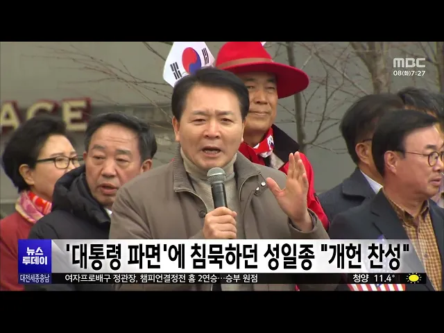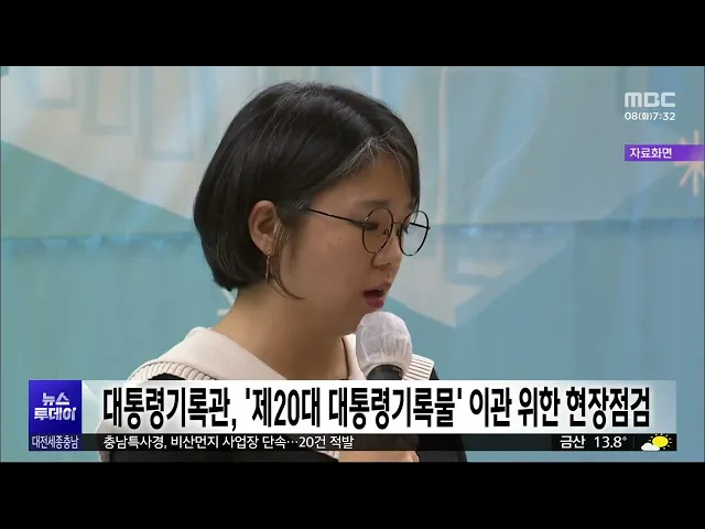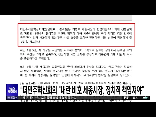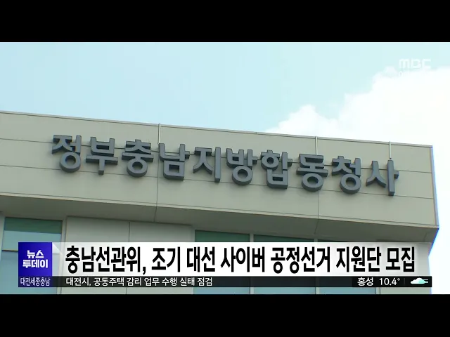 뉴스투데이 뉴스데스크뉴스투데이뉴스데스크 VOD(전체 다시보기)뉴스투데이 VOD(전체 다시보기)유튜브뉴스페이스북 뉴스카카오톡 뉴스인스타그램 뉴스 prev 2025.4.8 - 화요일 next 대전시, 공동주택 감리업무 수행 실태 점검 대전시가 다음 달 말까지, 지역에서 건설 중인 공동주택 18곳을 대상으로, 감리업무 수행 실태를 점검합니다. 시는 감리원의 배치와 근무 실태를 확인하고, 시공계획서에 의해 감리 업무가 수행되는지 살... 이승섭 태안해경, 선박 오염물질 불법 배출 집중 단속 태안해양경찰서가 어제부터 4주 동안, 선박의 오염물질 불법 배출 행위를 집중 점검합니다. 점검 대상은 선박에서 폐유나 분뇨 등 오염물질을 배출하는지와 폐기물 기록부 작성, 해양오염 방지설비 설치 ... 윤소영 충남특사경, 비산먼지 사업장 합동 단속 충남도 민생사법경찰팀은, 지난달 비산먼지 발생사업장 239곳을 대상으로 합동 단속을 진행해, 모두 20건의 위반행위를 적발했다고 밝혔습니다. 주요 위반행위는 비산먼지 발생사업 미신고와 방진망이나 ... 최기웅 충청 유니버시아드대회, 선수촌 조성 종합계획 수립 오는 2027년 8월 충청권이 공동 개최하는 유니버시아드 대회의 선수촌 조성 종합계획이 마련돼, 본격적인 조성에 들어갑니다. 유니버시아드대회 조직위원회는 선수촌을 주거와 국제, 수송, 운동 등 5개 기... 김윤미 대전투자금융, 지역 혁신 기업에 첫 투자 MOU 대전시가 설립한 공공투자기관인 대전투자금융이, 지역 혁신 기업과 첫 투자 협약을 맺었습니다. 대전투자금융은 전자 소재와 배터리 기술을 개발하는 혁신 기업인 주식회사 리베스트와 업무 협약을 맺고,... 이승섭 한화이글스 리그 최하위 추락 등/투데이 ◀ 앵 커 ▶ 한 주간 우리 지역의 스포츠 소식을 전해드리는 스포츠 톡톡 시간입니다. 프로야구 한화이글스가 지난주 1승 4패를 기록하며, 리그 최하위로 추락했습니다. 한화 타선의 부진이 심각합니다. ◀ ... 도심 속 10대들의 무면허 질주...빈틈 보인 차량 대여 시스템/투데이 ◀ 앵 커 ▶ 면허도 없는 10대들이 차량을 몰다, 대전 도심에서 경찰과 추격전을 벌였습니다. 가족의 면허를 도용해 렌터카를 빌린 건데, 렌터카 운전자의 신원 확인 과정에 빈틈이 있다는 지적이 나옵니다.... 이혜현 '졸업식 음주 추태' 홍성표 아산시의장 '출석정지 30일' 졸업식 음주 추태로 빈축을 산 홍성표 아산시의회 의장의 의정 활동이, 30일간 정지됩니다. 아산시의회는 어제 임시회를 열고 홍 의장에 대한 '출석정지 30일' 징계안을 의원 16명 전원 찬성으로 가결했습... 문은선 트렁크에 대형견 묶고 도로 주행한 70대 운전자 입건 차량 트렁크에 묶인 대형견이 끌려가는 장면이 포착되면서, 경찰이 동물보호법 위반 혐의로 70대 운전자를 입건해 조사하고 있습니다. 이 운전자는 그제 오후 1시쯤, 당진시 대덕동의 한 도로에서 트렁크 ... 윤소영 외마디 신고에도...공조 통해 생명 구해/투데이 ◀ 앵 커 ▶ 스스로 목숨을 끊으려던 50대 여성의 신고를 접수한 소방 당국이, 10분 만에 신고자를 구조했습니다. 소방과 경찰, 지자체 관제센터가 힘을 모은 덕분인데, 지난달 말부터 이뤄진 경찰과 소방의... 김광연 충남선관위, 제21대 대선 사이버공정선거지원단 모집 충남선거관리위원회가 제21대 대통령선거를 앞두고, 사이버상에서 선거법을 안내하고 선거범죄 예방·단속활동을 담당할 사이버 공정선거 지원단을 모집하기로 하고, 오는 13일까지 지원서를 접수합니다. ... 최기웅 대통령기록관, '제20대 대통령기록물' 이관 위한 현장점검 윤석열 전 대통령 파면 결정에 따라 행정안전부 대통령기록관이, 내일부터 나흘 동안 제20대 대통령기록물 이관을 위한 현장점검을 실시합니다. 대상은 보좌기관과 경호·자문기관 등 28개 기관으로, 대통... 김윤미 더불어민주당, '세종시 행정수도' 특별법 재추진 더불어민주당이 노무현 정부 시절 추진했다가 헌법재판소의 위헌 결정으로 불발됐던 신행정수도 건설 특별법을, 22년 만에 다시 추진하는 방안을 검토하고 있습니다. 민주당 이재명 대표는 세종시로 행정... 이승섭 과학계 연구자들 "윤 파면은 끝이 아닌 시작이어야" 과학기술계 출연연 연구자들이, 헌법재판소의 윤석열 전 대통령 파면 결정에 대해, "끝이 아니라 시작이어야 한다"고 강조했습니다. 22개 출연연 연구자 2천6백여 명이 회원인 연구발전협의회 총연합회는 ... 조형찬 시민과 함께 지킨 민주주의...'123일의 용기'/투데이 ◀ 앵 커 ▶ 비상계엄 선포 이후 대통령 파면까지 이끈 건, 시민들의 민주주의를 향한 열망이었습니다. 대전MBC도 시민들과 함께, 그리 순탄치만은 않았던 이 모든 과정을 함께 했는데요. 박선진 앵커가 정... 박선진 대통령 파면 '침묵' 성일종 "개헌 국민투표 찬성" 윤석열 전 대통령의 파면과 관련해 사실상 침묵하고 있던 국민의힘 성일종 의원이, 조기대선과 함께, 개헌 국민투표를 동시 실시하는 방안에는 찬성한다며, 민주당과 이재명 대표의 결단을 촉구했습니다. ... 김윤미 더민주혁신회의 "내란 비호 최민호 시장, 정치적 책임져야" 더불어민주당의 이른바 '친명계' 원외조직인 더민주 세종혁신회의가 