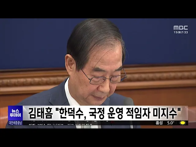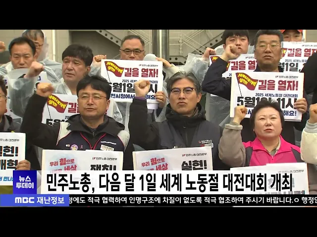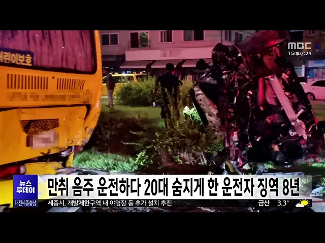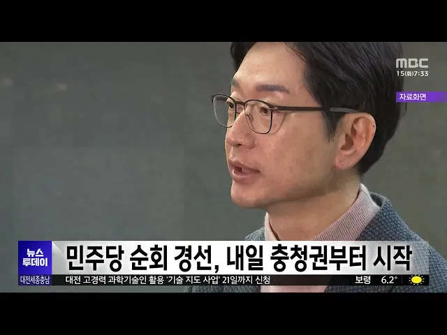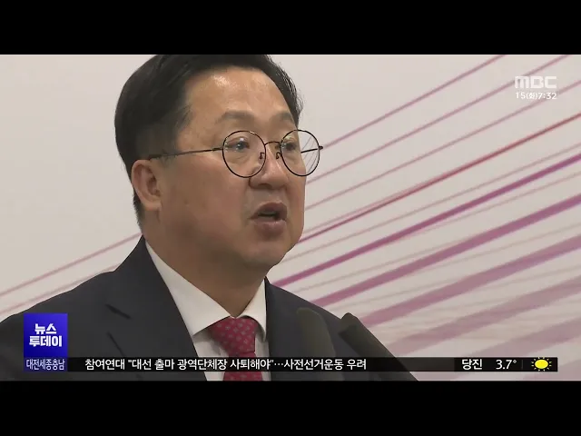 뉴스투데이 뉴스데스크뉴스투데이뉴스데스크 VOD(전체 다시보기)뉴스투데이 VOD(전체 다시보기)유튜브뉴스페이스북 뉴스카카오톡 뉴스인스타그램 뉴스 prev 2025.4.15 - 화요일 next 세종시티앱 모바일 시민증으로 관광 시설 할인 혜택 세종시민은 주민등록초본 등 증빙서류 없이, 세종시티앱 모바일 시민증만으로 지역 관광·문화 시설 입장료를 할인받습니다.방문객은 세종국립수목원, 베어트리파크, 합강·전월산 캠핑장 등에서 세종시티앱... 문은선 세종시, 개발제한구역 내 야영장 등 추가 설치 추진 세종시가 주민 소득 증대와 시민 여가시설 확보를 위해 개발제한구역 안에 야영장과 실외체육시설 한 개씩 추가 설치를 추진합니다.이를 위해 마을 공동으로 추진하거나개발제한구역 내 10년 이상 거주자 ... 문은선 당진 삽교호 드론 라이트쇼, 오는 19일 시작 당진 삽교호 드론 라이트쇼가 오는 19일 시작돼 6월 14일까지 삽교호 바다공원에서 매주 토요일 열립니다.오는 19일 첫 드론 라이트쇼에서는 전통연희학과 풍물놀이, 뮤지컬공연을 시작으로, 당진 방문의 ... 조형찬 민주노총, 다음 달 1일 세계노동절 대전대회 예고 민주노총 대전지역본부가 내란 세력 청산과 노동기본권 쟁취를 위해 다음 달 1일, 세계노동절을 맞아 대전대회를 엽니다.이들은 대전시청 북문 앞에서 대회 선포 기자회견을 열고 “윤 전 대통령의계엄령 1... 이혜현 호남고속철도 신설 노선에 서대전역 빠져..'패싱' 논란 어제부터 운행을 시작한 호남고속철도 노선에서서대전역이 제외돼 이른바 '서대전역 패싱' 논란이 일고 있습니다.이번에 추가 편성된 KTX 전라선 열차는 오전 6시 3분에 전남 여수역을 출발해 전북 익산역... 김지훈 더불어민주당 순회 경선, 내일 충청권부터 시작 더불어민주당이 제21대 대통령 선거 후보를선출하기 위한 권역별 순회 경선을 내일, 충청권부터 시작합니다.민주당 중앙당 선거관리위원회는내일부터 나흘 동안 온라인 투표 등의충청권 순회 경선을 하고,... 김지훈 김태흠 "한덕수, 국정 운영 적임자 미지수" 대선 불출마 의사를 밝힌 김태흠 충남지사가국민의힘 일각에서 제기되는 한덕수 대통령 권한대행 국무총리의 대선 출마설에 대해 부정적인 반응을 보였습니다. 김 지사는 기자회견에서 한덕수 대행 출마설... 최기웅 이장우, 대선 불출마 선언...탄핵 반대 사과 없어 이장우 대전시장이 대선 불출마를 선언했습니다. 이 시장은 "정치적 혼란 속에서 자신이 할 일은 새로운 경쟁에 뛰어드는 것이 아니라, 대전시정을 성공적으로 완성하는 것"이라며 이같이 밝혔지만, 대통... 조형찬 만취 음주 운전하다 20대 숨지게 한 운전자 징역 8년 대전지법 형사9단독은 지난해 8월 대전시 봉명동에서 혈중알코올농도 0.135%의만취 상태에서 운전을 하다 횡단보도를 건너던 20대 남성을 치어 숨지게 한 혐의로 기소된 30대 피고인에게 징역 8년을 선고... 김광연 대전서 조리원 처우 갈등에 학교 2곳 급식 중단 처우 개선을 놓고 교육청과 급식 조리원 사이 갈등이 확산하면서 대전 둔산여고에 이어 글꽃중학교의 급식도중단됐습니다.교육청과 학교비정규직노조 등에 따르면, 글꽃중 급식 조리원 8명은 과중한 업무 ... 조형찬 최근 4년간 카이스트 출신 상장기업 가치 10조 원 넘어 최근 4년간 카이스트 출신 상장기업 기업 가치가 10조 원이 넘는 것으로 나타났습니다.카이스트에 따르면,지난 2021년부터 지난해까지 상장기업 수는 20개로, 이들 기업의 가치는 현재 10조 원이 넘는 것... 고병권 한화이글스 2연속 위닝시리즈 등/투데이 ◀ 앵 커 ▶주간 스포츠 소식을전해드리는 스포츠 톡톡 시간입니다.프로야구 한화이글스가, 지난주 2연속 위닝시리즈를 달성했습니다.부진했던 타선이 살아나며 리그 최하위에서도 탈출하며 7위로 뛰어올랐... 갈등 넘어 통합으로 <염홍철 전 대전시장>/투데이 ◀ 앵 커 ▶12·3 비상계엄과 대통령 파면을 거치면서 대한민국은 보수와 진보, 진영 논리에 따라둘로 쪼개졌습니다.양극단의 분노는 우리 사회 각 분야에큰 상처를 남겼습니다.대전MBC는 극단적 분열과 갈등... 문은선 힘 받는 '행정수도 세종'...대권주자 한목소리/투데이 ◀ 앵 커 ▶윤석열 전 대통령의 파면으로 치러질제21대 대통령 선거가 50일 앞으로 다가왔습니다.대선 주자들은 세종시를 행정수도로 완성하겠다는 공약을 쏟아내 행정수도 완성이이번 대선의 주요 쟁점으로... 이승섭 "부부 싸움하다 추락"...부부 숨지고 딸 부상/투데이 ◀ 앵 커 ▶천안의 한 아파트에서 부부가 함께 추락해 숨지는 사고가 발생했습니다.경찰은 부부 싸움을 하다 홧김에 이같은 일이 벌어진 것으로 보고 경위를 조사하고 있습니다.김성국 기자입니다.◀ 리포트 ... 김성국 미국발 '관세 폭풍'에 총력 대응 나선다/투데이 ◀ 앵 커 ▶미국발 '관세 폭풍'에 전세계 경제가 흔들리고 있는 가운데 수출이 주력인 충남 지역도 비상입니다.충남도가 지역 경제 충격 최소화와 수출 기업 활력 회복을 위한 총력 대응에 나섰습니다. 최... 최기웅