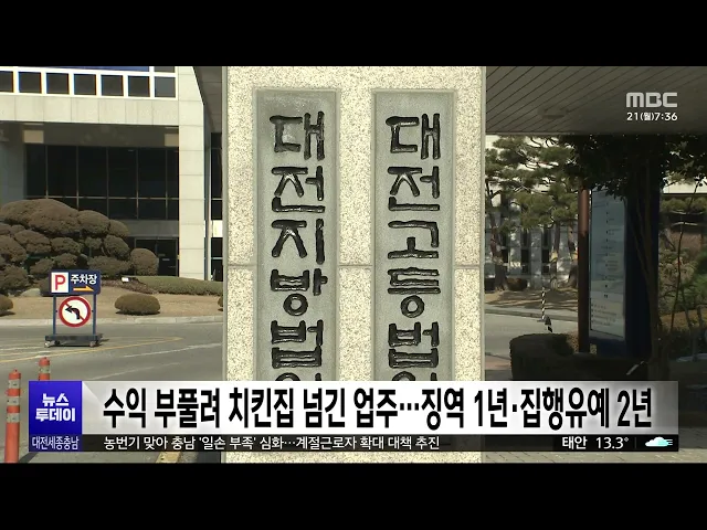 뉴스투데이 뉴스데스크뉴스투데이뉴스데스크 VOD(전체 다시보기)뉴스투데이 VOD(전체 다시보기)유튜브뉴스페이스북 뉴스카카오톡 뉴스인스타그램 뉴스 prev 2025.4.21 - 월요일 next 태안국제원예치유박람회 로고송 공모...내달 15일까지 충남도와 태안군이 공동 개최하는 태안 국제 원예치유박람회의 로고송을, 다음 달 15일까지 공모합니다. 심사를 통해 선정된 6팀에게 총 900만 원의 상금이 배분되며, 신청을 원하는 사람은 30초 이내의 ... 이혜현 충남도, 지역 전통주 10종 선정...국내외 판로 확대 충남도가, 도내 양조장에서 생산한 전통주 가운데 충남의 맛과 멋을 담은 10개 제품을 선정하고, 국내외 판로 확대를 위한 지원에 나섭니다. 이번에 선정된 충남의 10대 전통주는 한산소곡주, 추사애플와... 김지훈 대전·세종·충남 성평등지수 상위권 평가 대전시와 세종시, 충남도의 성 평등지수가, 전국 17개 시도 가운데 상위권으로 평가받았습니다. 여성가족부가 발표한 지난 2023년 기준 '지역성평등지수 측정'에서 대전과 세종, 충남은 서울, 제주와 함께... 이승섭 세종시의회, 학교 체험학습에 안전요원 배치 조례 추진 세종시의회가, 학교에서 현장 체험학습을 떠날 때 안전요원을 배치할 수 있도록 하는 내용의 조례안 개정을 추진합니다. 김효숙 세종시의원이 대표 발의한 조례안은 체험학습에서 안전요원과 보조 인력을 ... 이승섭 한화이글스, 파죽의 7연승...노시환 개인 통산 100홈런 프로야구 한화이글스가 무서운 상승세로 7연승을 달리며, 2위 자리를 지켰습니다. 대전 한화생명 볼파크에서 열린 NC다이노스와의 홈경기에서, 한화는 선발 '폰세'의 호투와 노시환의 홈런을 앞세워, 7 대... 이혜현 충남 내포신도시 병원 건립안, 상임위 부결에도 본회의 직행 충남도가 내포신도시에 의료시설을 건립하려는 계획이, 도의회 전체 의원 표결로 결정될 전망입니다. 국민의힘 소속 충남도의원들은 의료시설 건립안이 상임위에서 국비 확보 불투명 등으로 불결됐지만, ... 김지훈 대전경찰청, 이륜차 집중 단속⋯2시간 동안 51건 적발 대전경찰청이, 지자체 등 관계기관과 함께 지난 18일 낮 2시간 동안 이륜차 집중 단속을 벌여, 도로교통법 위반 45건, 소음기준초과 1건 등, 51건을 적발했습니다. 경찰청은 시민의 안전과 평온한 일상을 ... 이혜현 수익 부풀려 치킨집 넘긴 업주...징역 1년·집행유예 2년 대전지법 형사4단독은, 수익을 속여 치킨집을 양도하려는 혐의로 기소된 치킨집 업주에게, 징역 1년에 집행유예 2년, 사회봉사 80시간을 선고했습니다. 업주는 온라인 커뮤니티에 실제보다 순수익을 부풀... 이혜현 천안서 식당 주인에게 흉기 휘두른 70대 노점상 구속 천안 서북경찰서가, 지난 16일 천안시 서북구의 한 식당에 들어가 50대 주인에게 미리 준비한 흉기를 휘두르고 달아난 혐의로, 70대 노점상을 구속했습니다. 피의자는 피해 업주가 노점상을 옮기라고 요구... 이혜현 세종시, 소상공인 희망장려금 지원사업 시행...최대 24만 원 세종시가 지역 소상공인의 안정적인 경영 환경을 조성하기 위해, 노란우산 공제에 새로 가입한 소기업과 소상공인을 대상으로, 올해 말까지 희망 장려금을 지원합니다. 지원 금액은 가입자 한 곳 당 월 2... 이혜현 세종 아파트 매매가 1년 반 만에 상승세로 전환 세종시 아파트 매매가가, 1년 반 만에 하락세를 멈추고 상승세로 돌아섰습니다. 한국부동산원이 지난 14일 기준 전국 아파트 가격 동향을 조사한 결과, 세종 아파트값이 지난주보다 0.04% 상승해 지난 202... 김윤미 지역 주유소 기름값 석 달째 내림세 대전과 세종, 충남 지역의 주유소 기름값이, 석 달째 내림세를 이어가고 있습니다. 한국석유공사 유가정보시스템 오피넷에 따르면 현재 주유소 휘발유 평균 가격은 대전 ℓ당 1,606원, 세종 1,634원, 충남 ... 이승섭 "사람이 없어요'..농촌 일손 태부족/투데이 ◀ 앵 커 ▶ 날이 풀리면서, 들녘에서는 한 해 농사가 시작됐지만, 일손이 크게 부족한 상황입니다. 인건비도 올랐지만, 그마저도 인력을 구하기 쉽지 않다고 합니다. 농촌 인력난 해소를 위해, ... 최기웅 국민의힘 충남 국회의원, 경선 캠프 분산 합류 국민의힘 소속 충남 국회의원들이, 각각 다른 경선 캠프에 합류해 각개약진에 나서고 있습니다. 한동훈 전 대표의 최측근이었다가 결별한 보령·서천 장동혁 의원은 김문수 후보 총괄선거대책본부장으로 임... 김지훈 이재명 '대세론' 이어가...세종 행정수도 기대감 확산 충청권 순회 경선에서 88.15%의압도적인 득표율로 1위에 오른 민주당 이재명 후보가, 영남권 경선도 압승하며, '대세론'을 이어가면서 지역 공약 실현 여부에관심이 쏠리고 있습니다. 이재명 후보는 국회 ... 김지훈
