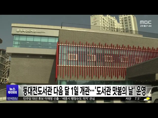 뉴스투데이 뉴스데스크뉴스투데이뉴스데스크 VOD(전체 다시보기)뉴스투데이 VOD(전체 다시보기)유튜브뉴스페이스북 뉴스카카오톡 뉴스인스타그램 뉴스 prev 2025.4.28 - 월요일 next 동대전도서관 다음 달 1일 개관..'도서관 맛봄의 날' 운영 대전의 두 번째 시립도서관인 동대전도서관이다음 달 1일 문을 엽니다.대전시 가양동에 들어설 동대전도서관은지하 1층, 지상 3층 규모로청소년창작실과 실감 체험실 등 체험 공간을마련해 차별화된 도서... 이승섭 충남 교통사고 사망자 62명...경찰 "교통 법규 위반 집중 단속" 올해 들어 충남에서 교통사고로 숨진 사람이 62명에 달하는 가운데,이번 달에만 17명이 숨진 것으로 집계됐습니다.이에 따라 충남경찰청은 서산과 논산, 보령 등 사고가 잦은 6개 시군에 경찰 인력을 집중... 윤소영 세종시, AI 보이스봇 민원상담 도입…24시간 서비스 개시 세종시가 인공지능 보이스봇 기술을 활용한24시간 민원상담 서비스를 도입합니다.시는 오늘부터 민원콜센터에서 안내하는 여권, 주정차 과태료, 축제 등 단순, 반복 민원 5개 분야에 대해 AI 보이스봇을 ... 조형찬 충남 농기원, 벼 직파재배로 노동력·경영비 절감 유도 충남도 농업기술원은 예산군 신안면에서 벼 직파재배 연시회를 열고 드론 직파, 무논 직파, 건답 직파 등 다양한 방식의 직파재배 기술을 선보였습니다. 벼 직파재배는 못자리 설치와 기계이앙 없이 볍씨... 최기웅 파킨슨병 발병에 관여하는 RNA 편집효소 발견 카이스트와 영국 UCL대 등 공동 연구팀이파킨스병 발병에 핵심 역할을 하는 리보핵산, 즉 RNA 편집효소를 발견해 새로운 치료 전략 마련이 기대됩니다.연구팀은 RNA 편집 효소인 '에이다원'(ADAR1)이 파킨... 조형찬 충남도, 석탄화력발전 폐쇄 대응 4개 시군에 지원사업 충남도가보령 당진 서천 태안 등 석탄화력발전소 폐쇄 영향을 받는 4개 시군에소상공인 사업장 시설 개선 등 지원사업에 나섭니다.도가 심의 의결한 지원사업에는공공시설 신재생 에너지 설치와 탄소중립... 고병권 세종 아파트 매맷값 2주 연속 올라 세종시 아파트 매맷값이전국 최대 상승폭을 기록하는 등 2주 연속 올랐습니다.한국부동산원에 따르면,4월 셋째 주 기준 세종 아파트 매매 가격은전주 대비 0.23% 올라, 전국에서 상승폭이 가장 컸습니다.... 고병권 이준석 "세종 발전 위해 KTX 세종역 건립 필요" 연일 세종과 대전을 방문해 충청 표심을집중 공략 중인 이준석 개혁신당 대선 후보가 어제 대전을 찾아 "세종의 발전을 위해 KTX 세종역 건립이 필요하다"고 밝혔습니다.이 후보는 대전컨벤션센터에서 열... 김성국 국힘 대선주자들, 충청권 잇단 방문 공약 발표 국민의힘 대선주자들이 오늘 충청권을잇따라 방문해 중원 표심 잡기에 나섭니다.한동훈 후보는오늘 오전 9시 아산 현충사 참배를 시작으로 국방정책 비전을 발표하고국민의힘 대전시당에서 당원 간담회를 ... 조형찬 민주당 대선 후보 이재명 선출⋯'세종시 행정수도 의지' 관심 더불어민주당 6.3 조기대선 후보로 이재명 후보가 최종 선출된 가운데이 후보의 세종시의 행정수도 추진 의지에관심이 쏠리고 있습니다. 이 후보는 권리당원과 대의원 50%, 국민 여론조사 50%를 합산한 최... 조형찬 '관세 충격' 기술 경쟁력으로 돌파/투데이 ◀ 앵 커 ▶미국발 관세 충격에 중국의 기술 개발로 인해 우리 핵심 수출 산업의 활로가 필요한 상황인데요. 충남의 주력 수출 산업인 디스플레이의 기술 초격차 확대를 위한 핵심기지가 문을 열고 중소·중... 최기웅