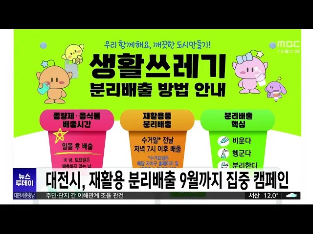 뉴스투데이 뉴스데스크뉴스투데이뉴스데스크 VOD(전체 다시보기)뉴스투데이 VOD(전체 다시보기)유튜브뉴스페이스북 뉴스카카오톡 뉴스인스타그램 뉴스 prev 2025.5.12 - 월요일 next 대전시립연정국악단, '꿈돌이의 꿈' 공연 대전시립연정국악단이 가정의 달을 맞아어린이 음악극 '꿈돌이의 꿈'을 선보입니다.오는 17일과 18일, 국악원 큰마당에서 열리는이번 공연은 대전의 마스코트 꿈돌이가 한빛탑 등 지역 명소를 여행하는 이... 김성국 세종시, 공동주택에 층간소음 측정 서비스 지원 세종시가 올해 말까지 층간소음관리위원회를구성한 공동주택 30여 곳을 대상으로층간소음 측정 서비스를 지원합니다.지원은 소음측정기 무료 대여와 층간소음 예방 교육 등이며, 사업 지원을 원하는 경우 ... 김성국 코레일, 기차역 노숙인 자립 위한 일자리 제공 한국철도공사 코레일이 '2025년 노숙인 일자리 제공 사업'을 진행합니다.코레일은 오늘부터전국 11개 기차역에 있는 노숙인 104명에게역 환경미화와 노숙인 계도 업무 등 6개월짜리 일자리를 제공합니다.... 김성국 고속도로 붕괴 인명 구조 소방관 '라이프세이버' 지난 2월 고속도로 교각 붕괴 현장에서 목숨을 걸고 인명을 구조한 두 명의 소방관이 '라이프세이버'로 인증됐습니다.충남소방본부는 지난 2월 25일 안성시 서운면 세종포천고속도로 교각 붕괴 현장에서 ... 김성국 대전서 자전거 사망사고 급증.."안전모 필수" 최근 대전에서 자전거를 타다 차량에 치여 숨지는 사고가 잇따르자, 대전경찰청이 안전모 착용을 당부했습니다.올해 대전에서 발생한 자전거 교통사고는 지난해 같은 기간보다 15건 늘었으며, 작년 이 기... 김성국 대전시, 재활용 분리배출 9월까지 집중 캠페인 대전시가 재활용품 분리배출 기준에 대한 시민 혼선을 줄이기 위해 9월까지 집중 캠페인에 나섭니다. 시는 음식물류부터 종이·비닐류까지 월별 주제로 카드뉴스를 제작해 온라인에 제공하고, 상가 밀집지... 이교선 디지털온누리 10% 환급 행사…최대 20% 혜택 디지털온누리상품권 할인 혜택이 오는 9월까지 최대 20%로 확대됩니다. 중소벤처기업부와 소상공인시장진흥공단은디지털 온누리상품권 1만 원 이상 사용 시 10%를 환급해 주는 행사를 9월까지 매주 진행한... 이교선 대선 앞두고 세종 집값 '들썩' 5월 첫 주 0.40%↑ 세종시 아파트값이 대선을 앞두고 급등세를보이고 있습니다. 대통령실과 국회 세종 이전 등 정치권의 공약이 쏟아지면서 세종 아파트 거래량은 4월에만 1,290건으로 전달보다 5백건 이상 급증했고, 올해 ... 이교선 대전하나시티즌, 서울과 '0:0'..6경기 무패 행진 K리그1 단독 선두를 질주중인 프로축구 대전하나시티즌이 6경기 연속 무패 행진으로 선두를 지켰습니다.대전은 그제 대전월드컵경기장에서 열린FC서울과의 경기에서, 23개의 슈팅을 퍼부은 서울의 맹공을 ... 김성국 주말 3연전 싹쓸이 '한화' 12연승 대기록 달성 프로야구 한화이글스가 12연승 행진을 이어가며 선두를 굳게 지켰습니다.한화는 어제 키움과의 주말 3연전 마지막 경기에서, 8이닝 무실점 완벽투의 선발 라이언 와이스와홈런 1개 등 11안타를 몰아친 투... 김성국 21대 대선 공식 선거운동 시작, 충청 민심 공략 시동 제 21대 대선의 공식 선거운동이 오늘부터 시작되면서 충청 민심을 잡기 위한 각 당의 선거운동이 본격화됩니다.첫날 더불어민주당은 국회세종의사당 예정지 등에서 지역 선대위 출정식을 갖고, 저녁에는 ... 이교선 대전 둔산 재건축 '시동'..."이해관계 조율이 관건"/투데이 ◀ 앵 커 ▶대전에서도 둔산지구 등 노후계획도시정비법 이른바 재건축 특별법 대상 일부 지역에서 재건축을 본격 추진합니다.올 하반기 선도지구 공모를 앞두고 지역별로 재건축 추진준비위원회를 만들어활... 문은선