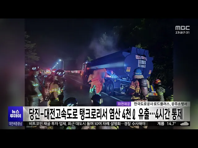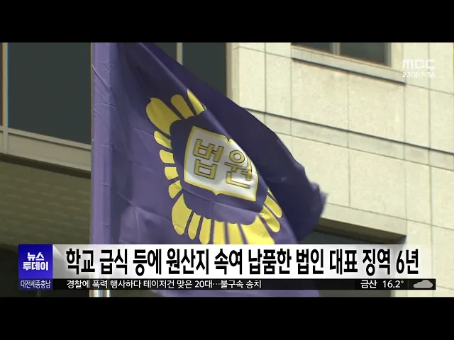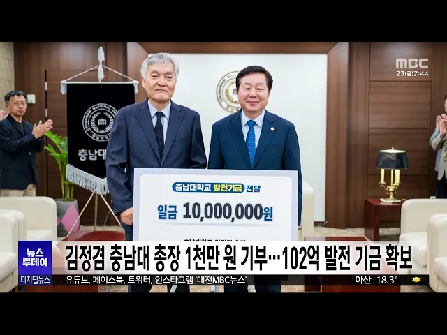 뉴스투데이 뉴스데스크뉴스투데이뉴스데스크 VOD(전체 다시보기)뉴스투데이 VOD(전체 다시보기)유튜브뉴스페이스북 뉴스카카오톡 뉴스인스타그램 뉴스 prev 2025.5.23 - 금요일 next '취임 1년' 충남대 김정겸 총장 발전기금 1천만 원 기부 충남대 김정겸 총장이 취임 1주년을 맞아발전기금 천만 원을 학교에 기부했습니다.김 총장은 재임 1년간 102억 원의 발전기금을모아 역대 최고 실적을 달성한 데 대한감사의 마음으로 기부를 결심했다고 ... 문은선 세종시 평생교육원 준공..교육청 이관돼 11월 개원 세종시민들의 열린 배움터가 될 세종시 평생교육원이 준공돼 오는 11월 문을 엽니다.행정중심복합도시건설청은 6생활권 산울동에 건립한 평생교육원이 준공돼 교육청이 내부 인테리어 공사와 기자재 구축,... 김윤미 세종시, 음식점 무인 단말기·서빙 로봇 등 스마트화 지원 세종시가 음식점과 제과점 등의 인건비 절감을 돕기 위해무인 단말기 등 스마트기술 보급을 지원합니다.대상은 세종시에서 영업 중이면서 소상공인진흥공단 사업 대상에 선정된 업소로,무인 단말기와 디지... 김윤미 충남도, 고병원성 조류인플루엔자 방역대 전면 해제 충남도가 지난해 11월 25일 서산에서 고병원성 조류인플루엔자가 발생하면서 설정했던 방역대 이동 제한 조치를 178일 만에 전면 해제했습니다.방역대 해제에 앞서 충남도는 도내 모든 가금농장과 전통시... 최기웅 충남역사문화연구원 쪼개기 발주·수의계약 감사에 적발 충남도 감사위원회는 충남역사문화연구원에 대한 종합감사 결과 경징계 2건과 기관경고 1건 등 신분상 처분과 함께 주의와 시정 등의 행정상 조치를 요구했다고 밝혔습니다. 감사 결과 연구원은 충남역사... 최기웅 김태흠 지사, 환경부에 지천댐 건설 조속 추진 요청 충남도가 청양 지천댐 건설과 관련해 이달 안에 찬반 여론조사에 나서기로 하면서 반대 주민들의 반발이 확산하는 가운데 김태흠 충남지사가 환경부에 조속한 추진을 요청했습니다.김태흠 충남지사는 김완... 최기웅 학교 등에 원산지 속인 고춧가루 납품..농업회사법인 대표 징역 6년 대전지법 제11형사부는 중국산 원료로 만든 고춧가루를 국내산으로 속여 학교 등에 납품한 혐의를 받는 농업회사법인 대표에게 징역 6년과 벌금 1억 원을 선고했습니다.피고인은 지난 2021년 10월부터 약 ... 김광연 대전교육청-학비노조, 직종교섭 재개..급식 갈등 해결 주목 대전시교육청이 학교비정규직연대회의와당직실무원을 시작으로 직종교섭을 재개해 급식 파행이 해결될지 주목됩니다.최근 두 달 가까이 진행된 조리원의쟁의행위는 노조와의 직종교섭이 결렬돼발생한 것으... 문은선 충청권 시도교육청, 기초학력 격차 해소 공동 대응 충청권 시도교육청이 기초학력 격차 해소에 공동 대응하기로 했습니다.이들은 공주에서 열린 충청권 기초학력세미나에서 공동 문항 개발 등 충청권 공동 문제은행 시스템을 구축해 문항 품질을높이고 비용... 문은선 "장난으로도 안 돼" 선거벽보 훼손 잇따라 제21대 대통령 선거가 10여 일 앞으로다가온 가운데 후보자의 선거벽보와현수막 훼손 사례가 계속 발생하고 있습니다.대전선거관리위원회는 대전에서만 14건의 선거벽보 훼손 등이 발생해 경찰에 수사를의... 문은선 대선 D-11..지역 유권자 향한 정당 행보 이어져 제21대 대통령 선거가 11일 앞으로 다가온 가운데 여야 선대위의 표심 잡기도 활발해지고 있습니다.충청권 과학기술인 천여 명의 이재명 후보 지지 선언을 받아낸 민주당은 대전시당에서 전국대학생위원회... 이승섭 당진대전고속도로 탱크로리서 염산 4천ℓ 유출 어제 저녁 7시 20분쯤 공주시 신풍면당진대전고속도로 당진방향 화흥터널 인근을달리던 25t 탱크로리 차량에서농도 35%의 염산 약 4천ℓ가 유출됐습니다.이 사고로 방제 작업 과정에서 일대 도로가4시간가... 이혜현 협치로 풀어낸 숙원 사업.."주민 위해 맞손"/투데이 ◀ 앵 커 ▶대전 신탄진과 세종 조치원 주민들은인천공항을 오가는 시외버스를 타기 위해멀리 돌아가야 하는 불편을 겪어왔습니다.비슷한 고민을 한 두 지자체가 머리를 맞대길게는 10년 가까이 해묵은 숙제... 이승섭 황새 복원 사업 10년..‘희망의 날갯짓’/투데이 ◀ 앵 커 ▶예산군이 멸종위기에 처한 천연기념물 황새 야생 복원 사업을 시작한 지 올해로 10년을 맞았는데요.자연으로 돌아간 황새들이 전국을 넘어 동북아시아까지 서식지를 넓히는 등 멸종 위기의 불씨... 최기웅 안전사고 부담 때문에.."현장학습 안 가요"/투데이 ◀ 앵 커 ▶요즘 학교마다 현장체험학습 많이 갈시기인데 올해는 체험학습을 가지 않거나축소한 학교가 많습니다.체험학습을 갔던 초등학생이 버스에 치여 숨진 사건의 책임이 교사에게 있다는 판결이 영향... 문은선 '비트코인' 채굴로 평생 수익?..고령층 피해 우려/투데이 ◀ 앵 커 ▶비트코인 채굴 사업에 투자하면매일 1% 수익을 지급하겠다던 일당이지난해 투자 사기로 경찰에 붙잡혔는데요.그런데 이와 비슷한 방식으로 '평생 고수익'을 보장하겠다는 일당이 대전 등 전국에... 윤소영