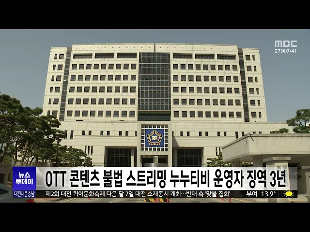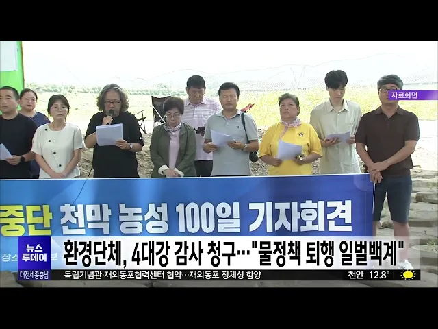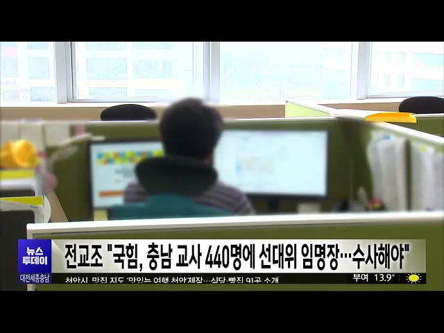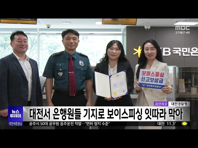 뉴스투데이 뉴스데스크뉴스투데이뉴스데스크 VOD(전체 다시보기)뉴스투데이 VOD(전체 다시보기)유튜브뉴스페이스북 뉴스카카오톡 뉴스인스타그램 뉴스 prev 2025.5.27 - 화요일 next K리그1 대전 이창근, 축구 국가대표팀 선발 K리그1 대전하나시티즌의 골키퍼 이창근이다음 달에 열릴 북중미 월드컵 예선전에 나설국가대표팀에 선발됐습니다.이창근은 대전의 주장이자 수문장으로 지난달,'K리그 이달의 세이브'상을 받는 등뛰어난 ... 이승섭 OTT 콘텐츠 불법 스트리밍 누누티비 운영자 징역 3년 대전지법 형사9단독 고영식 판사는지난 2021년 불법 스트리밍 웹사이트를 만들어국내외 유료 OTT 콘텐츠 등을 무단으로 유통한 혐의로 기소된 누누티비 운영자에게 징역 3년을 선고하고 7억 원을 추징 명... 김성국 공주시 50대 공무원 음주운전 적발..."면허 정지 수준" 공주시 소속 50대 공무원이 음주운전을 하다 적발된 사실이 뒤늦게 알려졌습니다.해당 공무원은 지난달 중순 오전, 공주시의 한 도로에서 경찰의 음주단속에 걸렸고,당시 혈중알코올농도는면허 정지 수준... 윤소영 은행원들 기지로 수천만 원 보이스피싱 잇따라 막아 최근 은행 직원들의 눈썰미와 신속한 신고로수천만 원에 달하는 보이스피싱 사기 피해를 잇따라 막았습니다.지난 21일 대전 가오동의 한 은행에서60대 여성이 손을 떨며 5천여 만 원을 인출하려 하자, 이... 김성국 시설 개량공사로 장항선 등 일반열차 운행 조정 한국철도공사가 오늘과 다음 달 4일서울 금천구청역 선로 분기기 등시설 개량공사로 일반열차 운행이 조정됩니다.상행선 공사를 하는 오늘은경부선과 호남선, 장항선 등 13개 무궁화·새마을 등 열차 운행... 문은선 대전 서구, '신·변종 룸카페' 행정처분 대법원 승소 대전 서구가 신종 청소년 유해 업소인'신·변종 룸카페'에 대해 내린 행정조치가대법원에서 정당하다는 판결을 전국 지자체 가운데 처음으로 받아냈습니다.대전 서구는 지난 2023년 2월, 경찰과 함께유리창... 이승섭 충청권, 정보보호클러스터 구축 사업 선정..5년간 200억 투입 충청권 4개 시도가 2029년까지 5년간국·시비 200억 원을 들여 정보보호 기업과전문인력 양성에 나섭니다.과학기술정보통신부의 지역거점 정보보호 클러스터 구축사업 공모에 충청권컨소시엄이 선정됨에 따... 문은선 홈플러스, 천안·세종 3개 점포 폐점...노조 "고용 불안 우려" 기업회생 절차가 진행 중인 홈플러스가임차료 조정 협상이 지지부진한 전국 17개 점포에 계약 해지를 통보하면서,지역에서는 천안 신방점과 천안점, 세종 조치원점 등 3개 매장이 포함된 것으로 확인됐습... 윤소영 천안아산 강소특구 2단계 사업 본격화..탕정2 배후지 확장 천안아산 강소연구개발특구 2단계 사업이과학기술정보통신부 종합평가를 통과함에 따라본격화합니다.2단계 사업은 내년부터 5년간 국비 100억 원 등 200억 원을 들여 미래차 전장 부품 산업고도화와 글로... 문은선 세종시 금남면 토지거래허가구역 이달 말 전면 해제 세종시 금남면 용포리 등 19개 리38.39㎢ 규모의 토지거래허가구역이 이달 말 전면 해제됩니다.이 지역은 1990년 6월부터 행정중심복합도시 건설 등 각종 개발 호재로 부동산 투기 차단 등을 위해 토지거... 문은선 '특혜 의혹' 당진시 정책특보 사임.."특혜 없어" 대전MBC가 보도한 당진시의 각종 비리 의혹과관련해 특혜 논란이 제기된 당진시 정책특별보좌관이자 당진문화재단 예술총감독이"당진시가 더 이상 불필요한 논란에 휘말리는 것을 원치 않는다"며 "두 직책... 윤소영 대전·세종·충남선관위, 인쇄된 대선 투표용지 점검 대전선거관리위원회가 다음 달 3일 대통령선거를 앞두고 정당 추천 위원이 입회한 가운데 인쇄된 투표용지의 이상 여부와 일련번호 누락, 중복 여부, 청인 인쇄 상태 등을 점검했습니다.세종선관위도 선거... 문은선 환경단체, 4대강 감사 청구..."물정책 퇴행 일벌백계" 환경단체가 윤석열 정부의 물정책 퇴행을 바로잡아달라는 취지의 감사를 청구했습니다.보철거 시민행동은 성명을 통해 환경운동연합이 지난 22일 감사원에 '금강·영산강 보 처리 방안 취소 의결 등의 적절... 김광연 전교조 "국힘, 충남 교사 440명에 선대위 임명장…수사해야" 전국교직원노동조합 충남지부는 성명을 내고 "국민의힘의 황당한 교육특보 임명장을 받은 교사가 충남에서만 최소 440명으로 확인됐다" 교사를 정치적 도구로 이용하지 말라고 비판했습니다. 전교조 충남... 최기웅 한화, 새 구장 첫 끝내기 승...2위 탈환/투데이 ◀ 앵 커 ▶우리 지역의 스포츠 소식을 전해드리는 스포츠 톡톡 시간입니다.프로야구 한화이글스가,롯데와의 치열한 2위 싸움 끝에위닝시리즈를 거두고,다시 2위 자리에 올랐습니다.한화는 팀의 상승세에 더... '초등생 살해' 명재완, 첫 재판서 "혐의 인정·정신감정 신청"/투데이 ◀ 앵 커 ▶대전에서 초등학생을 살해한 혐의로 기소된명재완이 어제 열린 첫 재판에서 혐의를 인정하면서도 정신감정을 요청했습니다.유족과 검찰 측은 납득하기 어렵고필요하지도 않다는 의견인데, 재판부... 김광연 잇따른 고령운전자 사고..."2%만 면허 반납"/투데이 ◀ 앵 커 ▶최근 