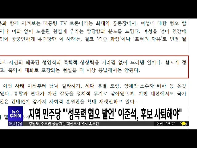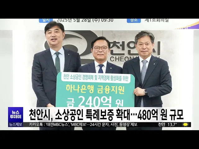 뉴스투데이 뉴스데스크뉴스투데이뉴스데스크 VOD(전체 다시보기)뉴스투데이 VOD(전체 다시보기)유튜브뉴스페이스북 뉴스카카오톡 뉴스인스타그램 뉴스 prev 2025.5.29 - 목요일 next 박수현 의원, 국가유산기본법 등 개정안 2건 발의 더불어민주당 박수현 의원이문화유산 규제와 재산권 침해 문제 간균형을 맞추기 위해 국가유산기본법 등개정안을 대표 발의했습니다.2건의 개정안은 국가유산청이 5년 단위로국가 유산 규제 완화 기본계획... 문은선 천안시, 소상공인 특례보증 확대..480억 원 규모 천안시와 하나은행, 충남신용보증재단이 지역 소상공인 자금난 해소를 위해 업무협약을 맺고 특례보증 사업을 확대 추진합니다.이번 협약에 따라 천안시와 하나은행이각각 10억 원씩을 추가 출연해특례보... 문은선 충남도, 수도권 공공기관 혁신도시 유치 총력 충남도는 수도권 소재 150여개 공공기관에 충남혁신도시의 장점과 정주 여건 등을 담은 이전 제안서를 발송하는 등 맞춤형 유치전에나섰습니다. 도는 충남혁신도시가 도청 소재지로서의 행정 중심 기능을 ... 최기웅 대전 태평·유천지구, 소규모 주택 정비 사업 선정 대전시 태평동과 유천동 일대가정부의 소규모 주택 정비 사업 대상지로선정됐습니다.대전시는 앞으로 5년 동안 국비 240억 원을 확보해 낡은 주거지가 밀집한 해당 지역에주민공동이용시설과 주차장을 조... 이승섭 KIT, 환경 유해물질 PFOA 뇌 염증 유발 규명 주방용품과 섬유, 식품 포장재 등에널리 사용되는 환경 유해 물질인과불화옥탄산이 신경 염증 반응을 유도하는작용 원리를 국내 연구진이 규명했습니다. 국가독성과학연구소 가민한 박사 연구팀은체내 잔... 박선진 KAIST, '대선 캠프와의 과학정책 대화' 개최 카이스트 과학기술정책대학원과 학부·대학원 총학생회가 내일, 주요 정당 대선 캠프 인사와의 토론회를 개최합니다.앞서 지난 12일 한국 과학기술의 위기와 과제에 관한 대선 후보의 의견을 확인하기 위해... 박선진 지역 소비자심리·기업심리지수 상승⋯여전히 '비관적' 대전과 세종, 충남지역 소비자심리지수에 이어 제조업과 비제조업 기업심리지수도 동반 상승했지만 모두 기준값 100을 넘지는 않아 여전히 비관적 수준에 머물렀습니다.한국은행 대전세종충남본부가 발표... 문은선 충남장애인체육대회 오늘 개막...성화 채화 제31회 충남장애인체육대회가 오늘부터 사흘 동안 서산종합운동장 등 일대 17개 경기장에서 펼쳐지는 가운데 개막을 하루 앞둔 어제 성화가 채화됐습니다. 서산시 해미읍성에서 채화된 성화는 해미면과 고... 조형찬 초등생 살해 교사 명재완, 대전 자가 아파트 가압류 초등학생을 흉기로 살해한 혐의로 재판에 넘겨진 명재완 씨의 대전 소재 아파트가 가압류된 것으로 확인됐습니다.대전지방법원 민사28단독은 지난 3월, 대전광역시 학교안전공제회가 명 씨를 상대로 낸 부... 윤소영 '공무원 뇌물 수수 혐의' 스쿨존 보강 사업·인사 청탁 관련돼 관공서의 입찰 계약 과정에서뇌물을 주고받은 혐의로 대전 지역 공무원 10명이 검찰에 넘겨진 가운데 대전 서구의 어린이보호구역 보강 사업도문제가 된 것으로 파악됐습니다.대전 서구는 지난 2023년 4월... 이승섭 서산 모텔서 화재1명 사망·20명 부상 어제 밤 9시 30분쯤, 서산시 동문동에 있는 4층짜리 모텔 2층에서 불이나 1명이 숨지고 20명이 연기를 마시는 등 부상을 입었습니다.소방당국은 관할 전체 소방력을 투입하는 대응 1단계를 발령해 1시간 2... 윤소영 단톡방에 여론 조사 순위 바꿔 공표한 선거구민 고발 세종시선거관리위원회 여론조사심의위원회가 SNS 단톡방에 21대 대통령선거의 여론조사 결과의 순위를 바꿔 공표한 혐의로 선거구민을 세종경찰청에 고발했습니다. 이 남성은 이달 중순쯤 5백여 명이 참... 조형찬 "'성폭력 혐오 발언' 이준석, 대선 후보 사퇴해야" 그제 대통령 후보 TV 토론회에서개혁신당 이준석 대선 후보가 한여성 신체 관련 발언 후폭풍이 거센 가운데지역 정치권에서도 후보 사퇴 요구가 잇따르고 있습니다.더불어민주당 세종시당은 논평에서"이 ... 문은선 "폭염 빨리 온다"..충남 해수욕장 채비 '한창'/투데이 ◀ 앵 커 ▶올해 이른 폭염이 예상되는 가운데 충남 지역 해수욕장도 개장 채비를 서두르고있습니다.오는 31일 바다의 날을 앞두고 보령 원산도 사창해수욕장에서는 환경정화 활동이 진행됐습니다.김광연 기... 김광연 봉사 앞세운 폰지사기..유사 조직 활개/투데이 ◀ 앵 커 ▶노인과 종교인을 대상으로 한코인 투자 사기 정황을 잇따라 전해드렸는데요.이번에는 지난달 대전MBC가 보도한, 봉사활동을 앞세워 신뢰를 쌓은 뒤 수천억 원대 투자 사기를 친 일당과 유사한 조... 김성국 사전투표 시작...지지층을 잡아라!/투데이 ◀ 앵 커 ▶제21대 대선이 이제 닷새밖에 남지 않았고,사전투표도 시작됐는데요.각 후보 진영은 한 명의 유권자라도 더투표장으로 이끌기 위해 지지층을 중심으로총력전을 이어갔습니다. 이교선 기자입니다.... 이교선 이 시각 사전투표소/투데이 ◀ 앵 커 ▶윤석열 전 대통령 파면으로 치러지는제21대 대통령 선거의 사전투표가오늘부터 이틀간 전국에서 