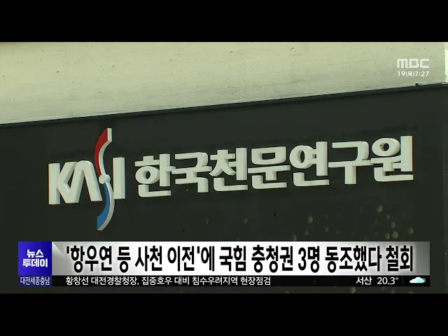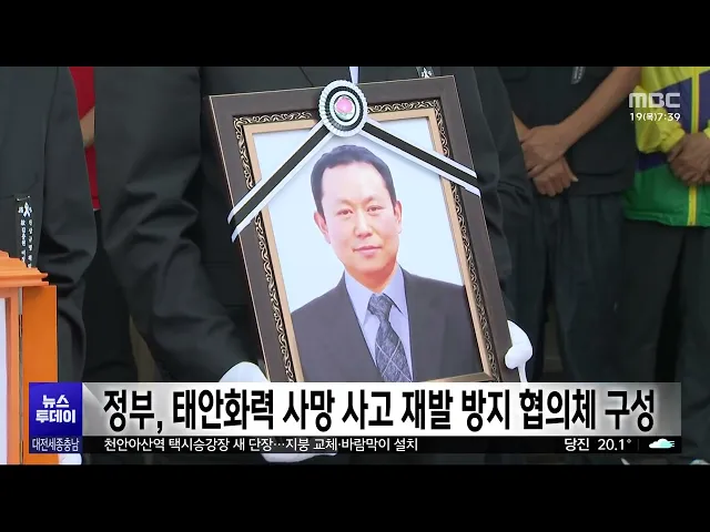 뉴스투데이 뉴스데스크뉴스투데이뉴스데스크 VOD(전체 다시보기)뉴스투데이 VOD(전체 다시보기)유튜브뉴스페이스북 뉴스카카오톡 뉴스인스타그램 뉴스 prev 2025.6.19 - 목요일 next 세종보 재가동..과연 친환경인가?/투데이 ◀ 앵 커 ▶ 각종 지역 의제에 대한 참된 사실이 무엇인지 찾는 팩트체크 기획 '뉴스참'. 두 번째 시간입니다. 이번에는, 윤석열 정부가 재가동을 추진한 세종보 논란에 대해, 두 차례에 걸쳐 검증해보겠습... 김성국 정부, 태안화력 사망 사고 재발 방지 협의체 구성 태안화력발전소에서, 협력업체 직원인 고 김충현 씨가 지난 2일 홀로 일하다 기계에 끼어 숨진 사고와 관련해, 정부가 재발 방지를 위한 협의체를 구성해 운영하기로 했습니다. 국무조정실은 최근 관계 부... 김윤미 "고 김충현 씨 소속 하청업체 부사장, 한전KPS 간부 출신" 한국전력공사 자회사 간부들이 잇따라 하청업체 간부로 재취업했다는 대전MBC 보도와 관련해, 태안화력발전소에서 숨진 김충현 씨가 소속돼 있던 하청업체 '한국파워오엔엠'의 부사장이, 과거 한전KPS의 ... 윤소영 '빛을 만드는 노동자' 고 김충현..16일 만에 영면/투데이 ◀ 앵 커 ▶ 한국서부발전 산하 태안화력발전소에서 홀로 작업하다 공작기계에 끼여 숨진, 비정규직 노동자 고 김충현 씨의 영결식이, 고인이 숨을 거둔지 16일 만에 엄수됐습니다. 동료 노... 최기웅 세종시의원·사무처 직원 소송비용 지원 조례 상임위 통과 세종시의원과 시의회 소속 공무원들이, 직무와 관련한 소송에 휘말렸을 때 소송비용을 지원하는 내용의 조례안이, 시의회 상임위를 통과했습니다. 해당 조례안은 수사를 받거나 기소 또는 피소된 경우, 변... 김윤미 조달청, 한국전력 발주 입찰 관련 '불공정 조달' 5곳 적발 조달청이 한국전력 발주 입찰 과정에서 불공정 조달 행위를 한 5개 업체를 적발해, 1곳은 고발 요청, 4곳은 부당이득금 환수를 결정했습니다. 조달청은 한 업체에 대해서는 한국전력 구매 입찰에 참여하면... 고병권 풀베기 작업하다 참변.."나흘 동안 3명 숨져"/투데이 ◀ 앵 커 ▶ 풀베기 작업에 나선 노동자들이, 차량에 치여 숨지는 사고가 잇따르고 있습니다. 당진에서 풀베기 작업 중이던 60대 노동자 두 명이 숨졌고, 불과 사흘 전에, 세종에서도 비슷한 사고가 있었는... 이혜현 세종 빛축제 예산, 지난해 이어 또 시의회서 '전액 삭감' 세종시가 겨울철 관광 활성화와 이에 따른 지역 상권 회복을 위해 추진하는 빛축제 예산이, 지난해에 이어 올해도 전액 삭감돼, 무산 위기에 놓였습니다. 세종시의회 행정복지위원회는 빛축제 개최를 위해... 김윤미 "구청장 수사해야"…"허위사실 유포 고발"/투데이 ◀ 앵커 ▶ 대전 서구청 전현직 공무원들이 연루된 뇌물 비리 사건이, 지역 정치권의 다툼으로 일파만파 확산하고 있습니다. 서구의회는, 서철모 청장이 몸통이라며 검찰 수사를 촉구했는데, 서 청장은, 내... 이교선 충남도 "주민 76% 지천댐 찬성"..반대대책위 "신뢰성 의문" 청양 지천댐 건설과 관련해 주민 10명 중 7명이 찬성한다는 설문조사 결과를 놓고, 충남도와 반대대책위가 대립각을 세우고 있습니다. 충남도는 지천댐지역협의체가 여론조사기관에 의뢰해 실시한 지천댐 ... 김지훈 '항우연·천문연 사천 이전' 개정안..지역 과학계, 거센 반발 항우연과 천문연의 경남 사천 이전 관련 특별법 개정안과 관련해, 대전지역 과학계의 분노도 들끓고 있습니다. 과기노조 항우연 지부는 성명을 통해 "지역이기주의로 뭉친, 비상식적인 관련 법안을 즉각 ... 김지훈 '항우연 등 사천 이전 개정안'에 국힘 충청권 의원 3명 동조..국힘도 반발 항우연·천문연의 사천 이전 관련 특별법 개정안 발의에, 서산·태안 성일종 등 국민의힘 소속 충청권 국회의원 3명이 공동 발의자로 이름을 올렸다가, 지역 사회의 비난이 확산하자 뒤늦게 철회했습니다. ... 문은선 충남대-공주대, 2028년 통합 대학원 출범/투데이 ◀ 앵 커 ▶ 대전과 충남에서는, 7개 대학이글로컬 예비지정 대학으로 선정돼, 오는 9월 마지막 본지정을 앞두고 있는데요. 특히 통합 모델로 글로컬 본지정을 노리고 있는 충남대와 공주대는, '초광역 국립... 문은선