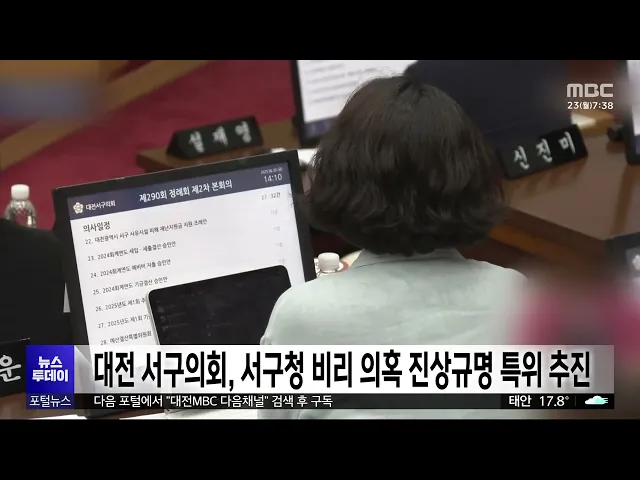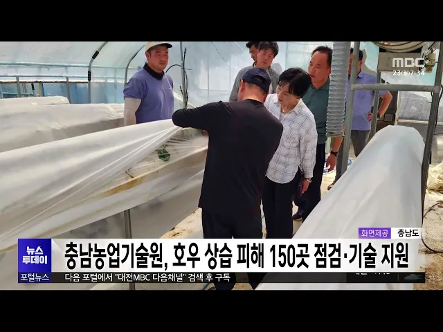 뉴스투데이 뉴스데스크뉴스투데이뉴스데스크 VOD(전체 다시보기)뉴스투데이 VOD(전체 다시보기)유튜브뉴스페이스북 뉴스카카오톡 뉴스인스타그램 뉴스 prev 2025.6.23 - 월요일 next 대전시, 복합터미널 정류장 '스마트 승강장' 설치 대전시는 동구 복합터미널 버스정류장 2곳을스마트 승강장으로 시설 개선 했다고 밝혔습니다.스마트 승강장은 냉난방기와 공기청정기를 갖춰 쾌적한 대기 공간을 제공하며, 55인치 대형 버스 정보 안내단... 김광연 대전시, 대덕 평촌지구 도시개발사업 2단계 용지 공급 대전시가 대덕 평촌지구 도시개발사업 2단계 용지를 다음 달부터 공급합니다.2단계 분양 대상은 모두 53필지로, 산업시설용지 45필지, 지원시설용지 6필지, 주차장용지 2필지 등입니다.특히 100에서 300평... 김지훈 한국전쟁 민간인 희생 대전 골령골서 27일 위령제 6·25 전쟁 시기 우리 군인과 경찰이 민간인을 학살한 대전 골령골에서 제75주기 희생자 합동위령제가 오는 27일 열립니다.대전산내골령골대책회의는 27일 대전시 동구낭월동 현지에서 종교 제례를 시작으... 김지훈 한화 1위 질주, 폰세 개막 10연승· 대체 외인 리베라토 3안타 프로야구 한화 이글스가폰세의 개막 선발 10연승과대체 야수 리베라토의 3안타를 앞세워최하위 키움 히어로즈를 꺾고 1위를 질주했습니다. 한화는 어제 키움과의 홈경기에서10대 4로 완승해, 최근 2연패를... 이교선 대전 상반기 아파트 분양 903가구..지난해 20% 수준 부동산 시장 침체로 올해 상반기 대전의 아파트 분양 물량이 지난해보다 무려 3천 가구 넘게 줄어든 것으로 나타났습니다.부동산 리서치업체 조사에 따르면, 올해 상반기 대전의 아파트 분양 물량은 903가... 김지훈 대전 서구의회, 서구청 비리 의혹 진상규명 특위 추진 대전 서구의회가 최근 불거진 전 비서실장 등구청 직원들의 입찰 비리 혐의와 관련해 진상규명 특별위원회를 구성하기로 했습니다.서구의회는 본회의에서 서다운 의원이 대표 발의한 '서구청 비리 의혹 진... 김지훈 환경단체 "지천댐 건설 추진 중단 공약 이행" 기자회견 개최 청양 지천댐 건설을 두고 충남도와 반대단체가 맞서고 있는 가운데,정부에 댐 건설 추진 중단을 요구하는 기자회견이 개최됩니다.반대대책위 등은 내일 오후서울시 종로구 국정기획위원회 앞에서 기자회견... 김광연 충남 농기원, 장마 대비해 반복 피해 지역 현장 점검 충남도 농업기술원은 집중 호우 피해가 반복된 지역 150곳에 대한 사전점검과 현장 기술 지원을 오는 10월까지 실시합니다.농기원은 시설하우스의 배수 장비와 지지대를 보강하는 등 구조물 안전 상태를 ... 김광연 장마철 병해 발생 우려..생강 재배농가 각별히 주의해야 장마가 시작한 가운데 집중호우로 인한 생강 재배농가의 피해를 막기 위해 배수 관리와 방제가 시급해지고 있습니다. 생강은 고온다습한 환경에서 뿌리썩음병 등 병해 발생이 늘고 배수가 원활하지 않으면... 김광연 충남 장맛비에 4곳 피해..이번 주 후반 장마권 예상 지난 20일부터 이틀 동안 충남 남부에 내린 200mm에 달하는 장맛비에 충남의 시설 4곳이 피해를 입은 것으로잠정 집계됐습니다.그제 새벽 공주시 옥룡동의 공영주차장 옹벽이 무너졌고, 태안군 태안읍의 ... 김광연 "아이들에게 희망이 되길"..생명 살리는 특별한 경매/투데이 ◀ 앵 커 ▶지역의 선한 영향력을 소개하는 이음 순서입니다.경매로 필요한 물건을 저렴하게 사고,경매 수익금은 아픈 아이들의 병원비로 쓰인다면 어떨까요?기증자도, 구매자도 함께 웃을 수 있는 따뜻한 ... 이혜현 '억대 연봉' 청년농.."지역 소멸 막는다"/투데이 ◀ 앵 커 ▶지역 소멸 위기를 겪고 있는 농촌의 새로운 활력으로 등장한 것이 바로 젊은 농부 '청년농'들인데요.충남으로 귀농한 청년농들이 스마트팜을 통해 억대 연봉을 실현하며 꿈을 키워가고 있습니다.... 최기웅