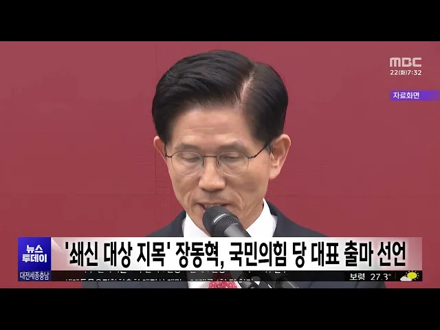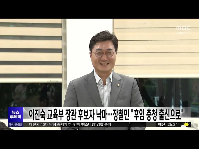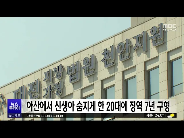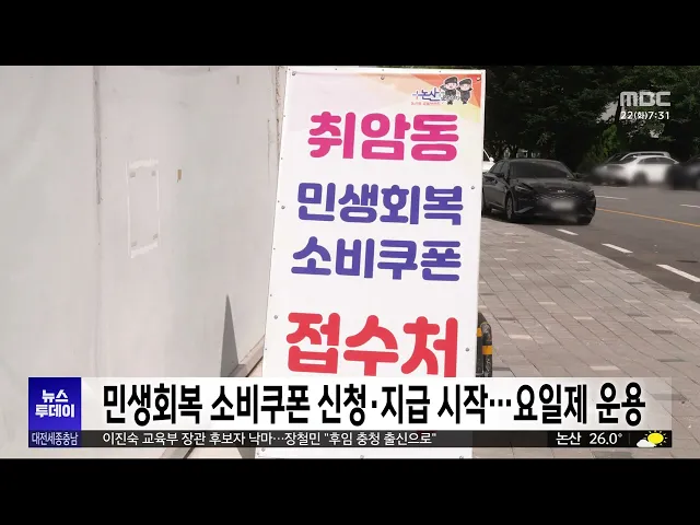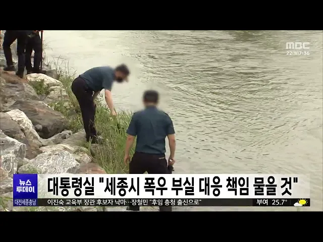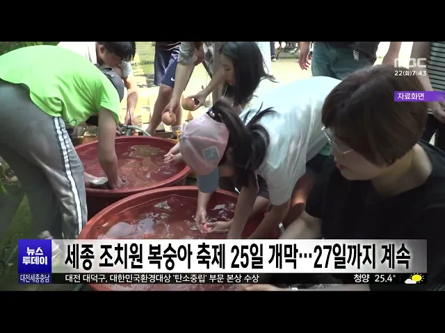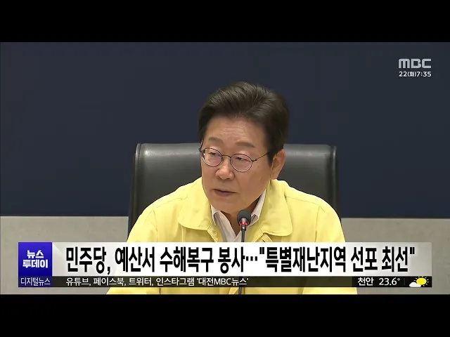 뉴스투데이 뉴스데스크뉴스투데이뉴스데스크 VOD(전체 다시보기)뉴스투데이 VOD(전체 다시보기)유튜브뉴스페이스북 뉴스카카오톡 뉴스인스타그램 뉴스 prev 2025.7.22 - 화요일 next 세종 조치원 복숭아 축제 25일 개막 오는 25일부터 사흘간 세종시 조치원 일원에서 '세종 조치원 복숭아축제'가 열립니다.축제장에선 복숭아를 시중보다 10% 저렴하게살 수 있고 복숭아를 활용한 디저트 만들기 등 다양한 체험은 물론 맥주와... 문은선 아산에서 신생아 숨지게 한 20대에 징역 7년 구형 출산 직후 신생아를 변기에 빠뜨려 숨지게 한 20대에게 검찰이 징역 7년을 구형했습니다.대전지법 천안지원 형사1부 심리로 열린 결심공판에서 검찰은 피고인에게 징역 7년을 선고하고 아동 관련 기관 취... 김광연 40대 남성 숨지게 한 '만취 뺑소니범' 검찰 송치 대전MBC가 단독 보도한 40대 남성이 만취 뺑소니 차량에 치여 숨진 사건과 관련해,대전중부경찰서가 30대 가해 차량 운전자를 검찰에 송치했습니다.해당 운전자는 지난 10일 새벽 3시쯤,만취 상태로 SUV를... 김성국 "수해 현장서 민원인이 군수 폭행"...부여군의회, 유감 표명 박정현 부여군수가 수해 현장 확인 도중 민원인에게 폭행당한 것과 관련해부여군의회가 "공무원에 대한 폭력은 명백한 범죄"라고 유감을 표명한 뒤 "제도 보완이 필요하다"고 밝혔습니다.앞서 지난 17일 ... 김지훈 세종 금강교 인근서 실종자 추정 시신 발견...세종시, 재난체계 강화 지난 17일 세종시 도심 하천에서 급류에 휩쓸려실종된 40대로 추정되는 시신이 어제 오후 세종시 금강교 인근에서 발견돼, 경찰이 정확한 신원 확인에 나섰습니다.특히 이번 실종 사건의 경우 세종시 재난... 김지훈 민주당 "특별재난지역 선포 최선"...행안부, 관련 조사 착수 김병기 민주당 당대표 직무대행 겸 원내대표가 당대표 후보로 나선 정청래·박찬대 의원 등과 함께 예산군 수해 복구 활동에 나서 "조속한 피해 복구를 위해 특별재난지역으로 선포될 수 있도록 정부에도 ... 김지훈 '쇄신 대상 지목' 장동혁, 국민의힘 당 대표 출마 선언 국민의힘 당 혁신위원회가 1차 인적 쇄신 대상으로 지목한 4인 중 한 명인 보령·서천 장동혁 의원이 당 대표 선거에 출마하겠다고 선언했습니다.장동혁 의원은 자신의 SNS에 "연일 내부 총질자들에 의해 ... 이승섭 이진숙 교육부 장관 후보자 낙마...장철민 "후임도 충청 출신" 이재명 정부의 유일한 충청권 장관 후보였던이진숙 교육부 장관 후보자가 낙마하면서후임 인선에 관심이 모아집니다.이재명 대통령은 그제 논문 표절 의혹을비롯해 인사 청문회 과정에서 교육 정책에 대한... 문은선 민생회복 소비쿠폰 어제부터 신청·지급 시작 민생 회복 소비 쿠폰이 어제부터신청과 지급 절차에 들어갔습니다.1차 신청 첫 주인 닷새 동안은신청이 몰릴 것에 대비해 출생 연도 끝자리를기준으로 요일제를 운용하는데, 신청 첫날인 어제, 지역 행정... 김지훈 '9연승' 한화, '1위 독주' 체제 굳혀/투데이 ◀ 앵 커 ▶스포츠톡톡 시간입니다.프로야구 한화이글스가, KT와의 3연전을 모두 휩쓸며9연승을 달리고 있습니다.대체 외국인 타자로 합류했던리베라토는 지난 토요일,잔여 시즌 한화와 함께하기로 정식 계... 복구 절실한 피해 지역..."작은 힘도 큰 도움"/투데이 ◀ 앵 커 ▶역대급 폭우가 남긴 상흔을 치유하기 위해 피해 지역마다 도움의 손길이 이어지고 있는데요.하지만 전국 곳곳에서 수해 피해가 동시다발적으로 발생하면서 복구 일손이 크게 부족한 상황이라고 ... 김광연 "어디부터 손대야 할지"...충남 피해 '1천억 육박'/투데이 ◀ 앵 커 ▶극한 호우가 휩쓸고 간 충남에서는 4백헥타아르 넘는 농경지가 침수되거나 유실됐고 1천억 원 가까운 피해가 발생한 것으로 잠정 집계됐습니다. 복구는 시작됐지만 이재민들은 어디서부터 손을 ... 최기웅 "더는 비극이 없기를" 폐지 주워 기부한 80대/투데이 ◀ 앵 커 ▶대전에서 생활고에 시달리던 어머니와 아들이 숨진 지 20여 일 만에 발견됐다는 대전MBC 단독 보도 이후, 이재명 대통령이더욱 촘촘한 복지 행정을 지시했는데요.대전의 한 80대 어르신은생활고 ... 이승섭