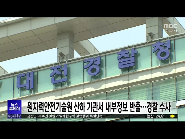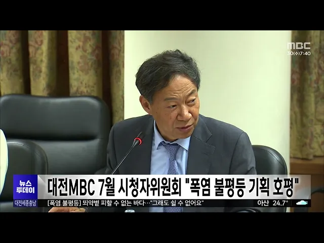 뉴스투데이 뉴스데스크뉴스투데이뉴스데스크 VOD(전체 다시보기)뉴스투데이 VOD(전체 다시보기)유튜브뉴스페이스북 뉴스카카오톡 뉴스인스타그램 뉴스 prev 2025.7.30 - 수요일 next 특허청, '짝퉁' 자동차 부품 판매 일당 적발 특허청 상표 특별사법경찰이, 경기도 일대에서 일명 '짝퉁' 자동차 부품 등을 유통한 사업장 3곳을 단속하고, 업주 등 5명을 불구속 입건했습니다. 또, 13톤 분량의 짝퉁 자동차 부품 7천여 점과 안전벨트... 문은선 원자력안전기술원 산하 기관서 내부정보 반출…경찰 수사 대전 한국원자력안전기술원 국제 원자력안전학교에서, 내부 정보가 반출됐다는 의혹이 제기돼 경찰이 수사에 나섰습니다. 원자력안전기술원은 지난달 17일, 행정 업무를 맡은 연구원의 컴퓨터에서 하드디... 박선진 경찰관이 참고인 조사받은 시민에 수십 번 장난 전화..감찰 착수 천안 서북경찰서가, 참고인 조사를 받은 시민에게 수십 차례 장난 전화를 건 경찰관을 대기 발령하고, 감찰 조사에 나섰습니다. 해당 경찰관은 지난 16일 지구대 업무 전화로 전날 참고인 조사를 받은 시... 김지훈 '간판 추락' 한화 새구장, 대전시 '부실 점검' 의혹/투데이 ◀ 앵 커 ▶ 대전한화생명볼파크가, 프로야구 경기 직전에 복도 천장에 매달린 간판이 떨어지면서, 안전 관리가 도마 위에 올랐습니다. 그런데, 두 달 전 정부가 지시한 야구장의 특별 안전 점검에서는, 문... 이승섭 대전MBC 7월 시청자위원회 "폭염 불평등 기획 호평" 대전MBC에서 열린 7월 시청자위원회에서 위원들은, 기후 변화로 가속화되는 폭염 불평등 기획보도를 호평하고, 폭염에 취약한 노동현장의 상황도 점검해달라고 요청했습니다. 또 초등 교과서 백제역사 왜... 김지훈 대전MBC '태안화력, 6년 만에 반복된 죽음' 이달의 방송기자상 수상 태안화력 하청 노동자 고 김충현 씨 사망 사건을 심층적으로 파헤친 대전MBC 연속보도, '6년 만에 반복된 죽음'이, 방송기자연합회의 제201회 이달의 방송기자상 '지역취재보도' 부문을 수상했습니다. 윤... 김윤미 '전 당직자 성폭력' 국민의힘 "방조·책임 회피" 규탄 대전 지역 여성과 시민사회단체가 국민의힘 대전시당 앞에서 기자회견을 열어, 전 당직자 성폭력 사건의 진상 조사와, 재발 방지 대책 마련을 촉구했습니다. 이들은 "국민의힘이 이번 사건에 변명과 꼬리 ... 이승섭 대전서 30대 여성 흉기에 피살.."112에 4차례 신고"/투데이 ◀ 앵 커 ▶ 어제 대전의 한 주택가에서, 30대 여성이 흉기에 찔려 숨졌습니다. 경찰은 피해 여성과 사귀던 20대 남성을 용의자로 보고 쫓고 있는데, 최근까지 주거침입 등으로 이미 4차례나 112 신고가 이... 김성국 올 상반기 충청권 경기 '평이'⋯건설·민간소비 '위축' 올 상반기 충청권 경기가 지난해 하반기와 비슷한 수준을 보였지만, 건설과 민간소비가 다소 위축된 것으로 나타났습니다. 한국은행 대전세종충남본부의 올 상반기 경제 모니터링 결과, 반도체 수요가 증... 문은선 세종시에 국가재난대응시설 건립⋯재난 컨트롤타워 역할 전국적인 재난에 신속히 대응할 재난 컨트롤타워가, 세종시에 들어섰습니다. 행정중심복합도시건설청은 다정동에 지하 1층, 지상 3층 규모의 국가재난대응시설 건립을 마치고, 다음 달 운영기관인 소방청... 문은선 대전시-정부-LH, 대전교도소 이전 협의체 구성 대전시와 법무부, 기획재정부와 한국토지주택공사가, 대전시의 숙원 사업인 '대전교도소의 이전'을 추진하는 협의체를 구성했습니다. 이들 기관은 국회에서 간담회를 열어 이같이 결정하고, 오는 10월까지... 이승섭 '대전·충남 행정통합' 시도의회 통과.."밀실 통합' 반발 지난 23일 대전시의회가 '대전·충남 행정통합' 의견 청취 안건을 가결한 데 이어, 충남도의회도 관련 안건을 통과시켰습니다. 지방자치법에 따라 행정구역을 통합할 때는 주민투표를 하거나 의회 의견 청... 김지훈 폭염이 달군 어촌.."하루도 쉴 수 없어요"/투데이 ◀ 앵 커 ▶ 기후 위기 속 '폭염 불평등' 실태를 짚어보는 기획보도, 네 번째 순서입니다. 뙤약볕에 달궈진 배 갑판과 갯벌에서 일해야 하는 어민들은, 바다가 내뿜는 수증기까지 더해져, 그야말로 찜통더위... 이혜현 충남 천수만 해역에 '고수온 주의보' 발령 연일 폭염이 이어지면서, 충남 천수만 해역에 고수온 주의보가 발령됐습니다. 충남도는 현장대응반을 꾸려 용존산소를 충분하게 공급하고, 먹이 공급을 중단하는 등 양식 환경 개선 대책을 추진합니다. 충... 이승섭 세종시 테니스팀 13년 만에 해체⋯유도팀 창단 추진 세종시 출범에 맞춰 창단한 시청 소속 테니스팀이, 13년 만에 해체됩니다. 세종시는 열악한 재정 상황을 고려했을 때 연간 10억 원이 넘는 예산을 투입해 테니스팀을 운영하는 데 어려움이 있고, 연봉 인... 문은선 세종시민단체, 해수부 이전 헌법소원 청구.."위법한 공권력 행사" 정부의 해양수산부 부산 이전과 관련해, 세종 시민단체와 소상공인들이 헌법소원을 청구하기로 했습니다. 해수부 시민지킴이단 등은 세종시청에서 기자회견을 열고 "해수부뿐 아니라 세종에 있는 한국해양... 문은선 국토부장관 후보자 "세종의사당 완공 앞당길 것"/투데이 