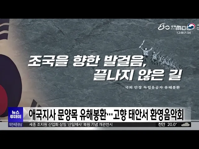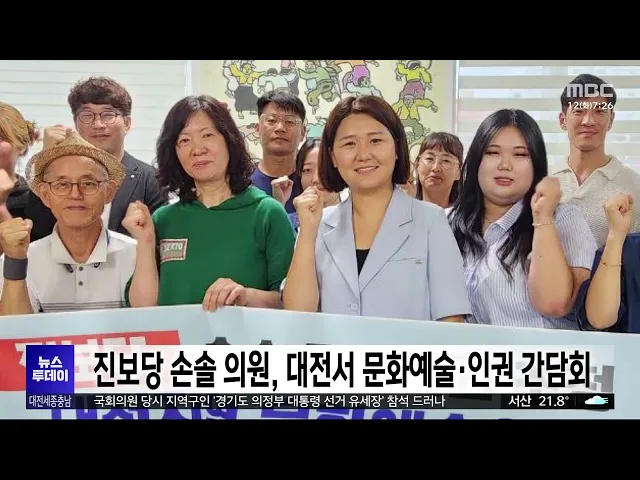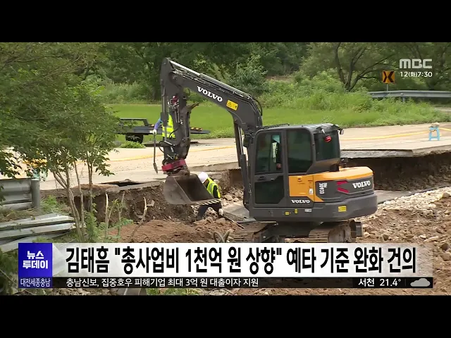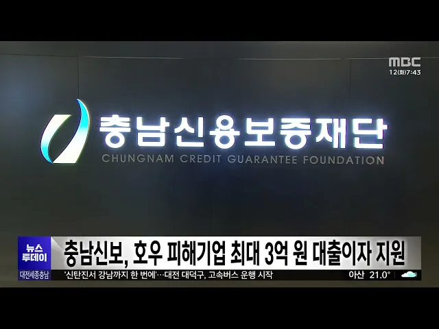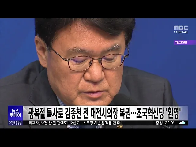 뉴스투데이 뉴스데스크뉴스투데이뉴스데스크 VOD(전체 다시보기)뉴스투데이 VOD(전체 다시보기)유튜브뉴스페이스북 뉴스카카오톡 뉴스인스타그램 뉴스 prev 2025.8.12 - 화요일 next 충남신보, 집중호우 피해기업 최대 3억 원 대출이자 지원 충남 신용보증재단이 집중호우로 피해를 본 기업을 위해, 대출 이자 일부를 지원합니다. 지원 대상은 호우 피해 중소기업과 소상공인으로, 최대 3억 원까지 1년간 최대 연 2.7%의 이자를 지원합니다. 또, ... 최기웅 대전교육청 학교 급식 조리원 전담 대체 인력 채용 대전시교육청이, 학교 급식 조리원 전담 대체 인력을 채용합니다. 이번 채용은 학교 급식 조리원이 병가 등 휴가를 사용할 때 공백을 메울 대체인력을 확보하기 위한 것으로 모두 12명을 뽑습니다. 신청자... 고병권 광복절 특사로 김종천 전 대전광역시의장 복권 정부가 80주년 광복절을 맞아 단행한 대규모 특별사면에, 지역에서도 김종천 전 대전시의회 의장이 포함돼 복권됐습니다. 또, 조국 전 조국혁신당 대표와 부인인 정경심 전 동양대 교수를 비롯해 윤미향, ... 이교선 한화, '이적생' 손아섭 맹활약..선두 2G 차 추격/투데이 ◀ 앵 커 ▶ 스포츠 톡톡 시간입니다. 프로야구 한화이글스가 지난 주말 LG와의 3연전 마지막 경기에서 승을 따내며, 1위와의 격차를 2경기 차로 좁혔습니다. 특히 1번 타자로 나선 손아섭이, 이... 대전 도심서 '교제 살인' 장재원 신상 공개/투데이 ◀ 앵 커 ▶ 대전 도심 주택가에서 옛 여자친구를 살해한 혐의를 받는 26살 장재원의 얼굴이 공개됐습니다. 피해가 중대하다는 이유였는데요. 사건 전, 신변에 위협을 느껴 경찰에 수차례 신고까지 한 피해... 윤소영 천안흥타령춤축제 9월 24일~29일까지 열려 올해 천안 흥타령 춤 축제가, 다음 달 24일부터 닷새간 천안종합운동장 일원에서 열립니다. 올해는 기존의 대중적인 춤 프로그램과 함께 댄스스포츠를 새로 선보이고, 대한민국무용대상을 경연에 추가하는... 문은선 아산시, 불법하도급 의심 건설 현장 단속 정부의 건설업 불법하도급 강력 단속 방침에 따라, 아산시가 국토교통부가 통보한 불법하도급 의심 현장에 대한 단속에 나섭니다. 시는 현장 점검과 서류 검토 등을 통해 위반 여부를 확인할 예정이며 일... 문은선 내년 도입 앞둔 국가 '슈퍼컴퓨터 6호기' 명칭 공모 내년에 도입될 국가 초고성능 컴퓨터, '슈퍼컴퓨터' 6호기 명칭이, 공모를 통해 결정됩니다. 한국과학기술정보연구원은 내년 상반기 구축을 완료하고 운영에 들어갈 국가 슈퍼컴퓨터 6호기의 공식 명칭을 ... 김윤미 서산시 "수해 복구 총력"..시민체육대회 취소 서산시가 지난달 극한호우로 발생한 피해 복구와 일상 회복이 최우선이라며, 다음 달 20일부터 이틀간 개최할 예정이던 시민체육대회를 취소했습니다. 가장 먼저 특별재난지역으로 선포된 서산에서는 극한... 최기웅 문양목 지사 유해봉환 앞두고 고향 태안서 환영음악회 120년 만에 고국으로 돌아오는 독립유공자 문양목 지사의 유해봉환을 앞두고, 고향인 태안에서 환영음악회가 열립니다. 태안군은 대동보국회를 결성하는 등 독립운동에 헌신한 문양목 지사의 유해가 인천... 김윤미 광복 80주년 맞았지만..여전히 잊힌 이름들/투데이 ◀ 앵 커 ▶ 올해는, 일본에 빼앗겼던 우리나라의 주권을 되찾은 광복 80주년입니다. 대전MBC는, 나라를 지키고자 한 독립운동가들의 희생을 잊지 않고, 진정한 광복의 의미를 돌아보는 기획보도를 마련했습... 박선진 충남도, 예타 기준 완화 건의...'1천억 상향' 김태흠 충남지사는 도청에서 임이자 국회 기획재정위원장을 만나, 예비타당성 조사 대상 사업의 기준 상향 조정과 함께, 수해 피해 지방하천·소하천에 대한 개선복구 사업비 지원 등을 요청했습니다. 김 ... 최기웅 세종서 대한민국시도의회의장협의회 정기회 열려 대한민국 시도의회 의장협의회 정기회가, 어제부터 오늘까지 이틀간의 일정으로 세종컨벤션센터에서 열립니다. 시도의회 의장들은 행사에 참석한 김민재 행정안전부 차관에게 지역소멸의 문제점을 공유하... 문은선 국회, 세종의사당 설계 공모 관리용역 착수 국회사무처가 국회세종의사당 설계 공모 관리용역에 착수했습니다. 이번 용역은 세종의사당 설계 공모의 체계적인 기획·관리를 위한 것으로, 한국건축가협회가 15개월 동안 공모를 위한 지침서 작성, 작품... 문은선 최민호 세종시장 "여가부 등 세종 이전해야"/투데이 ◀ 앵 커 ▶ 해양수산부 부산 이전이 속도를 내면서, 세종시가 여성가족부 등 미이전 중앙부처의 세종시 이전을 공식 제안했습니다. 법 개정 없이도 이전 가능한, 대통령 소속 위원회 이전도 요구했는데요. ... 문은선 진보당 손솔 의원, 대전서 문화예술·인권 간담회 최연소 국회의원인 진보당 손 솔 의원이 어제 대전을 찾아, 시민들과 간담회를 열었습니다. 문화체육관광위원회 소속인 손 의원은 오늘 오후 대전 예술가의 집에서 민예총 등 지역 문화예술인을 만나 현장... 이교선 "의정부 행사마다 출석"..전희경 원장 '정치적 중립' 논란/투데이 ◀ 앵 커 ▶ 국민의힘 전 의원 출신인 전희경충남연구원장이, 대선 유세장은 물론, 경기