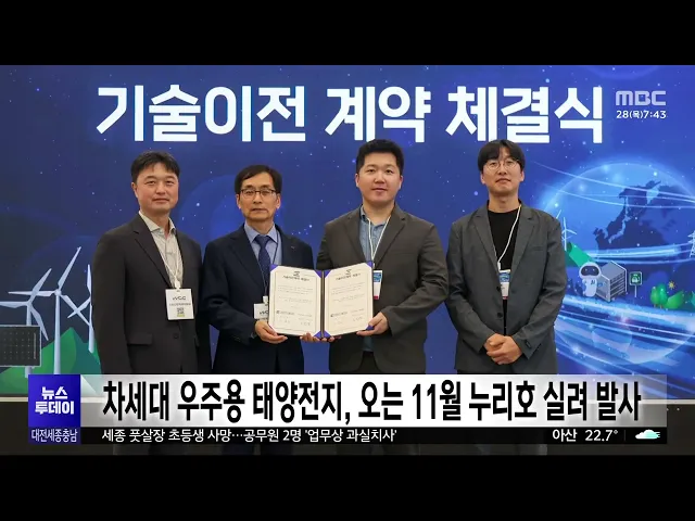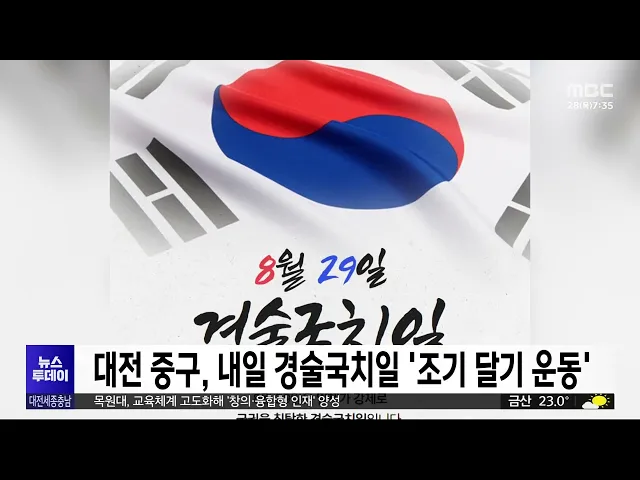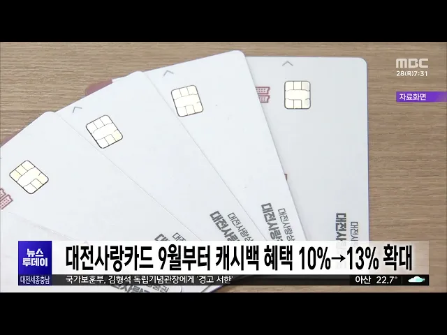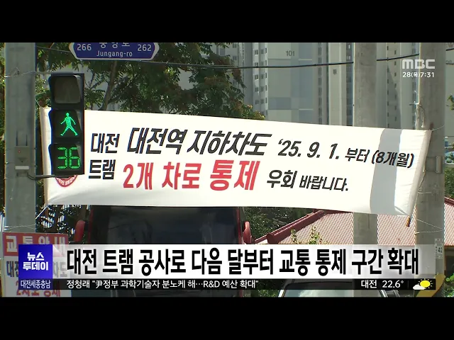 뉴스투데이 뉴스데스크뉴스투데이뉴스데스크 VOD(전체 다시보기)뉴스투데이 VOD(전체 다시보기)유튜브뉴스페이스북 뉴스카카오톡 뉴스인스타그램 뉴스 prev 2025.8.28 - 목요일 next 대전시 산하기관 노조, 임단협 공동투쟁 출정식 대전교통공사, 대전도시공사 등 대전시 산하기관 노동조합으로 구성된 대전투자기관 노동조합 협의회가, 대전 평화의 소녀상 앞에서 임단협 공동투쟁 출정식을 열고, 투쟁 돌입을 선언했습니다. 이들은 산... 문은선 '논산시 제작' 아동권리송, 번개맨 통해 전국 방송 논산시가 지난 2017년, 아동의 존엄성을 알리기 위해 제작한 노래 '우리는 모두 소중해'가, 오는 30일 EBS 1TV 어린이드라마 '지구 영웅 번개맨' 특별편에서 소개됩니다. 해당 노래는 우주 괴물과 맞서 싸... 문은선 차세대 우주용 태양전지, 오는 11월 누리호 실려 발사 한국 에너지기술연구원과 기업이 공동 개발한 차세대 우주용 태양전지가, 오는 11월 4차 발사가 예정된 누리호에 실려, 우주로 향합니다. 이번에 누리호에 탑재될 우주용 태양전지는 소형 위성의 수명과 ... 김윤미 끝나지 않는 폭염과의 사투/투데이 ◀ 앵 커 ▶ 절기상으로 가을바람이 불기 시작한다는 처서가 지났지만, 폭염의 기세가 누그러들지 않고 있습니다. 농촌 들녘에서는, 온열질환 예방을 위해 드론이 날아다니고, 바다 수온이 오른 서... 최기웅 세종 풋살장 초등생 사망..공무원 2명 '업무상 과실치사' 송치 세종 남부경찰서가 지난 3월 풋살장에서 골대가 넘어져 초등학생이 숨진 사고와 관련해, 세종시 시설관리사업소 공무원 2명을 업무상 과실치사 혐의로 검찰에 송치했습니다. 이들은 지난 3월, 세종시의 공... 김성국 JMS 피해자 '메이플', 경험 담은 책 '흔적' 출간 여신도들에게 성폭력을 저지른 혐의로 기소돼, 대법원에서 징역 17년 형이 확정된 JMS 총재 정명석 사건과 관련해, 피해자인 홍콩 국적 여신도 메이플 씨가, 자신의 경험을 담은 책 '흔적'을 출간했습니다... 김성국 국민의힘 충남도당 "잇단 비리 혐의 태안군수 사퇴해야" 업무상 횡령 혐의로 검찰 수사를 받는 가세로 태안군수에 대해, 국민의힘 충남도당이 사퇴를 촉구했습니다. 국민의힘 충남도당은 성명을 통해 "청탁금지법 위반 혐의로 경찰 수사를 받는 가세로 군수가 또... 이승섭 "사진 찍는 거 보니 딱 수거책" 휴가 중 경찰에 덜미/투데이 ◀ 앵 커 ▶ 대전에서 현금다발이 든 종이 가방을 건네받은 보이스피싱 수거책이, 현장에서 검거됐습니다. 마침 보이스피싱을 전담하는 경찰이, 휴가 중에 인근을 지나다 수상한 낌새를 알아챈 덕분인데요. ... 이혜현 청양군, 집중호우 피해 주민 지방세 감면 추진 청양군이 지난달 폭우로 재산 피해를 본 군민들을 대상으로, 지방세 감면을 추진합니다. 감면 대상은 집중호우로 피해를 본 주택과 건축물, 토지, 차량 등에 부과된 재산세, 주민세, 자동차세 등으로, 국... 최기웅 천안시, 산업단지 출퇴근 돕는 '스마트셔틀' 무료 운행 천안시가, 산업단지 근로자의 출퇴근을 돕는 '스마트셔틀'을, 다음 달 8일부터 시범 운행합니다. 스마트셔틀은 고정 노선형 버스 3대와 실시간 호출형 택시 6대가 결합한 형태로, 평일 오전 7시부터 오후 ... 김윤미 대전 중구, 내일 경술국치일 '조기 달기 운동' 대전 중구가 오는 29일 경술국치일을 맞아, 조기 달기 운동을 전개합니다. 경술국치일은 1910년 8월 29일 일제가 강제로 국권을 침탈한 날로 중구는 이를 추념하기 위해 본청과 동 행정복지센터, 산하기관... 문은선 위자료 소송에 보훈부도 '경고'..지지단체 "낙인찍기"/투데이 ◀ 앵커 ▶ 광복절 경축식 기념사로 다시 불붙은 독립기념관 김형석 관장을 둘러싼 논란이, 열흘 넘게 이어지고 있습니다. 보훈부 장관의 엄중 경고와 함께, 시민들도 독립운동 역사를 부정한 사람에게, 혈... 이교선 세종시 합계 출산율 전국 1위⋯대전·충남도 증가 지난해 세종시의 합계 출산율이, 전국에서 가장 높았던 것으로 나타났습니다. 통계청이 발표한 지난해 출생 통계를 보면 세종의 합계 출산율은 전년 대비 0.06명 증가한 1.03명으로 전남과 함께 전국 17개... 이승섭 대전사랑카드 9월부터 캐시백 혜택 10%->13% 확대 정부의 2차 추경으로 국비가 확보됨에 따라, 대전시가 다음 달부터 연말까지, 대전사랑카드의 캐시백 혜택을 기존 10%에서 13%로 확대합니다. 대전사랑카드 충전 한도는 기존과 같은 월 50만 원이며, 대전... 문은선 대전 트램 공사로 다음 달부터 교통 통제 구간 확대 대전 도시철도 2호선 트램 건설 공사로, 교통 통제 구간이 확대됩니다. 대전시는 다음 달부터 대전역 지하차도 소제동 방향 편도 3차로 가운데 2개 차로를 통제하고, 불티고개 지하화 구간도 서부소방서 ... 문은선 민주당 대전서 최고위.."대전을 과학수도로"/투데이 ◀ 앵 커 ▶ 더불어민주당 정청래 당대표가,대표 선출 이후 처음으로 대전을 찾아, '과학수도 대전'을 지원 사격했습니다. 전남과 경북에 이은, 세 번째 현장 최고위원회의에서였는데요. 행정수도 완성 등 ... 문은선